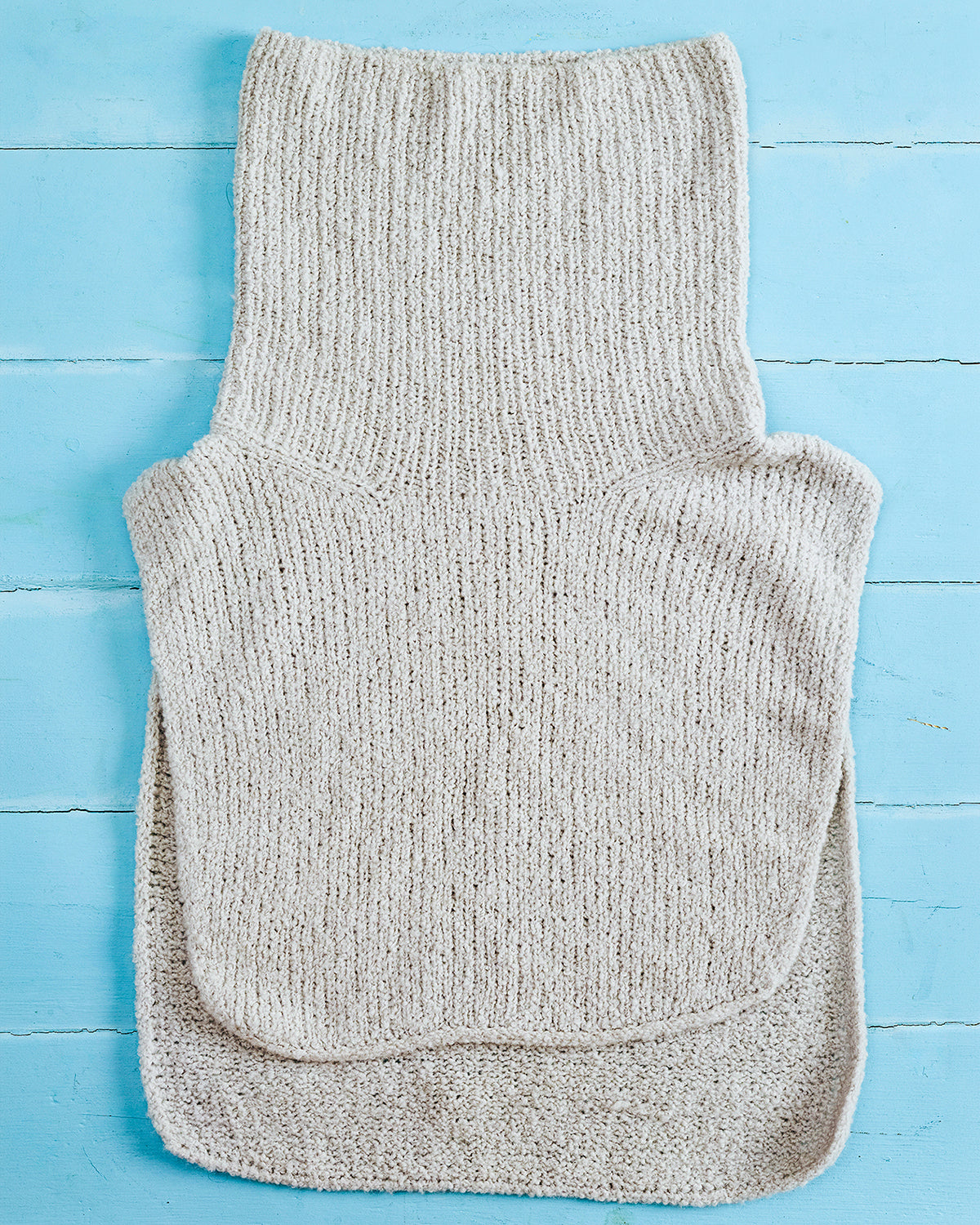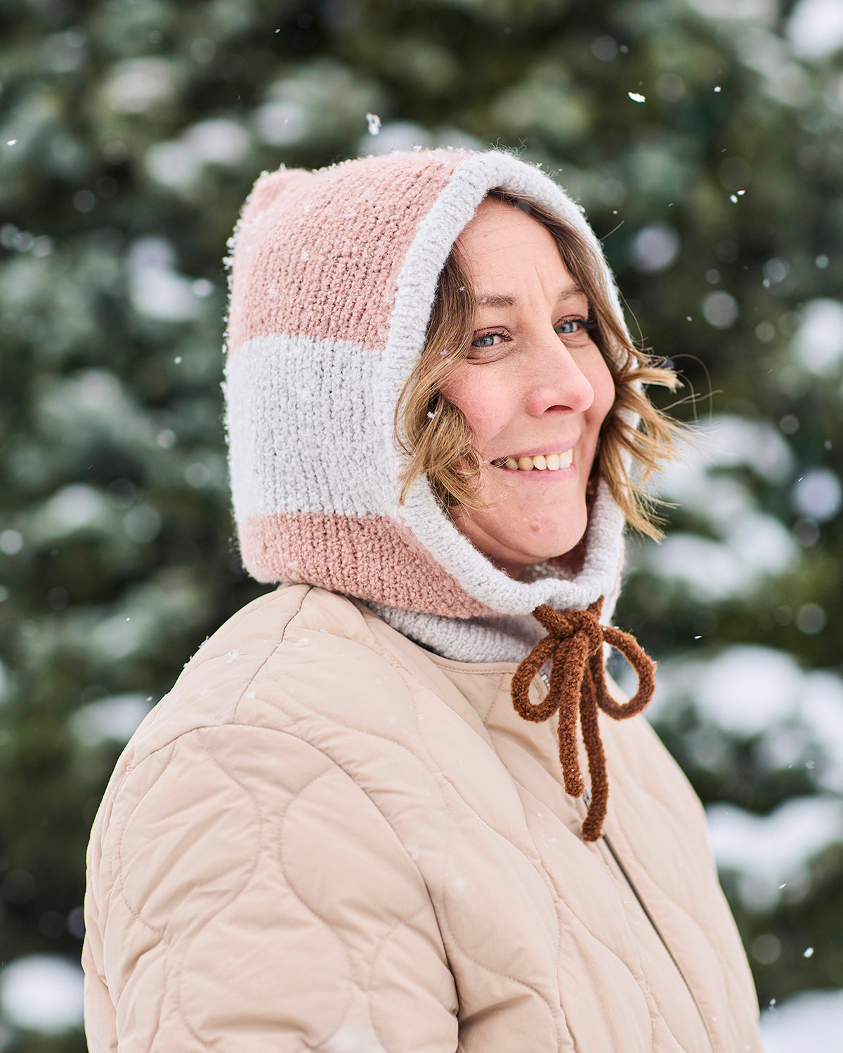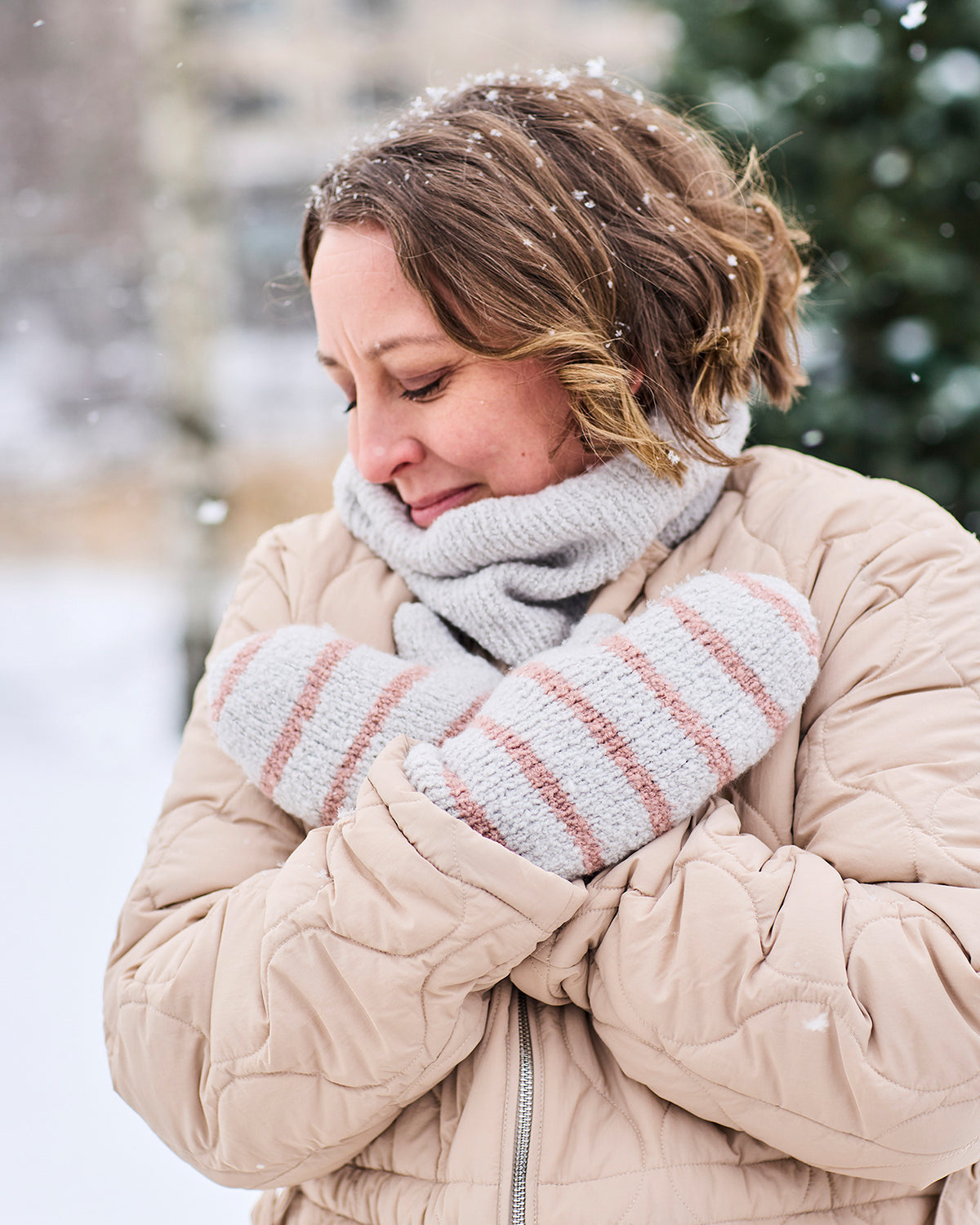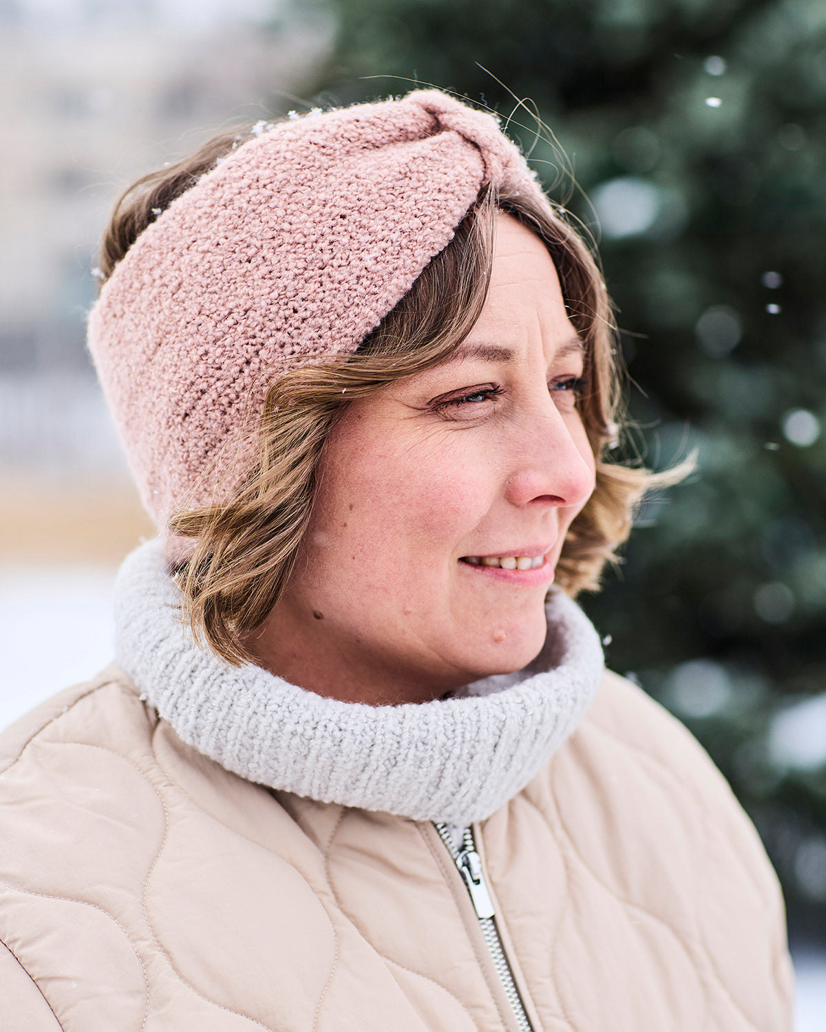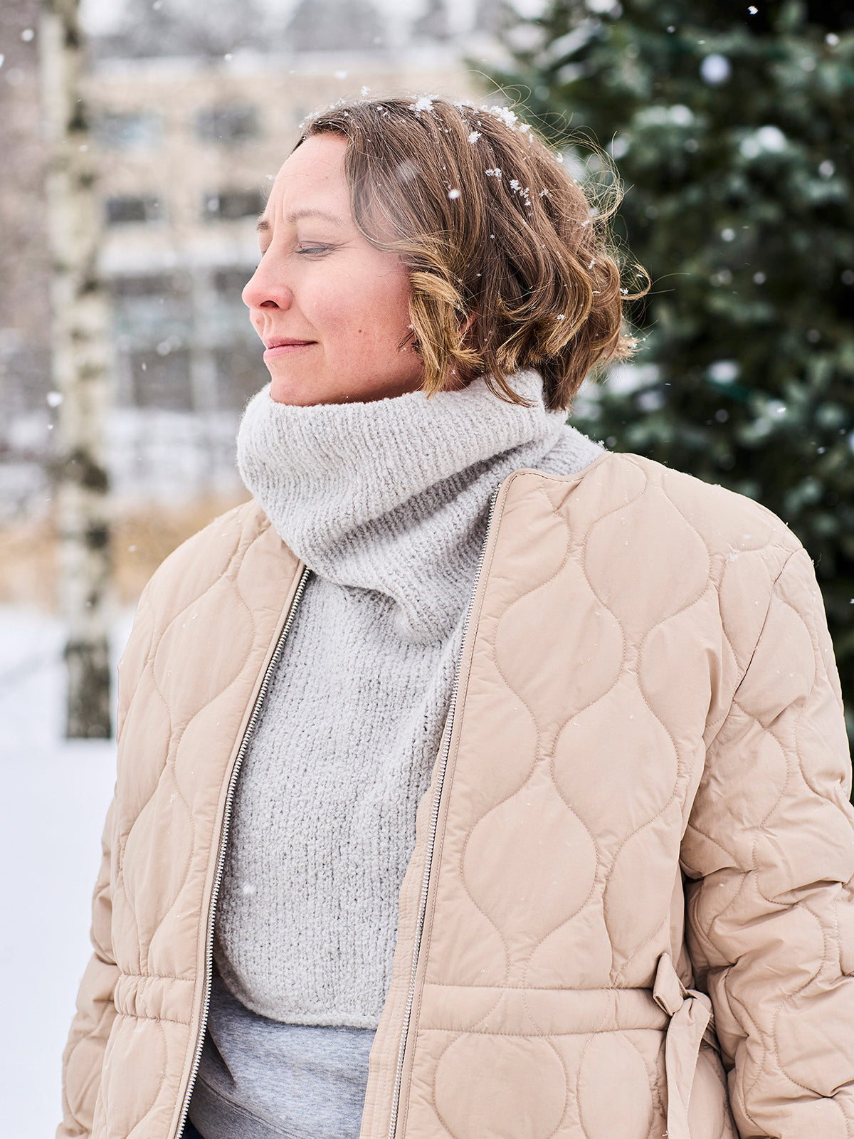 Kauluri neulotaan paksusta langasta. Kaksinkertainen kaulus antaa lämpöä, olkapään muotoilu istuvuutta.