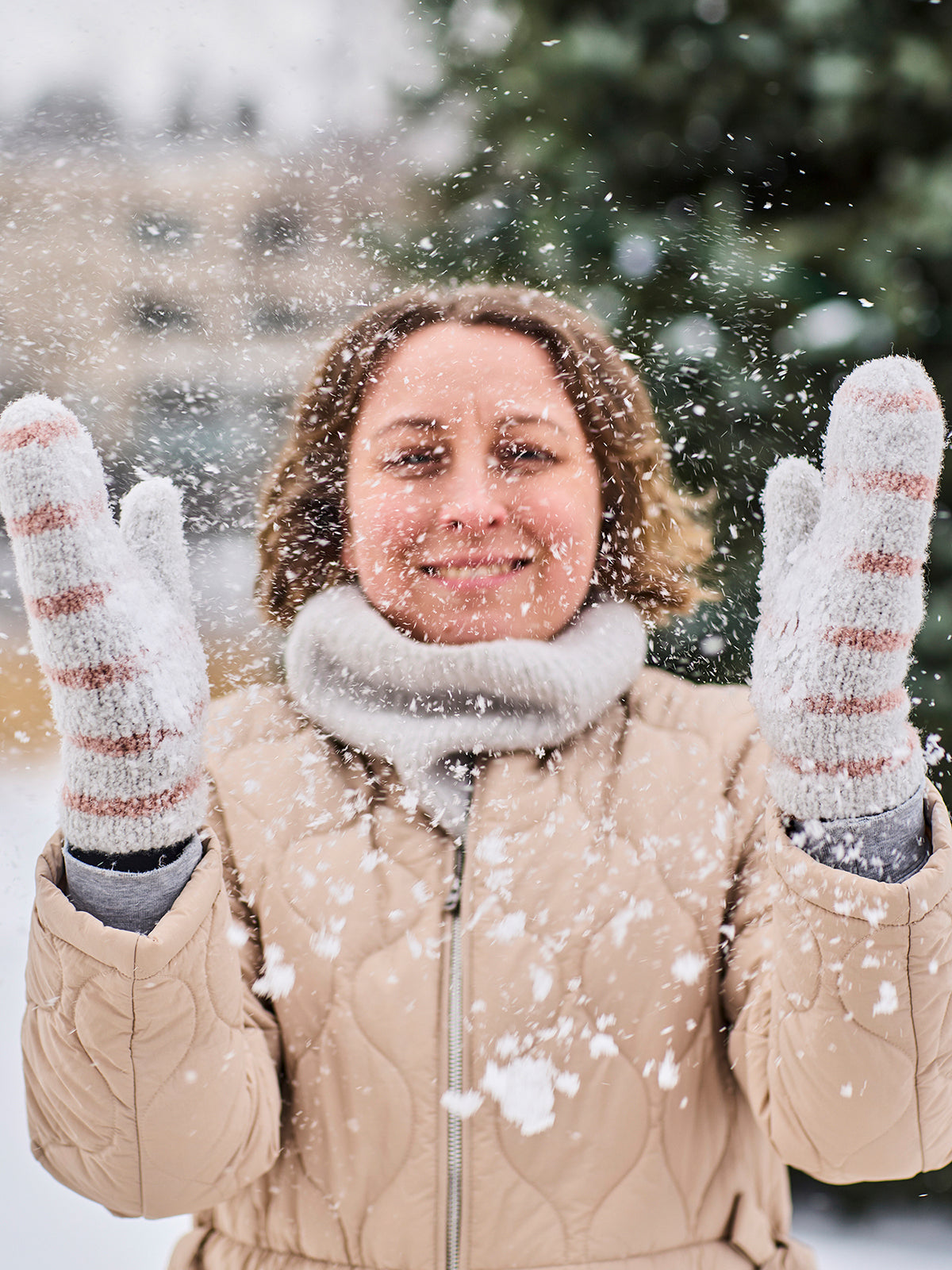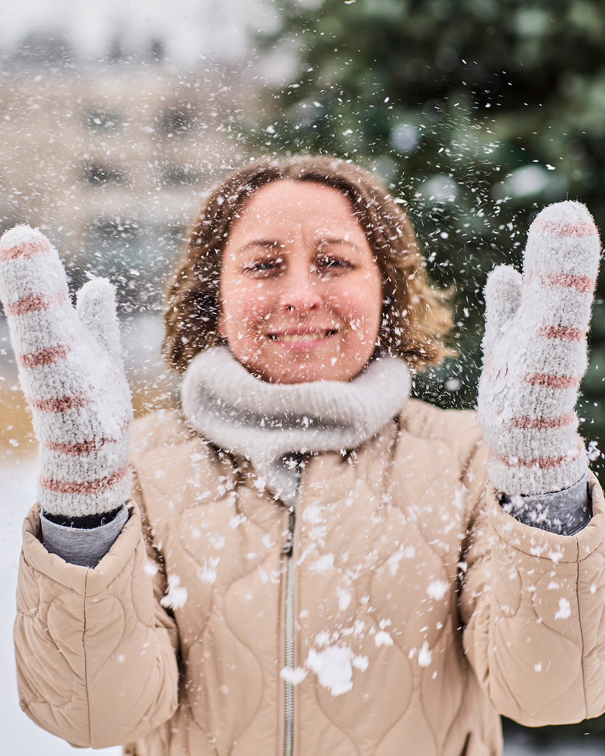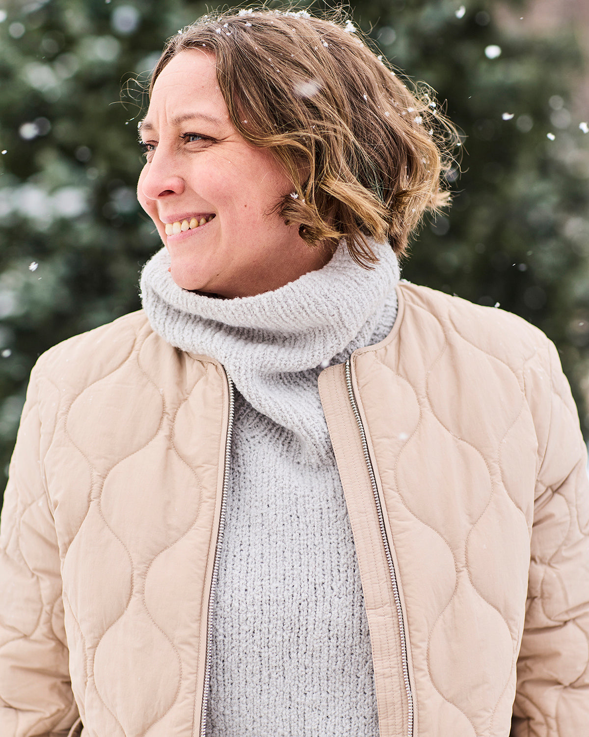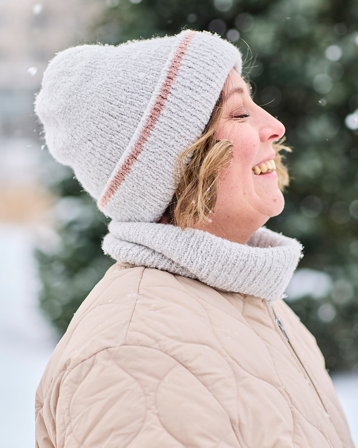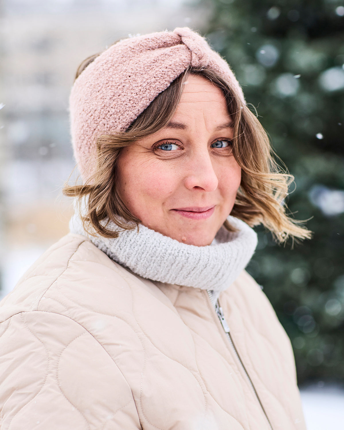 Kauluri neulotaan paksusta langasta. Kaksinkertainen kaulus antaa lämpöä, olkapään muotoilu istuvuutta.