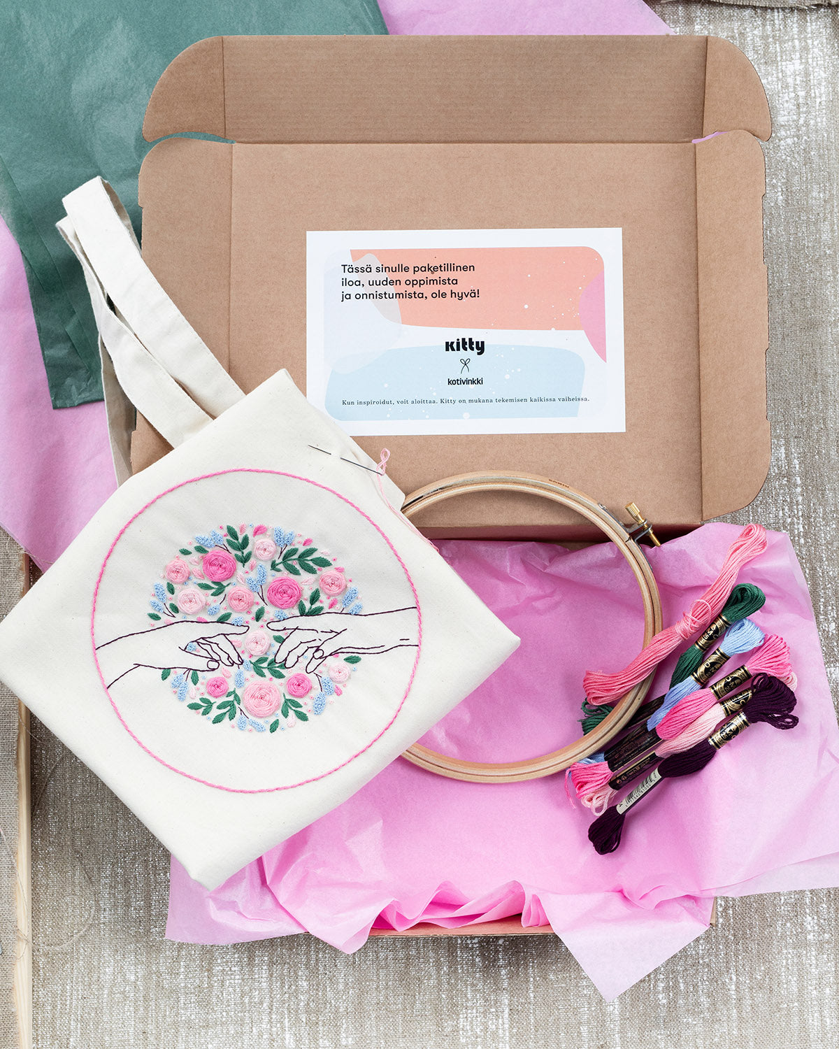 Kotivinkin Kitty-tarvikepaketista löydät kaikki materiaalit Anna Kilpeläisen suunnitteleman Yhteys-kuvion kirjontaan. Tarvikepaketti sisältää Reilun Kaupan ekokassin, kirjontalangat, -kehyksen, -neulan ja kuvallisen ohjevihon.