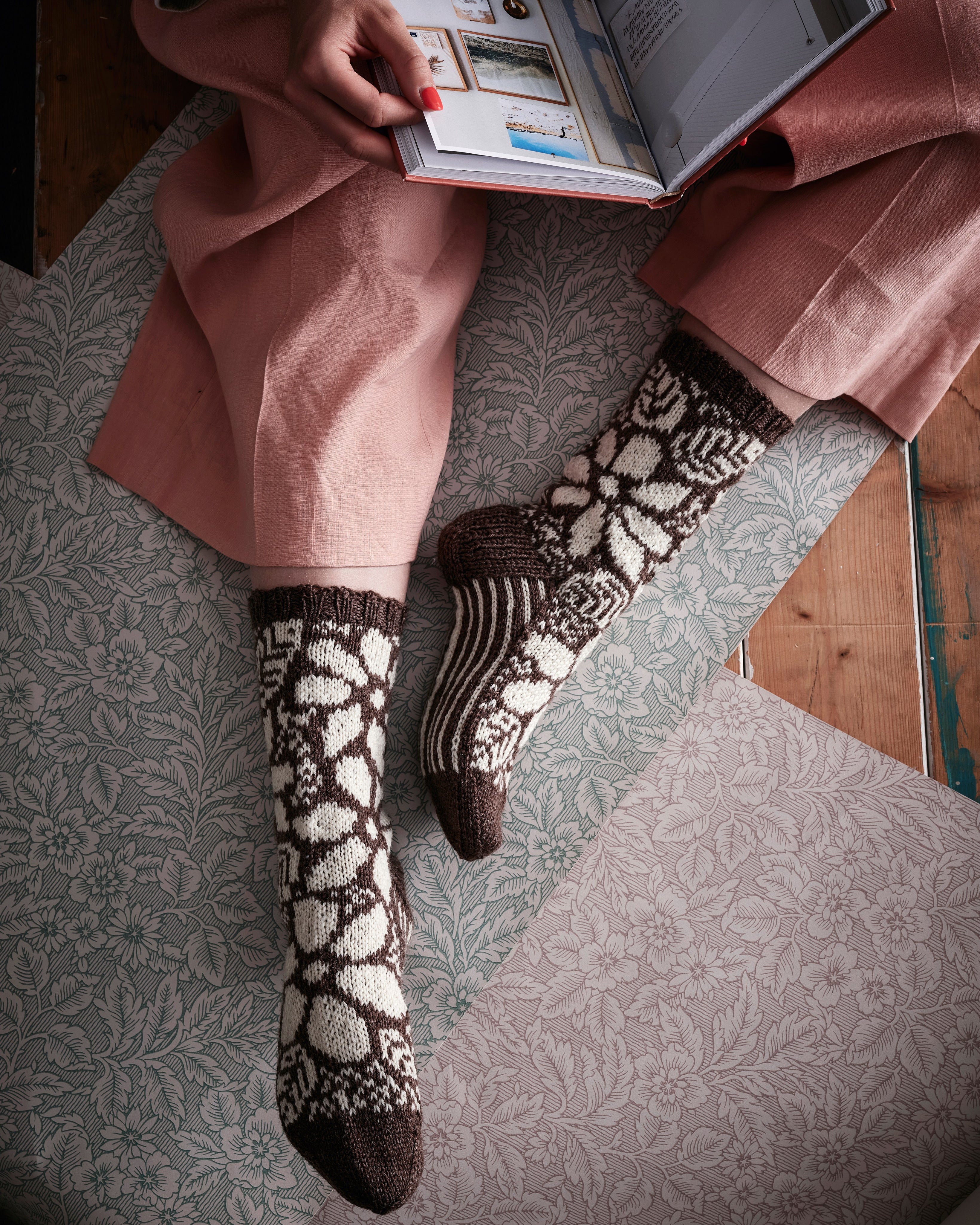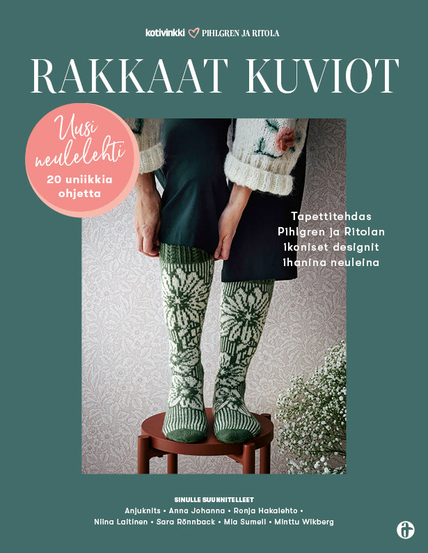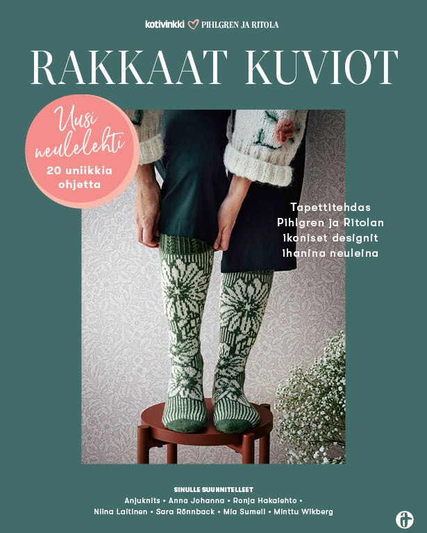 Yli satavuotiasta Tapettitehdas Pihlgren ja Ritolaa saa kiittää Suomen rakastetuimmista tapeteista. Ikoniset kuviot, kuten Kirsikkapuu, Kukot ja Kukkatarha näyttävät yhtä hurmaavilta niin seinälle tapetoituna kuin neuleohjeessakin – ja se, jos mikä, on laatudesignin merkki. Rakkaat kuviot & Pihlgren ja Ritola sisältää 20 neuleohjetta kotimaisilta huippusuunnittelijoilta.