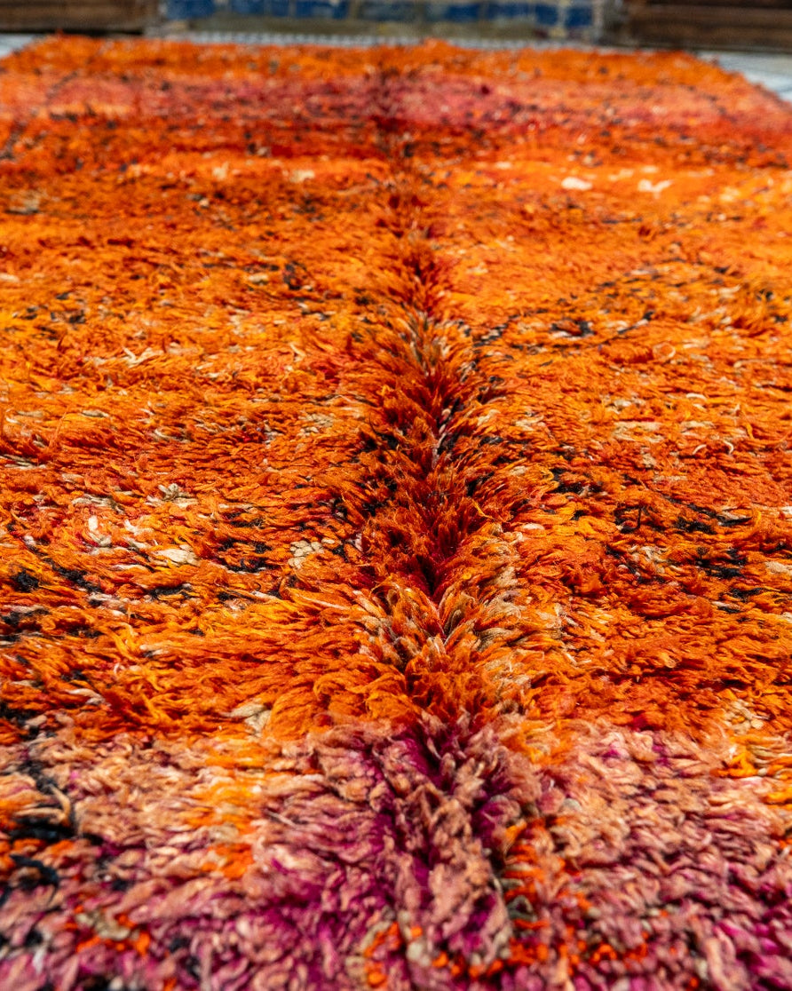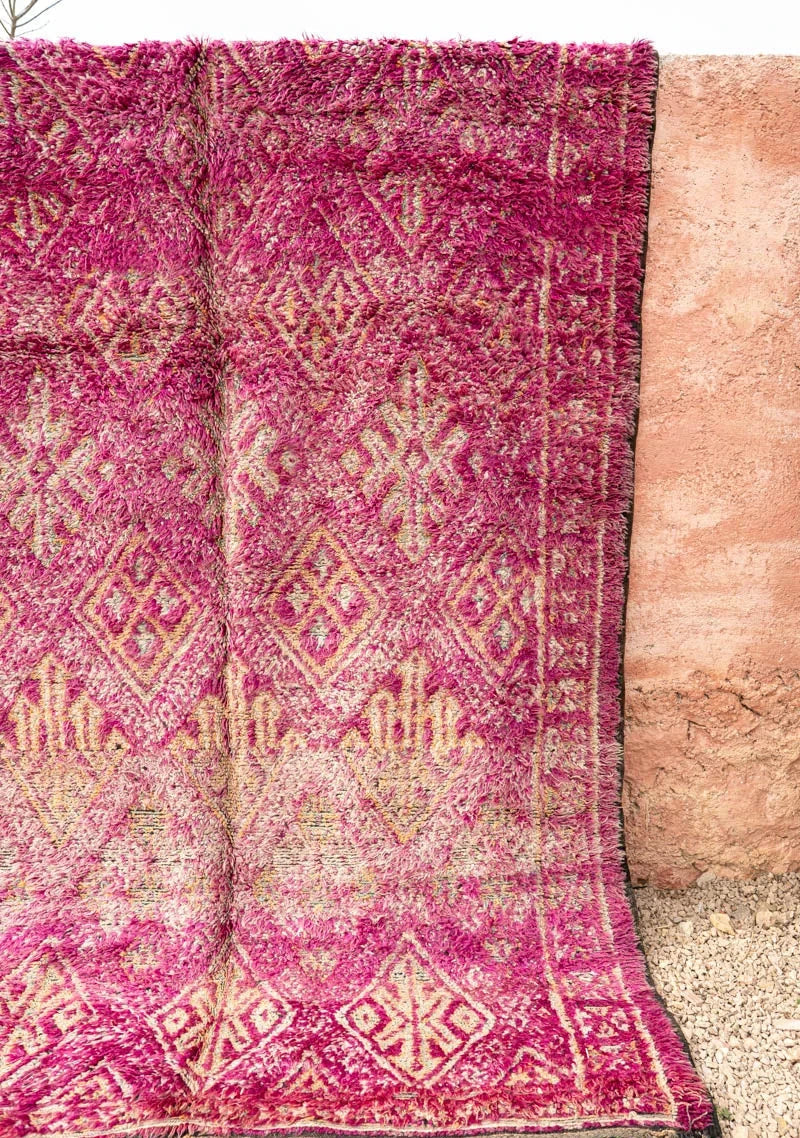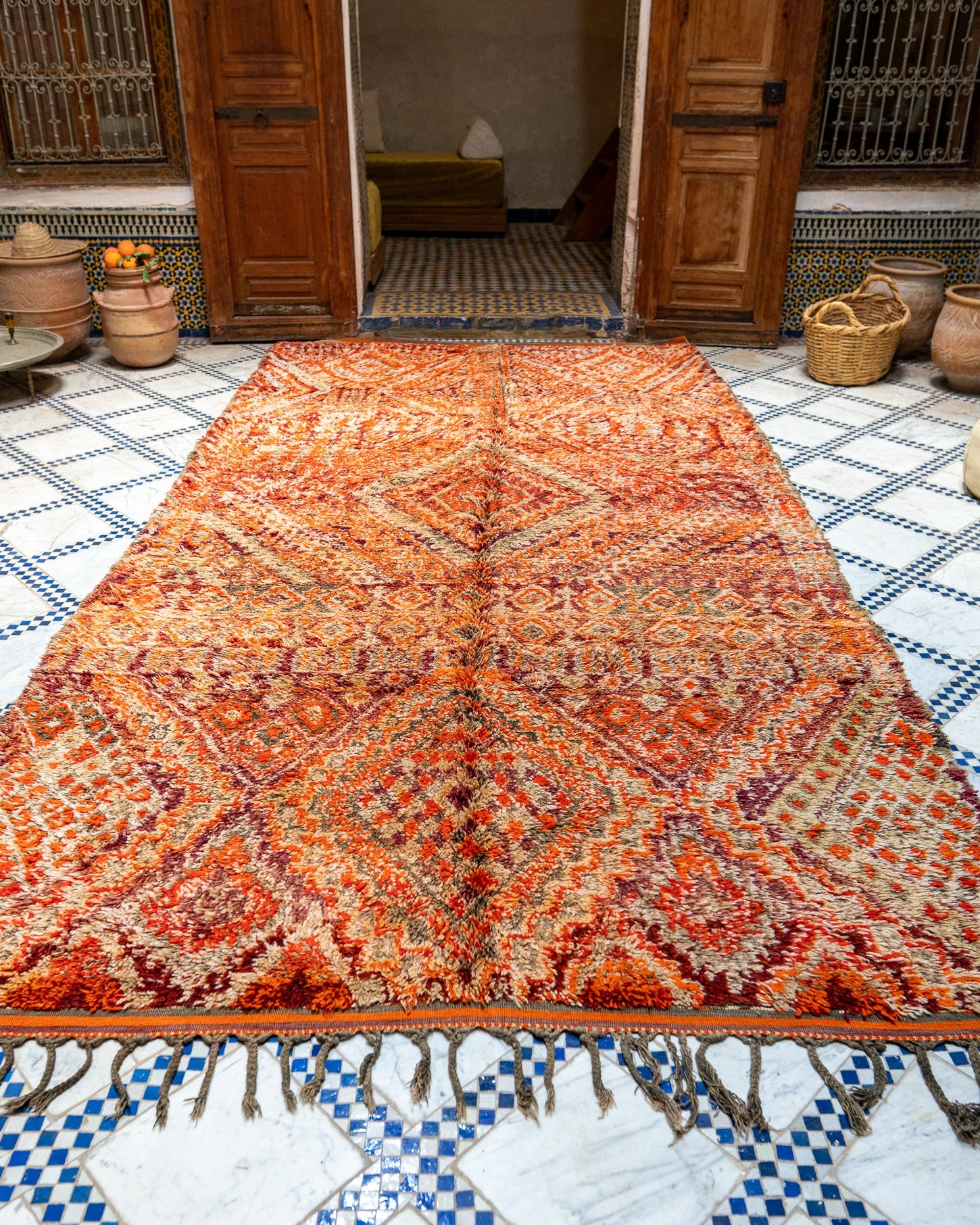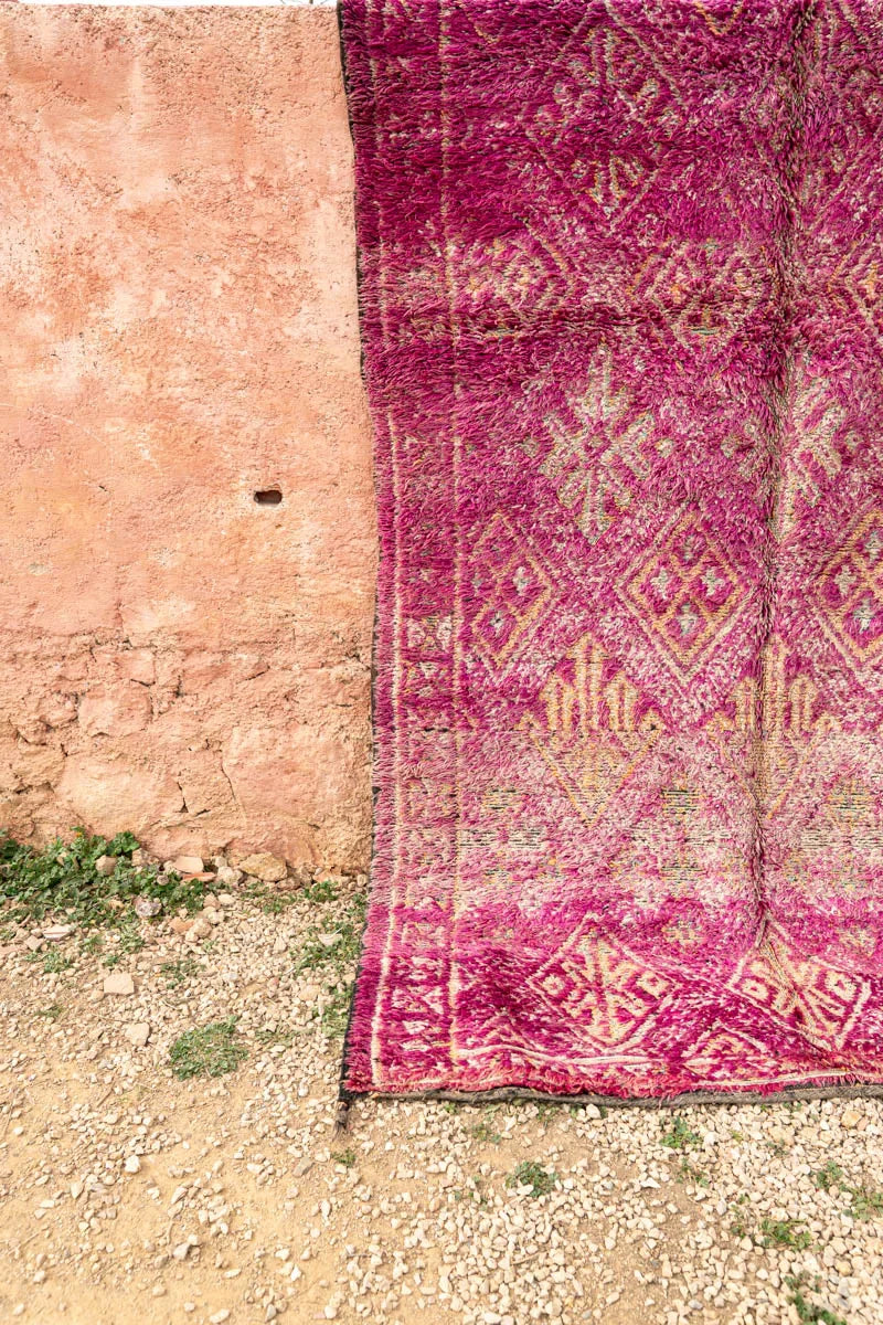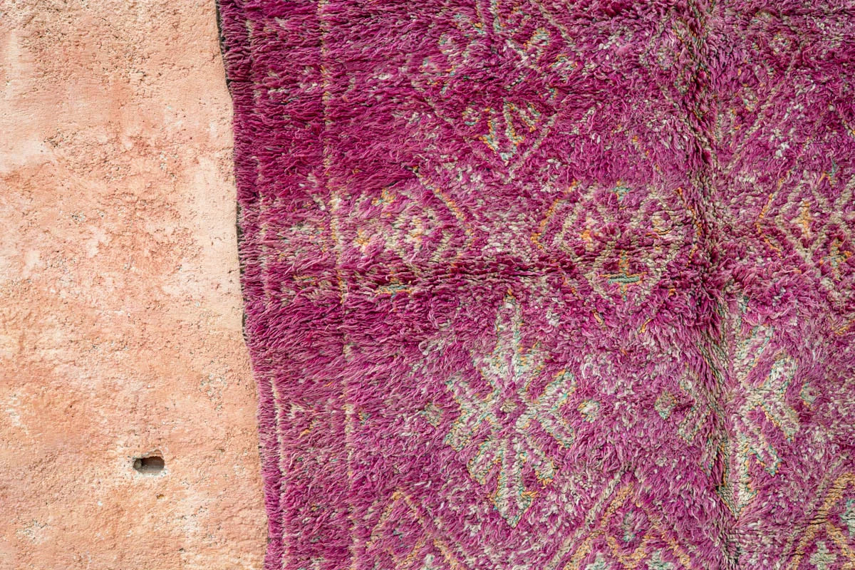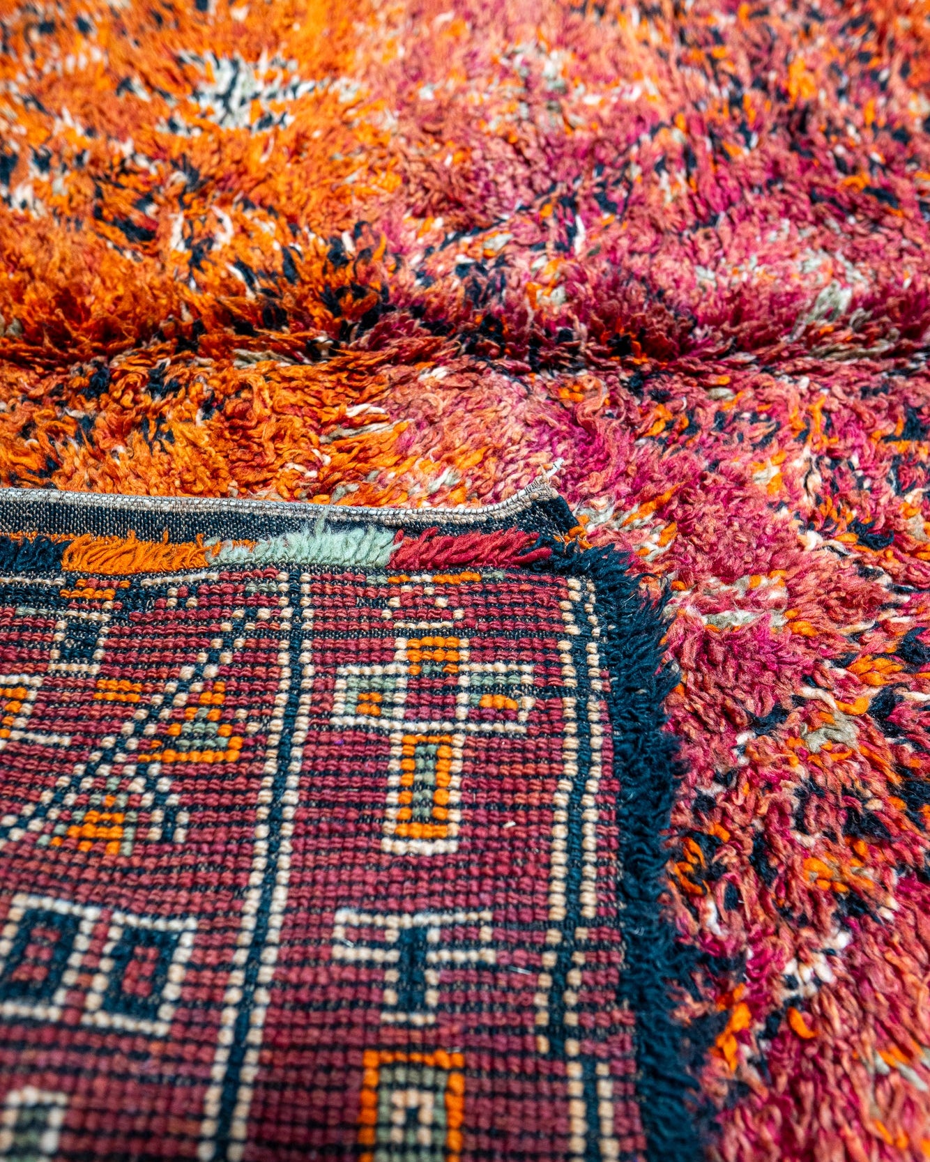 Keski-Atlaksen alueella valmistetut Beni M’Guild -heimon matot ovat tunnettuja korkeasta laadusta sekä intensiivisestä värityksestään. Tämäkin paksu ja jämäkkä yksilö hurmaa pinkin, oranssin ja beigen sävyillä. Staycation-matto on kaksi metriä leveä ja kolme metriä pitkä, ja sen arvioitu ikä on yli 30 vuotta.