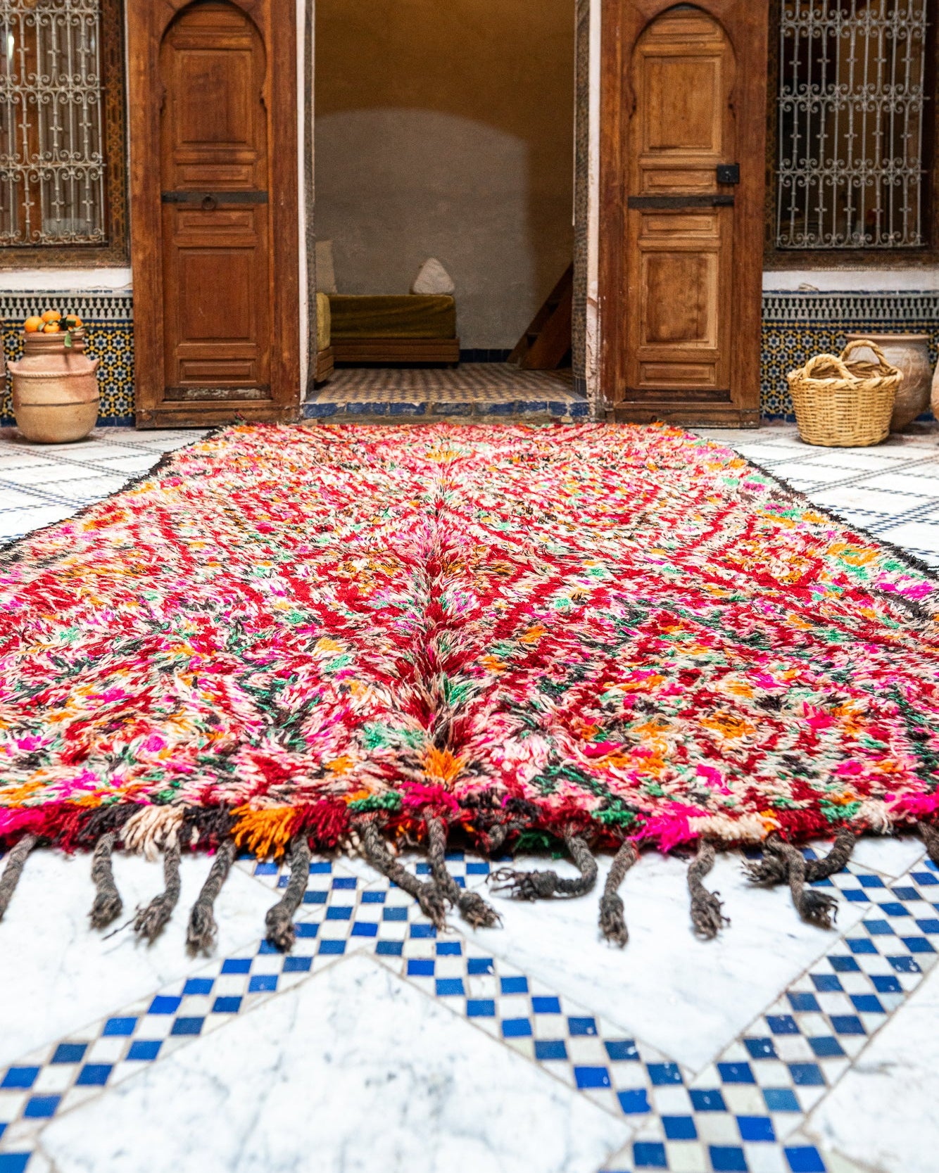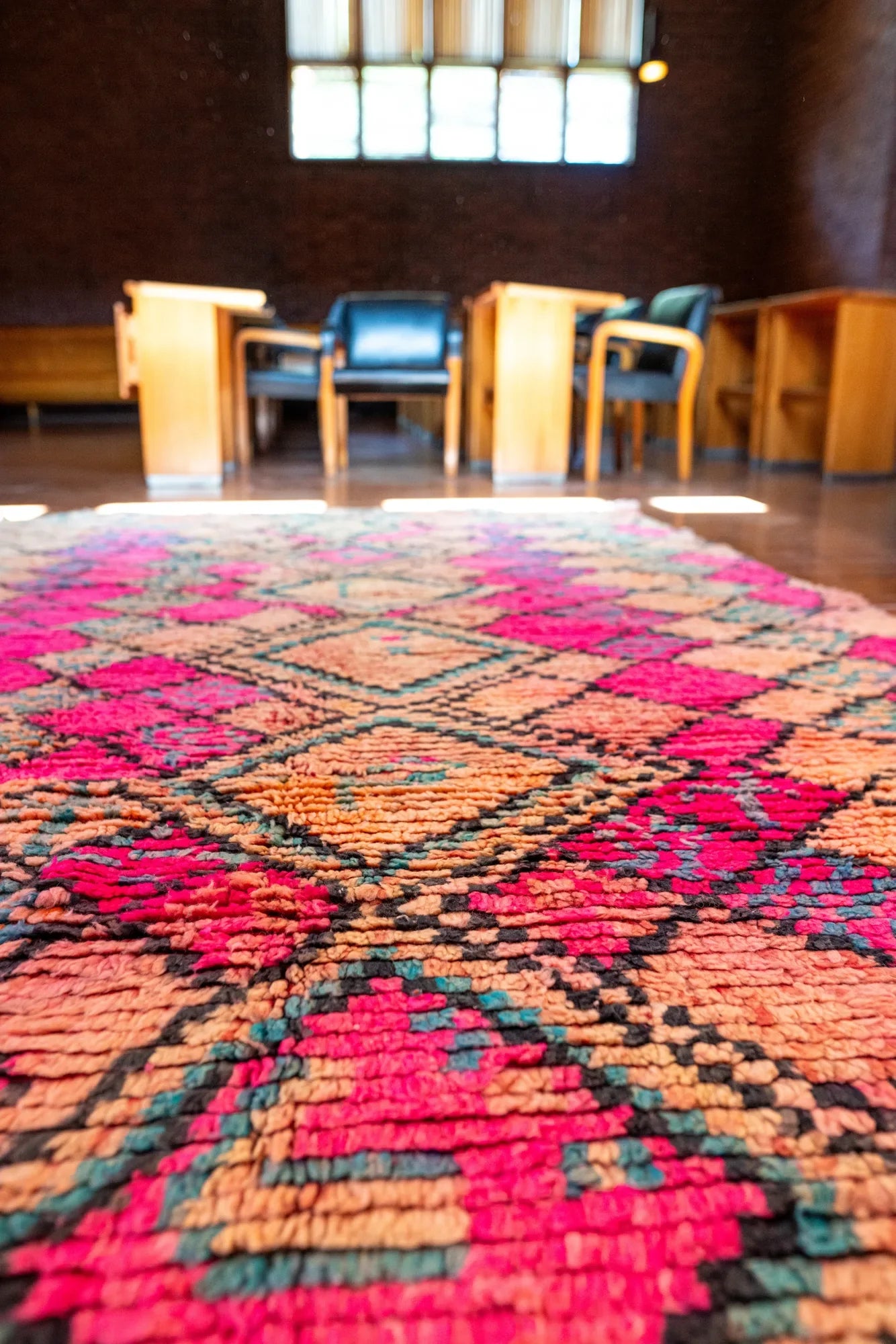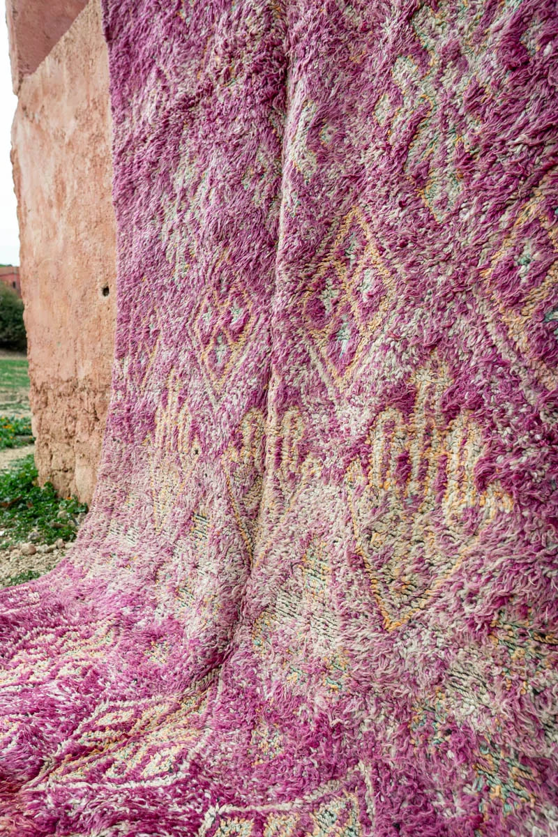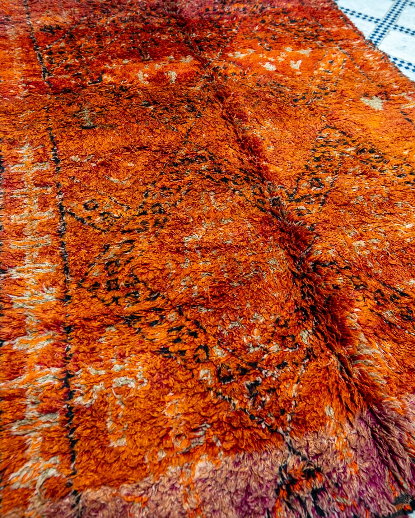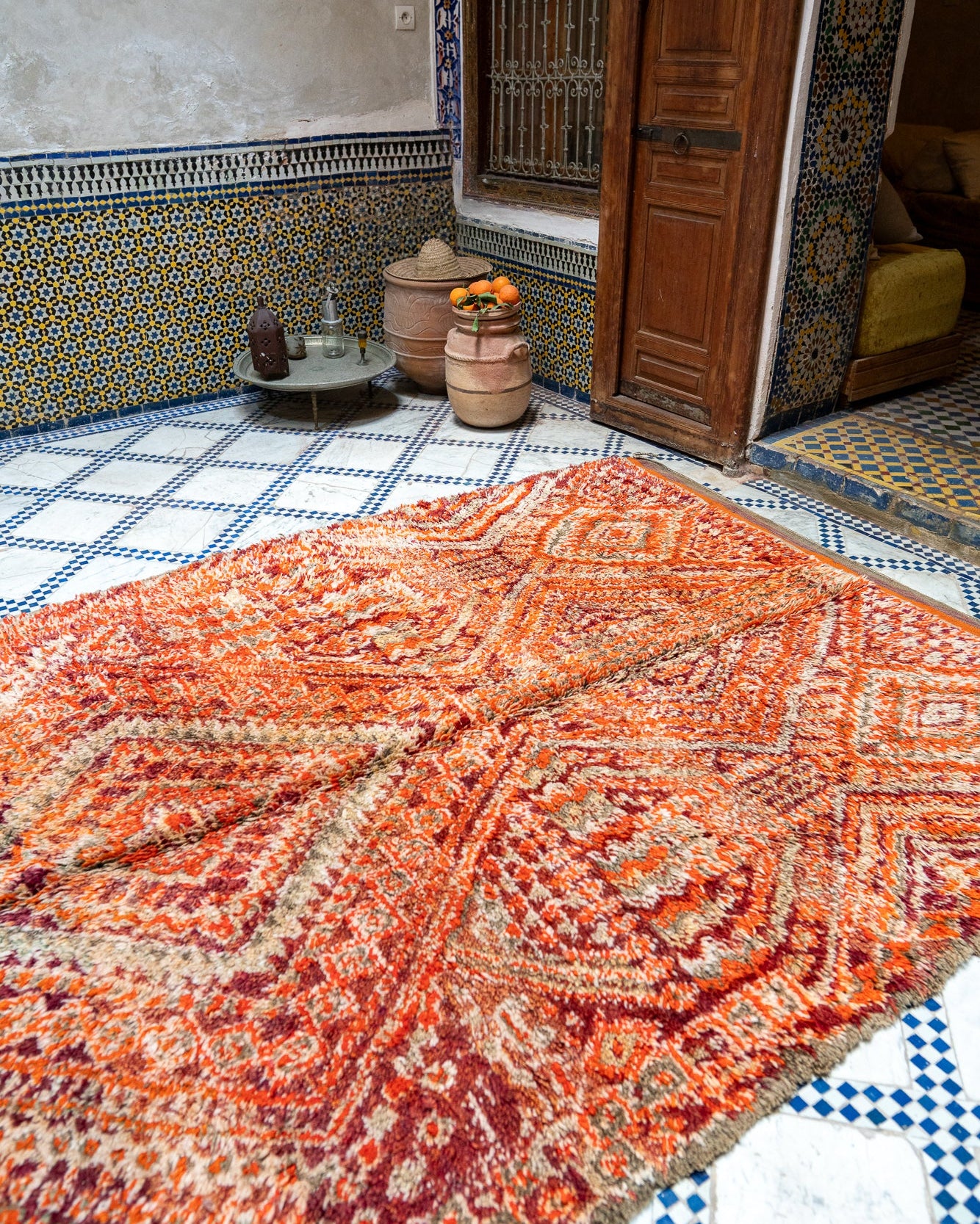 Keski-Atlaksen alueella valmistetut Beni M’Guild -heimon matot ovat tunnettuja korkeasta laadusta sekä intensiivisestä värityksestään. Tämäkin paksu ja jämäkkä yksilö hurmaa pinkin, oranssin ja beigen sävyillä. Staycation-matto on kaksi metriä leveä ja kolme metriä pitkä, ja sen arvioitu ikä on yli 30 vuotta.