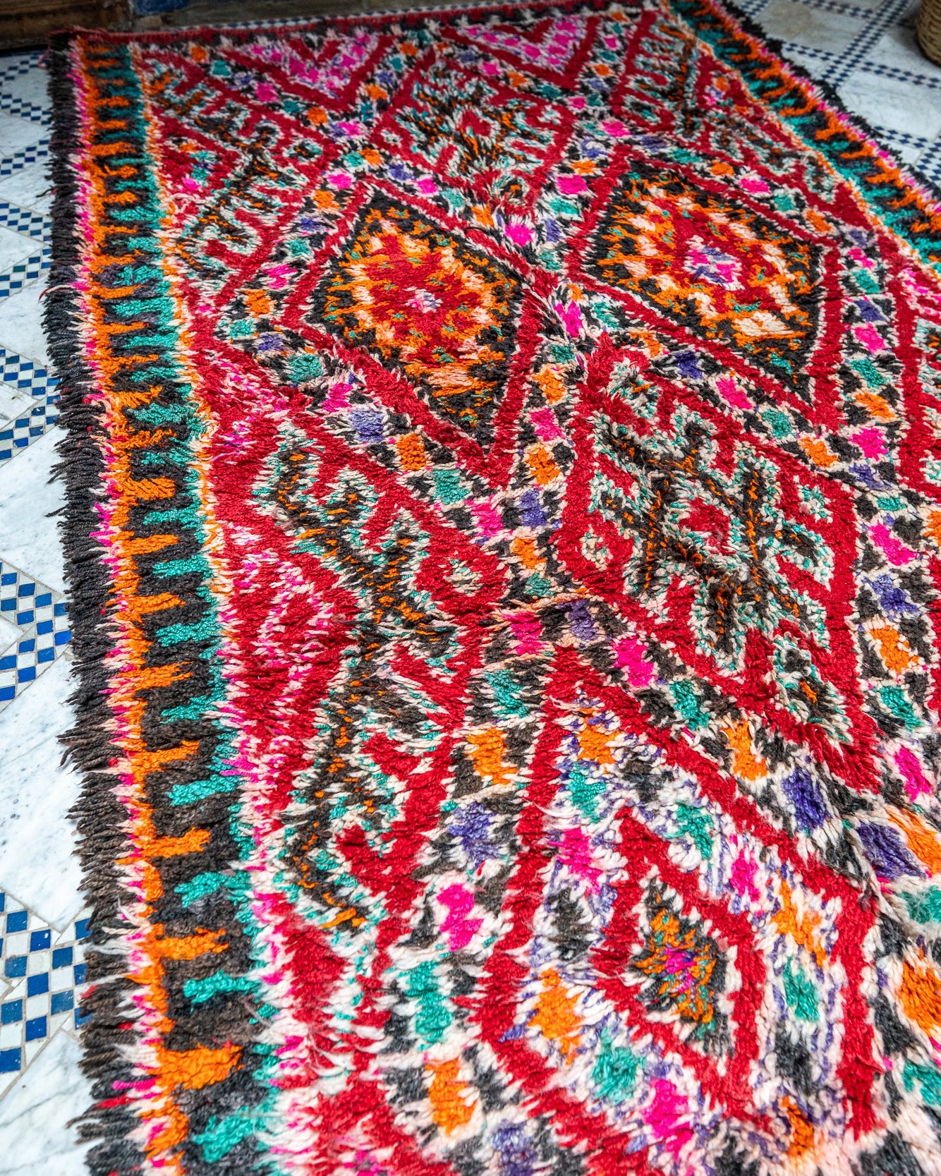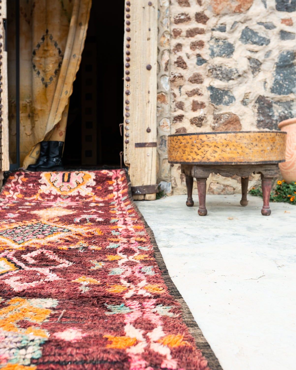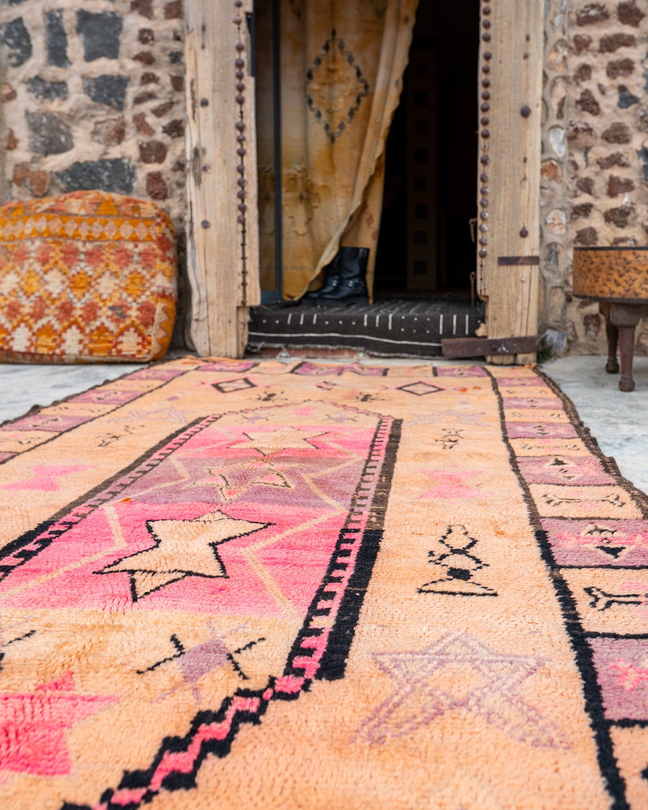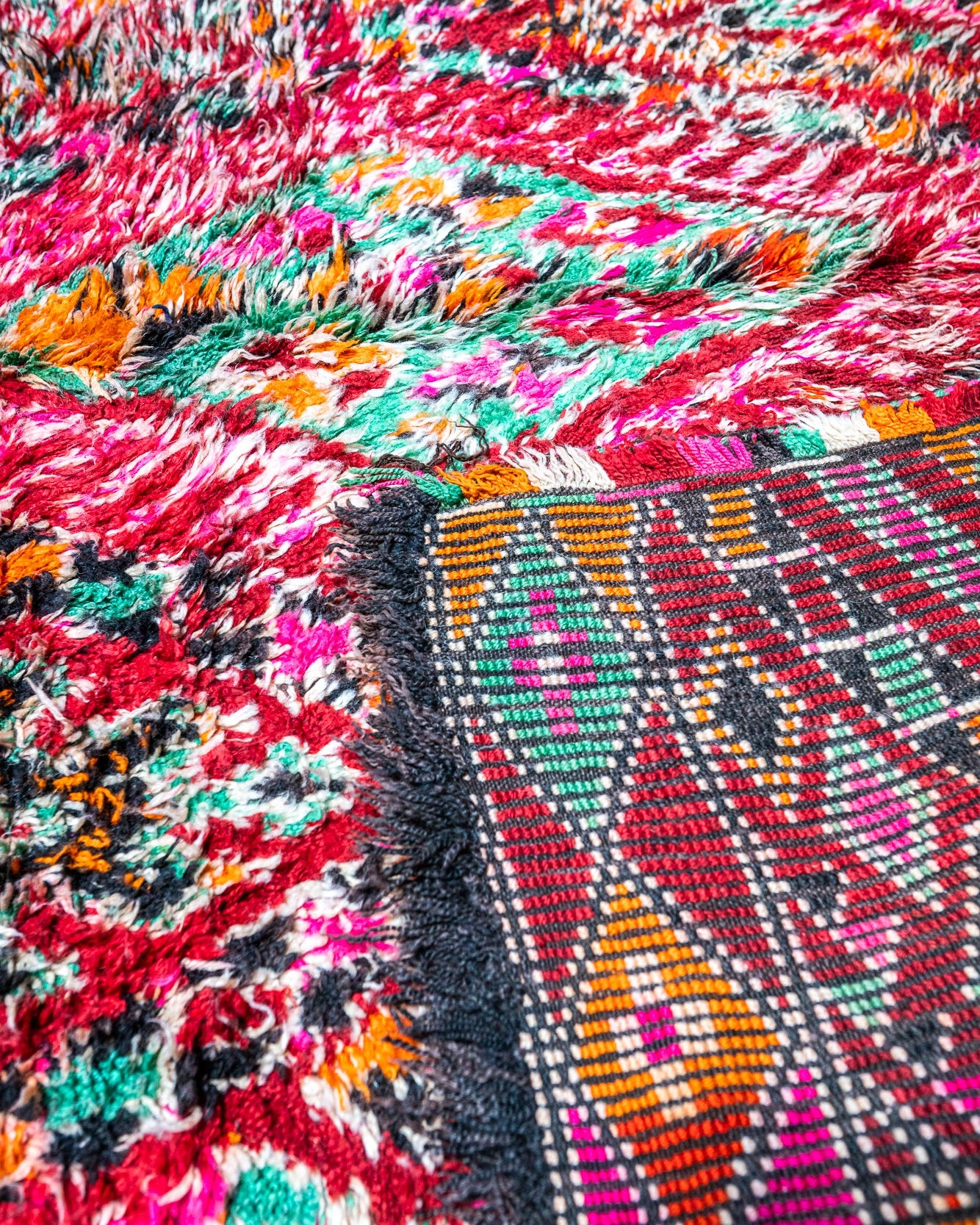 Keski-Atlaksen alueella valmistetut Beni M’Guild -heimon matot ovat tunnettuja korkeasta laadusta sekä intensiivisestä värityksestään. Tämäkin paksu ja jämäkkä yksilö hurmaa pinkin, oranssin ja beigen sävyillä. Staycation-matto on kaksi metriä leveä ja kolme metriä pitkä, ja sen arvioitu ikä on yli 30 vuotta.