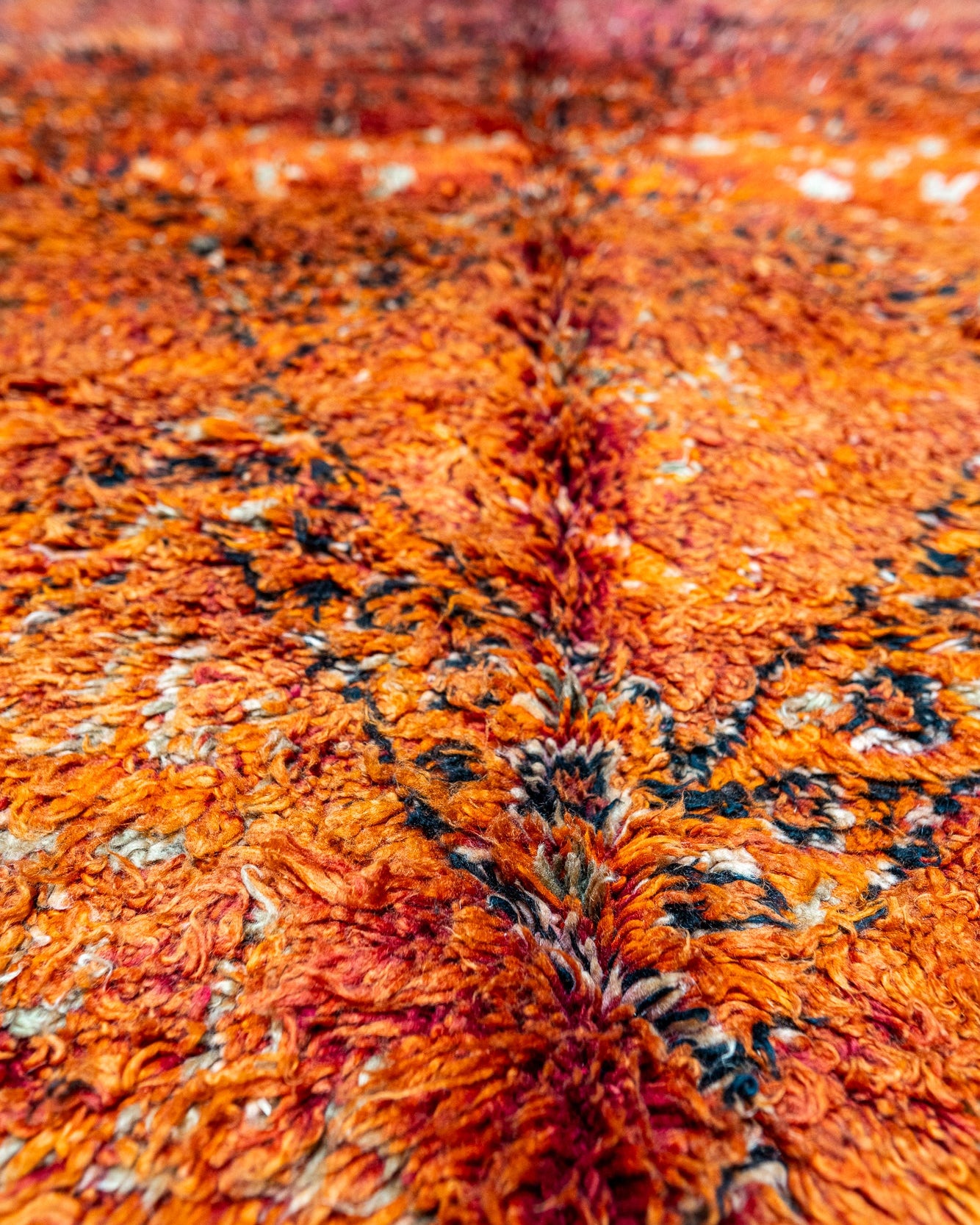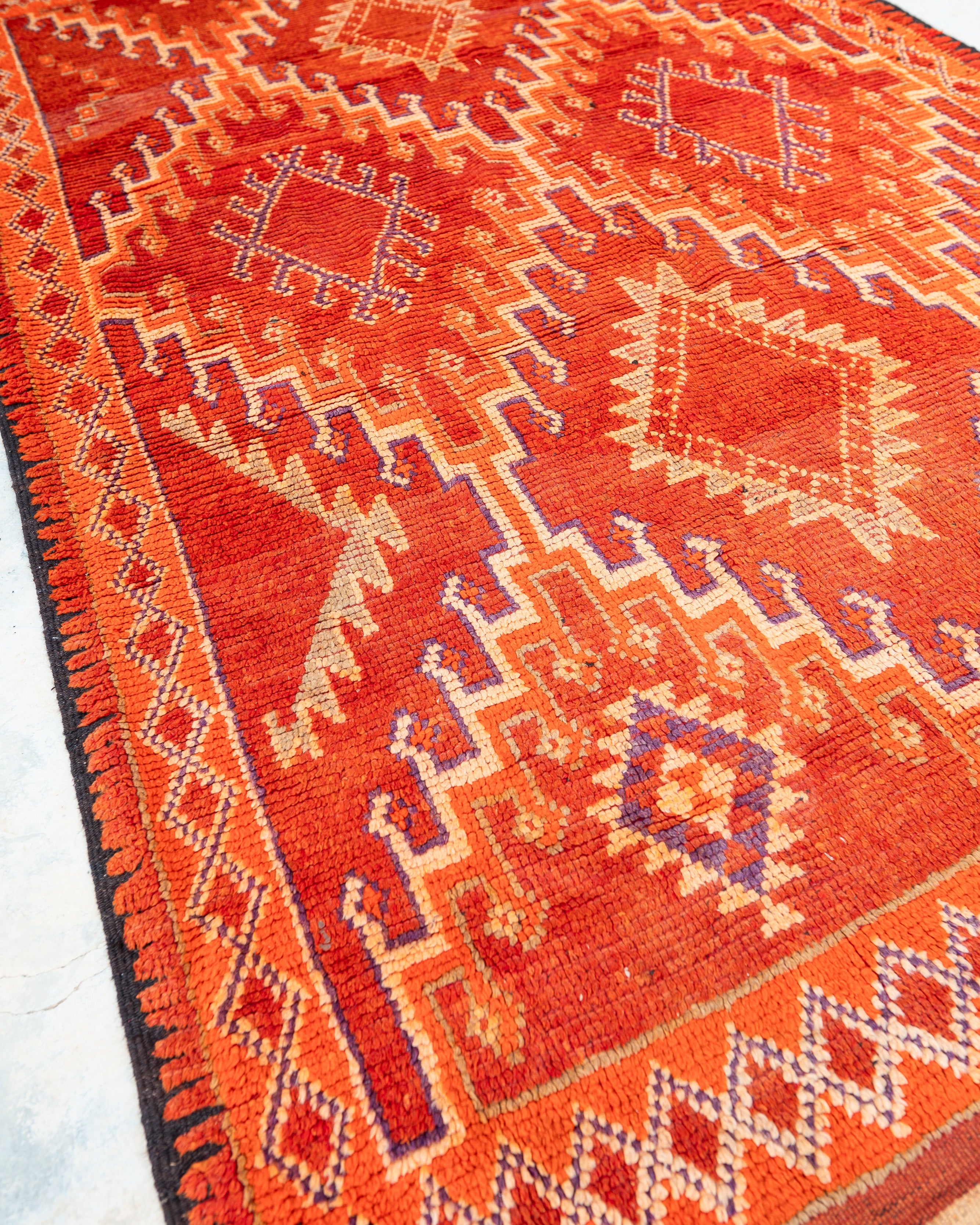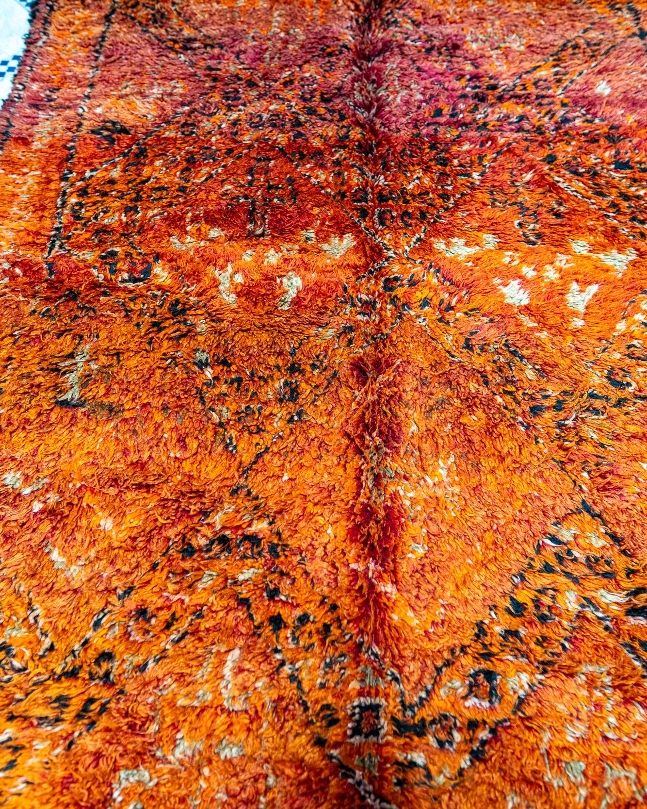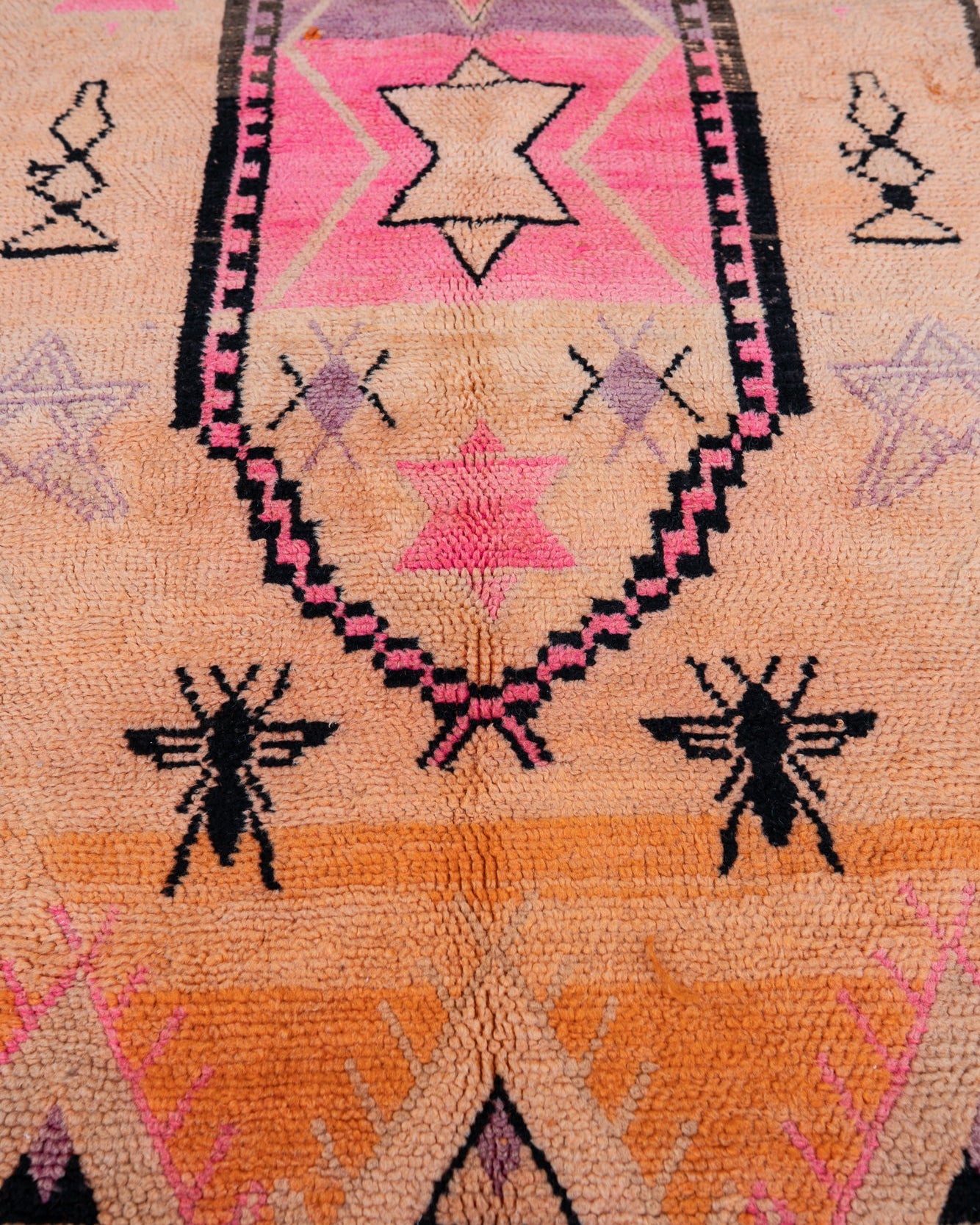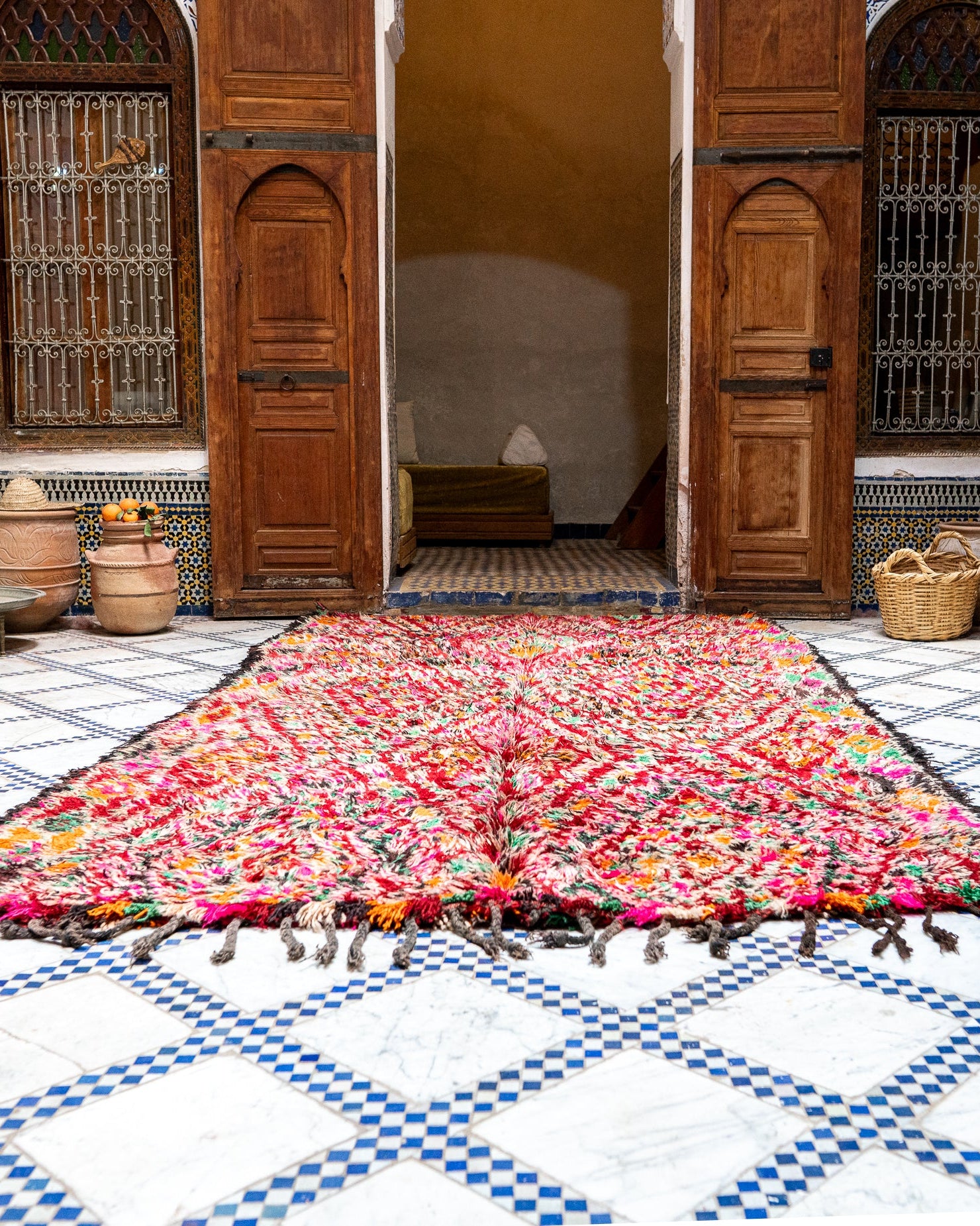 Keski-Atlaksen alueella valmistetut Beni M’Guild -heimon matot ovat tunnettuja korkeasta laadusta sekä intensiivisestä värityksestään. Tämäkin paksu ja jämäkkä yksilö hurmaa pinkin, oranssin ja beigen sävyillä. Staycation-matto on kaksi metriä leveä ja kolme metriä pitkä, ja sen arvioitu ikä on yli 30 vuotta.
