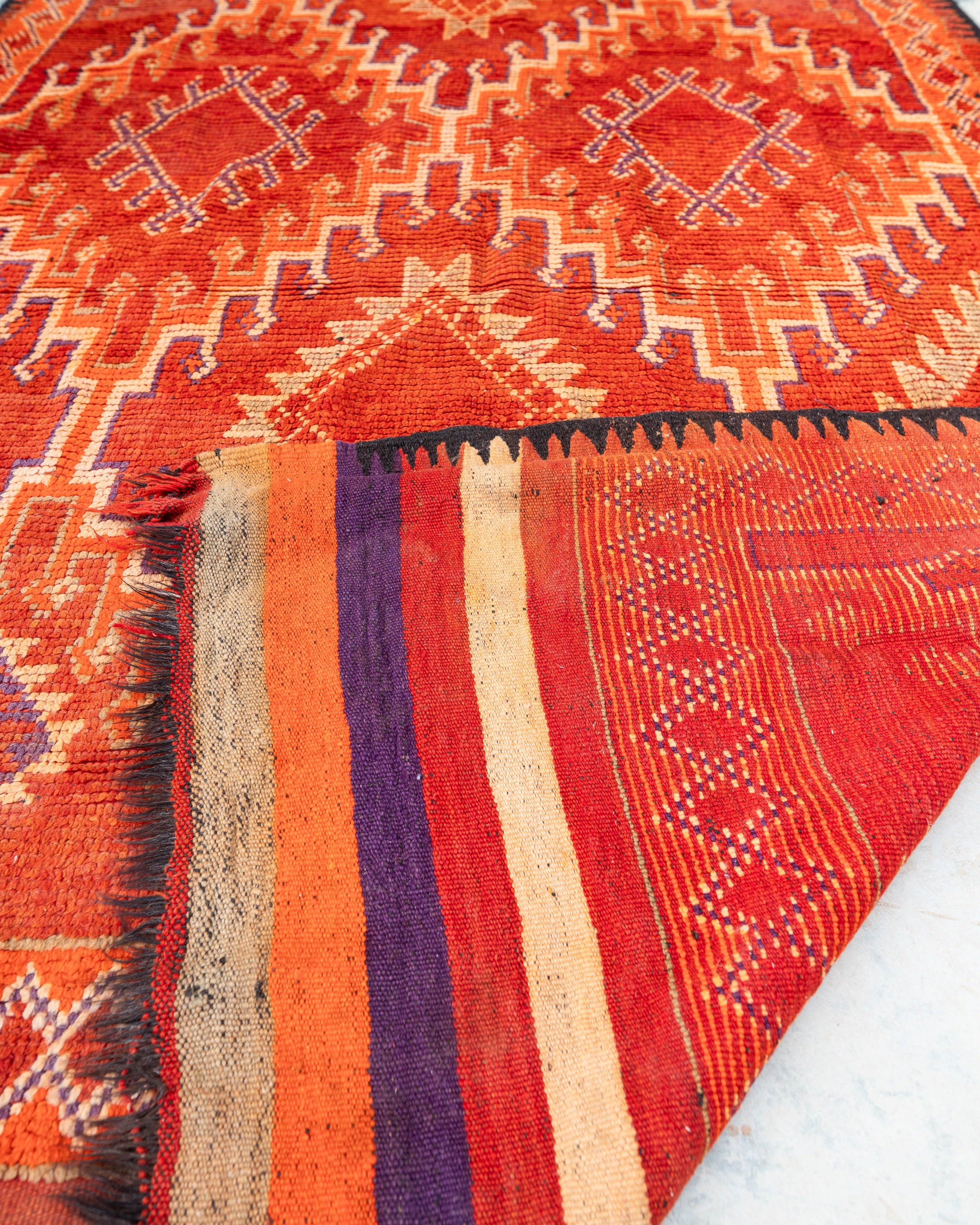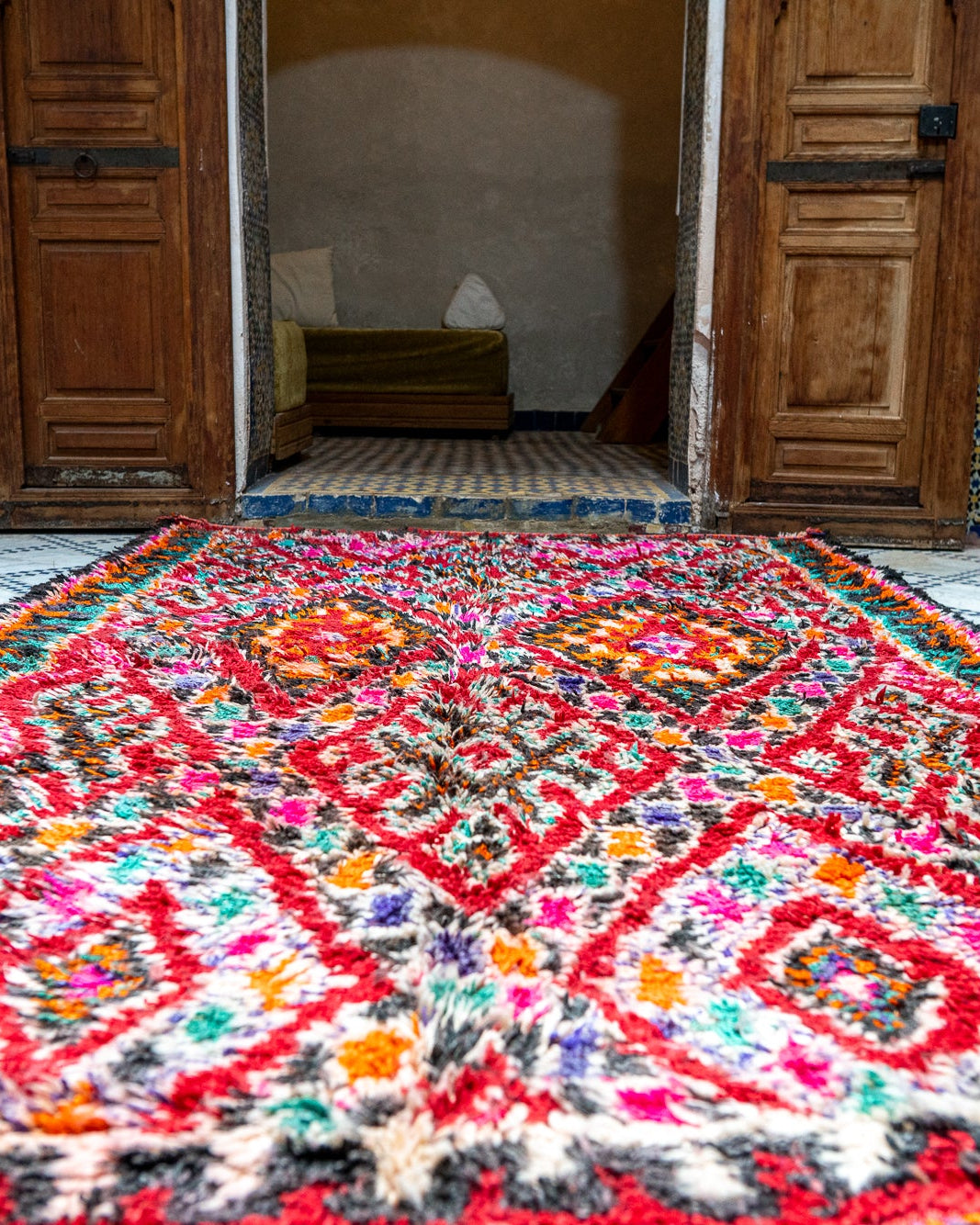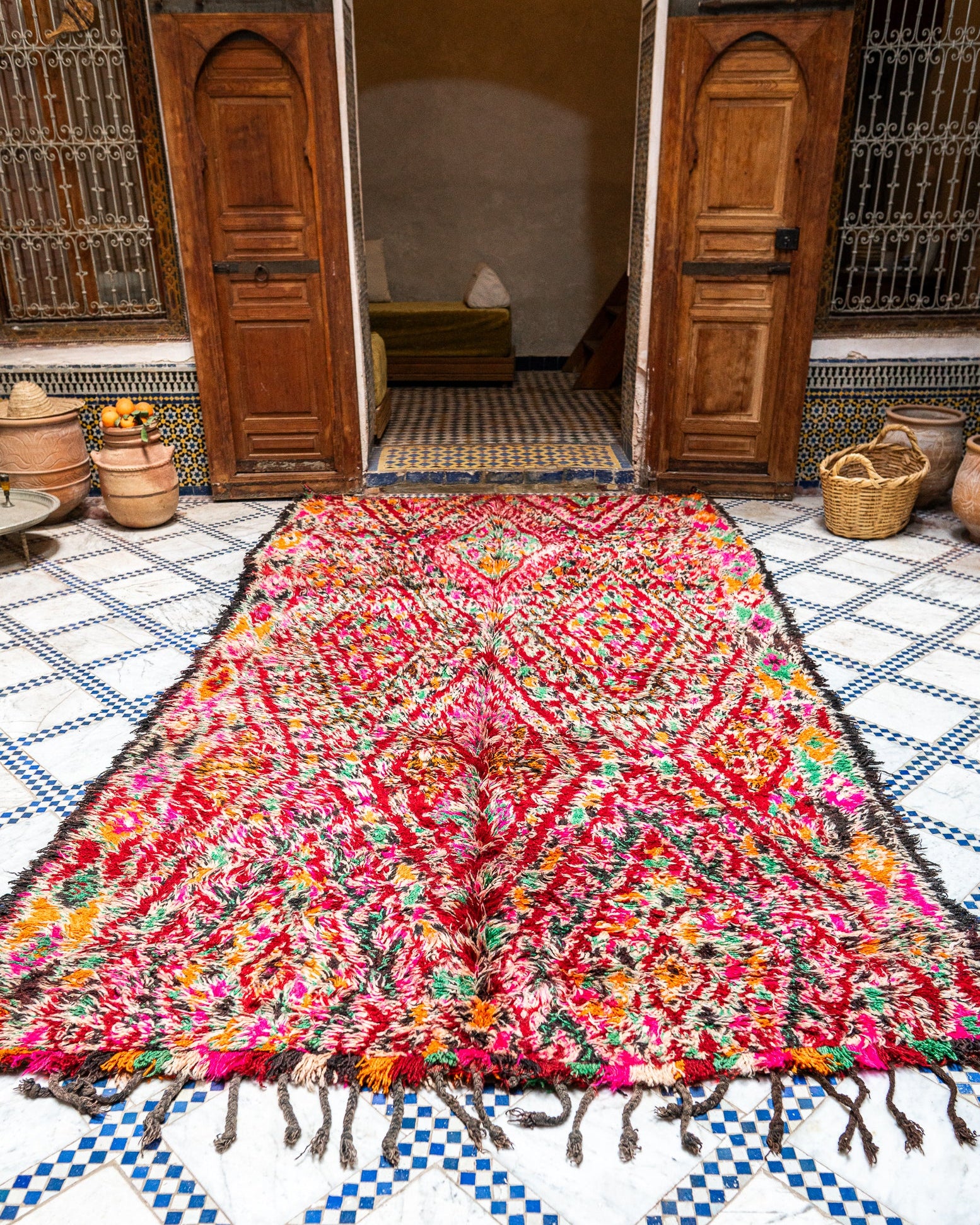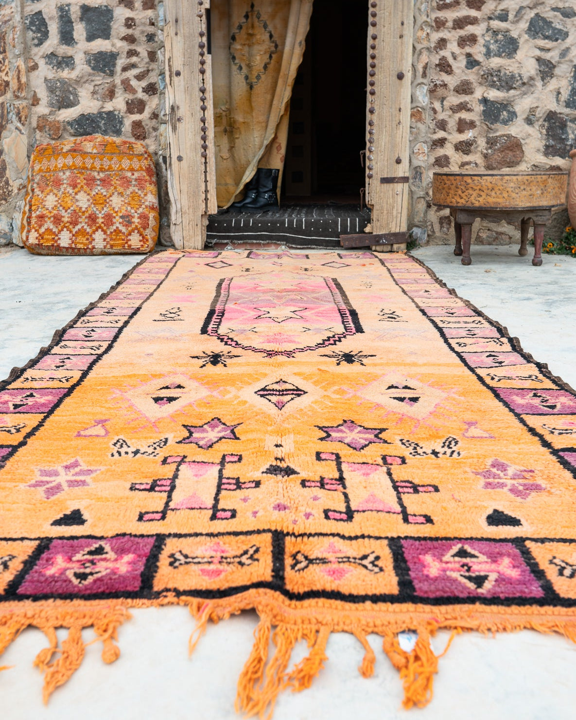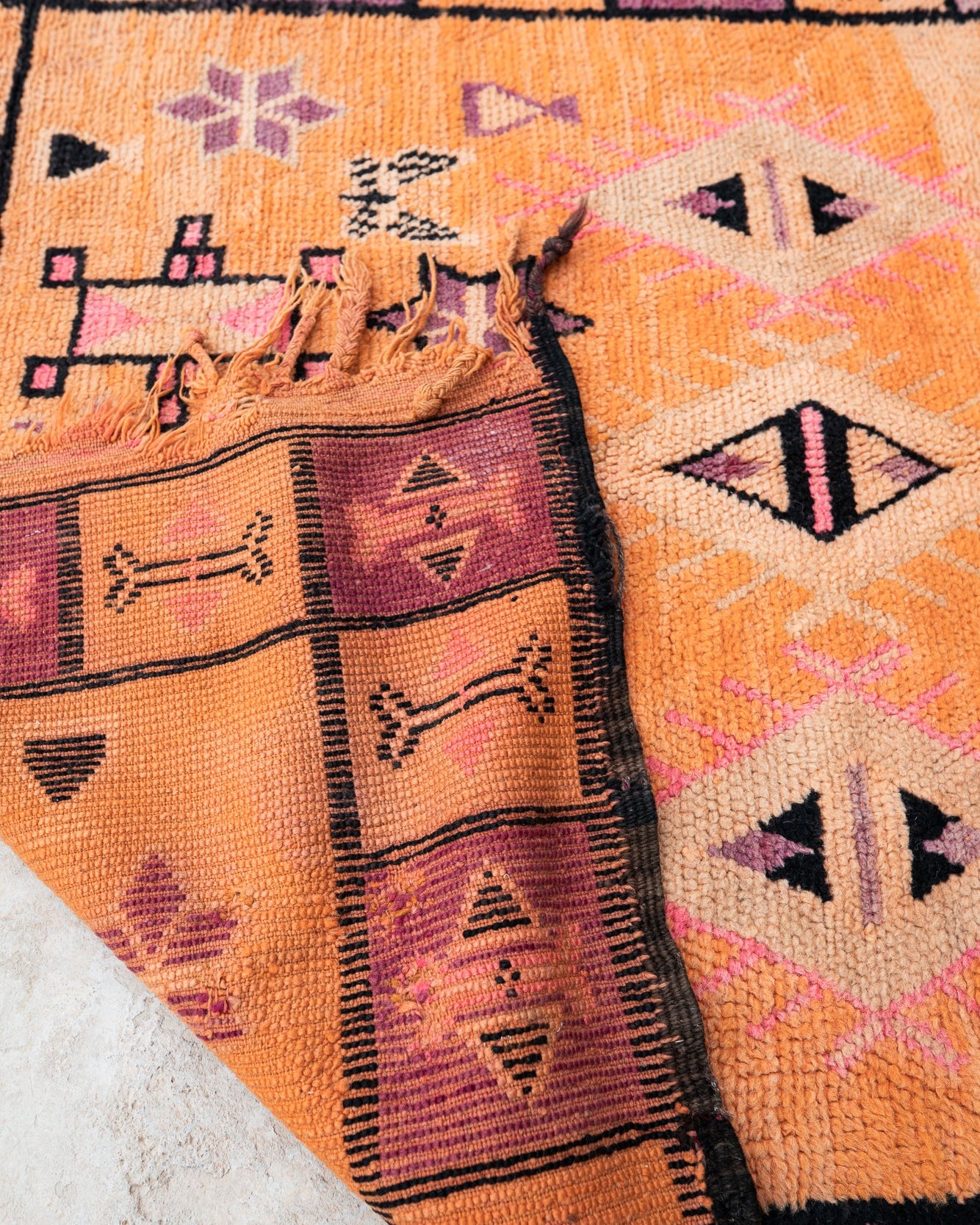 Keski-Atlaksen alueella valmistetut Beni M’Guild -heimon matot ovat tunnettuja korkeasta laadusta sekä intensiivisestä värityksestään. Tämäkin paksu ja jämäkkä yksilö hurmaa pinkin, oranssin ja beigen sävyillä. Staycation-matto on kaksi metriä leveä ja kolme metriä pitkä, ja sen arvioitu ikä on yli 30 vuotta.