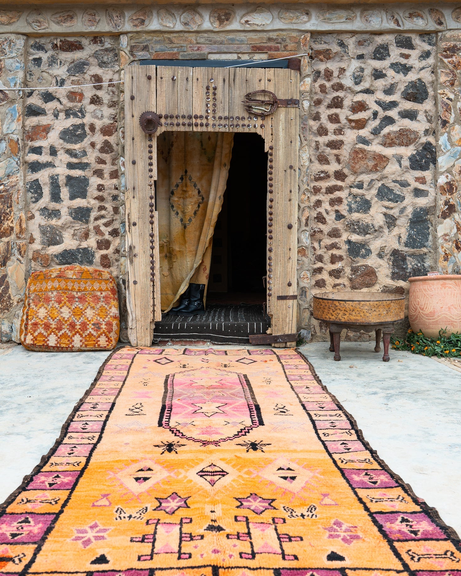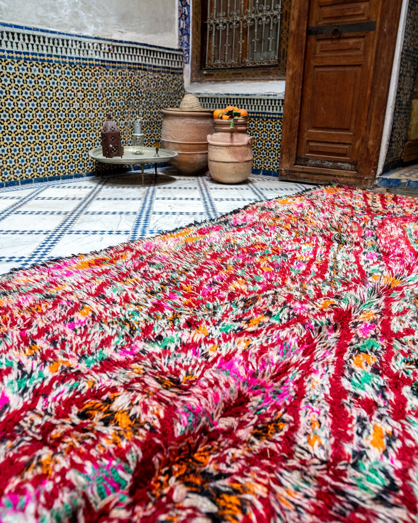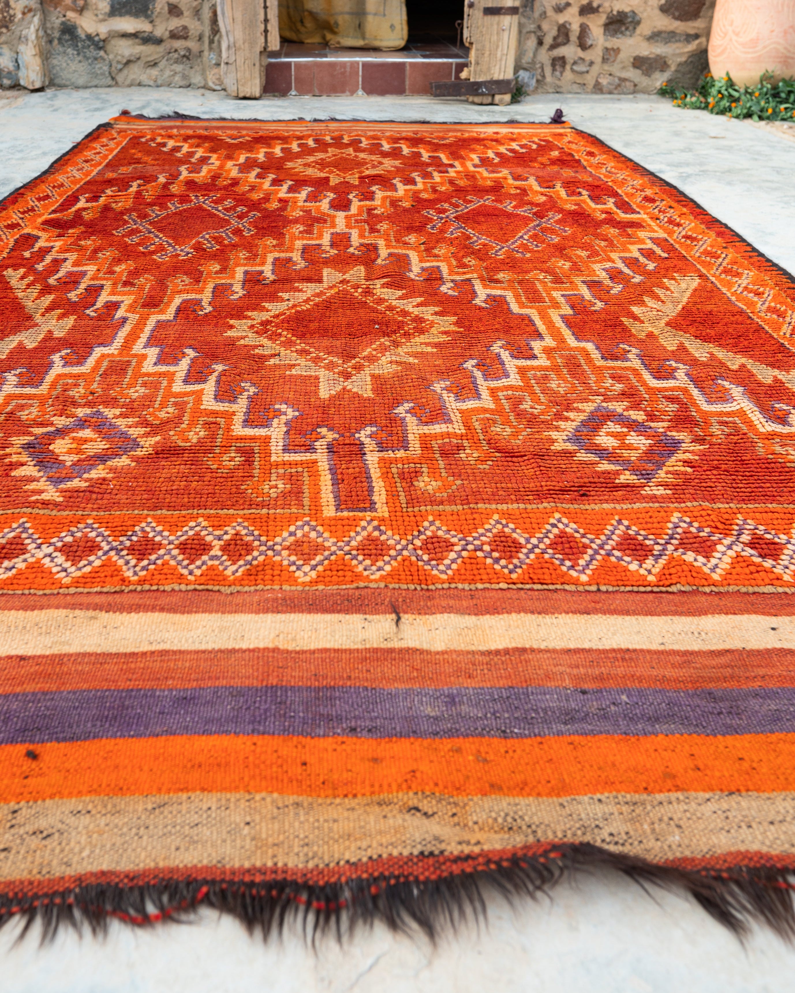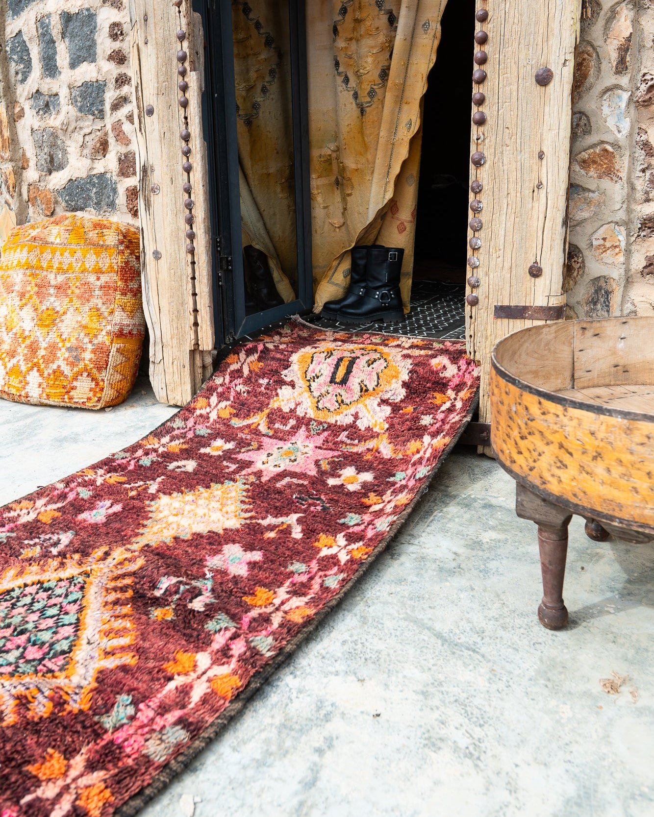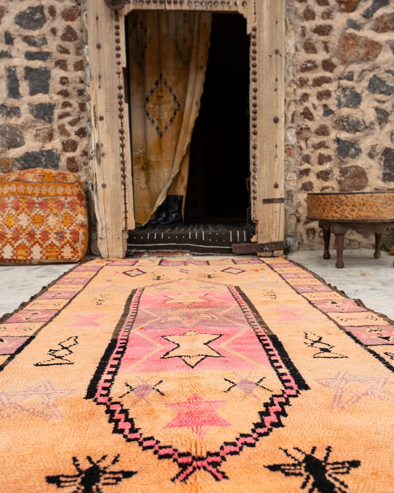 Keski-Atlaksen alueella valmistetut Beni M’Guild -heimon matot ovat tunnettuja korkeasta laadusta sekä intensiivisestä värityksestään. Tämäkin paksu ja jämäkkä yksilö hurmaa pinkin, oranssin ja beigen sävyillä. Staycation-matto on kaksi metriä leveä ja kolme metriä pitkä, ja sen arvioitu ikä on yli 30 vuotta.