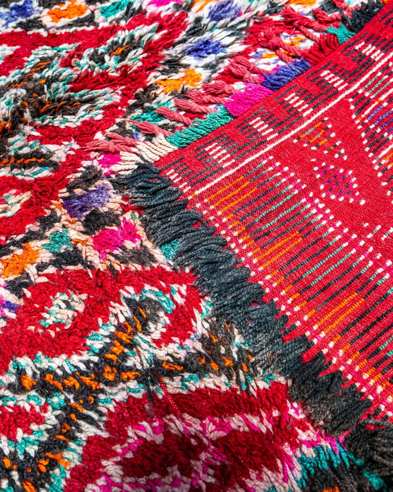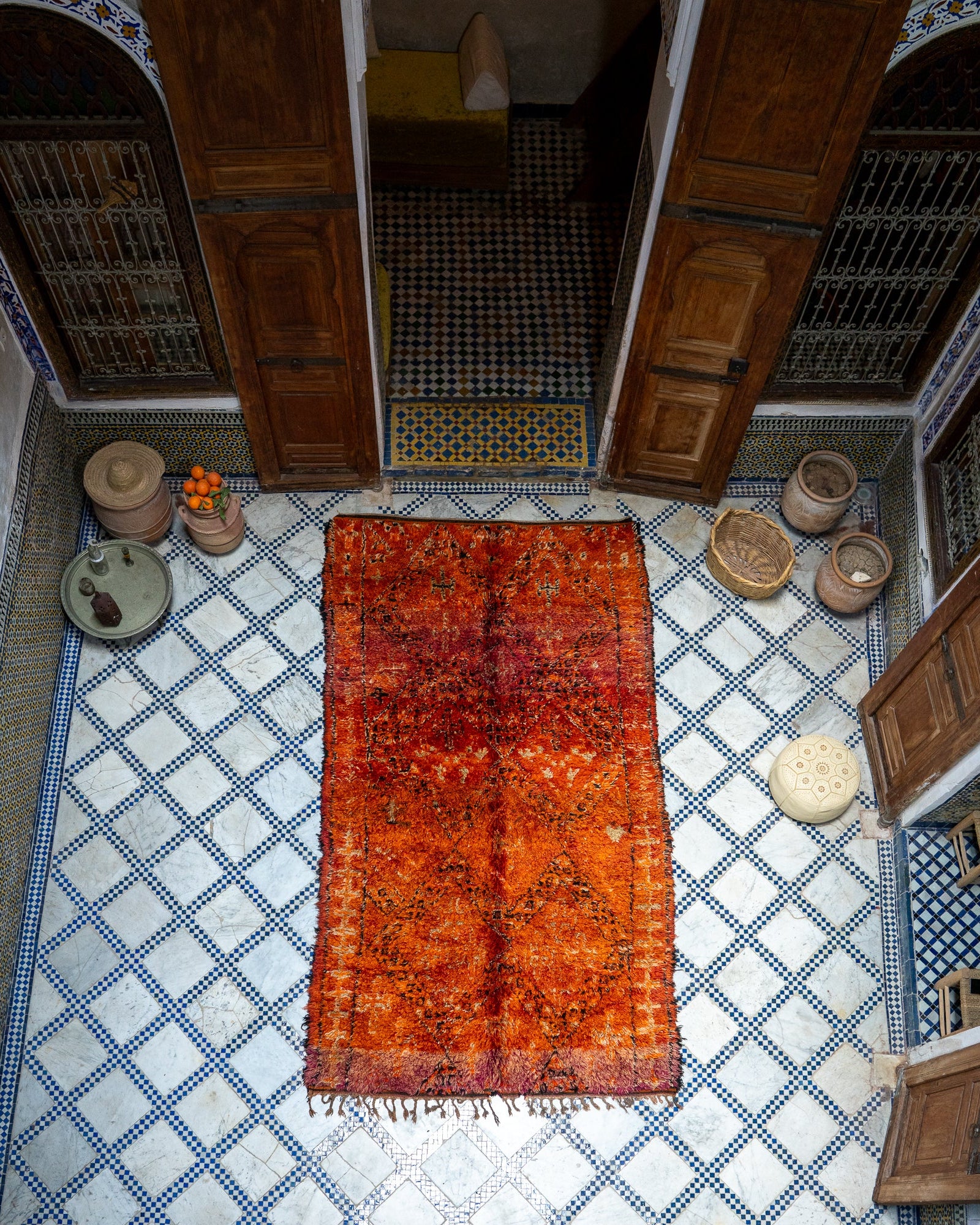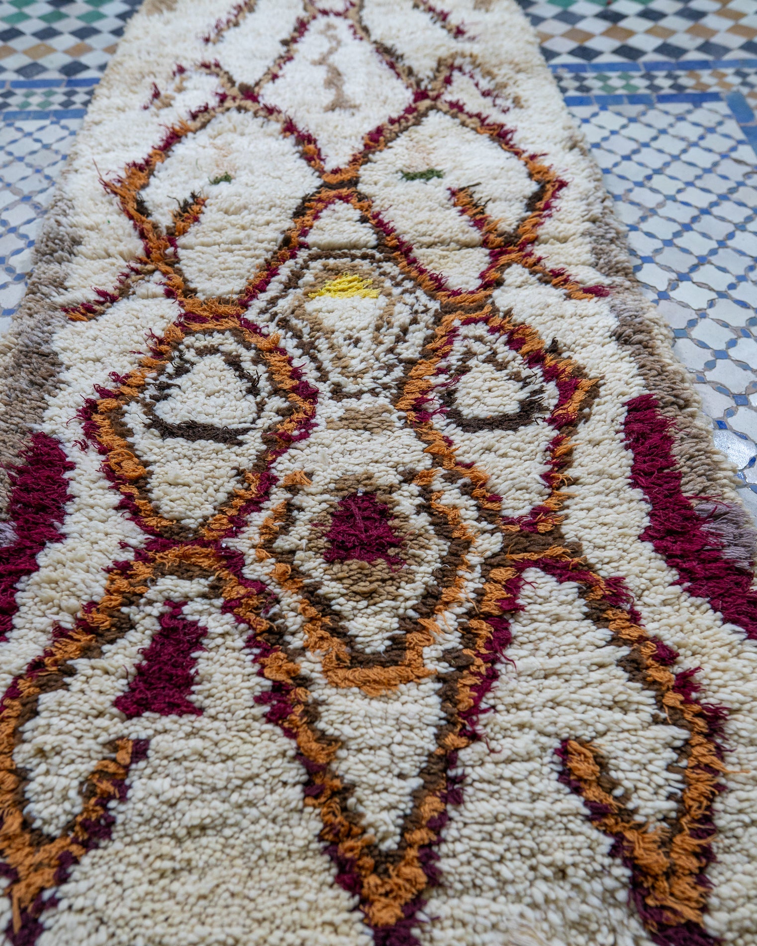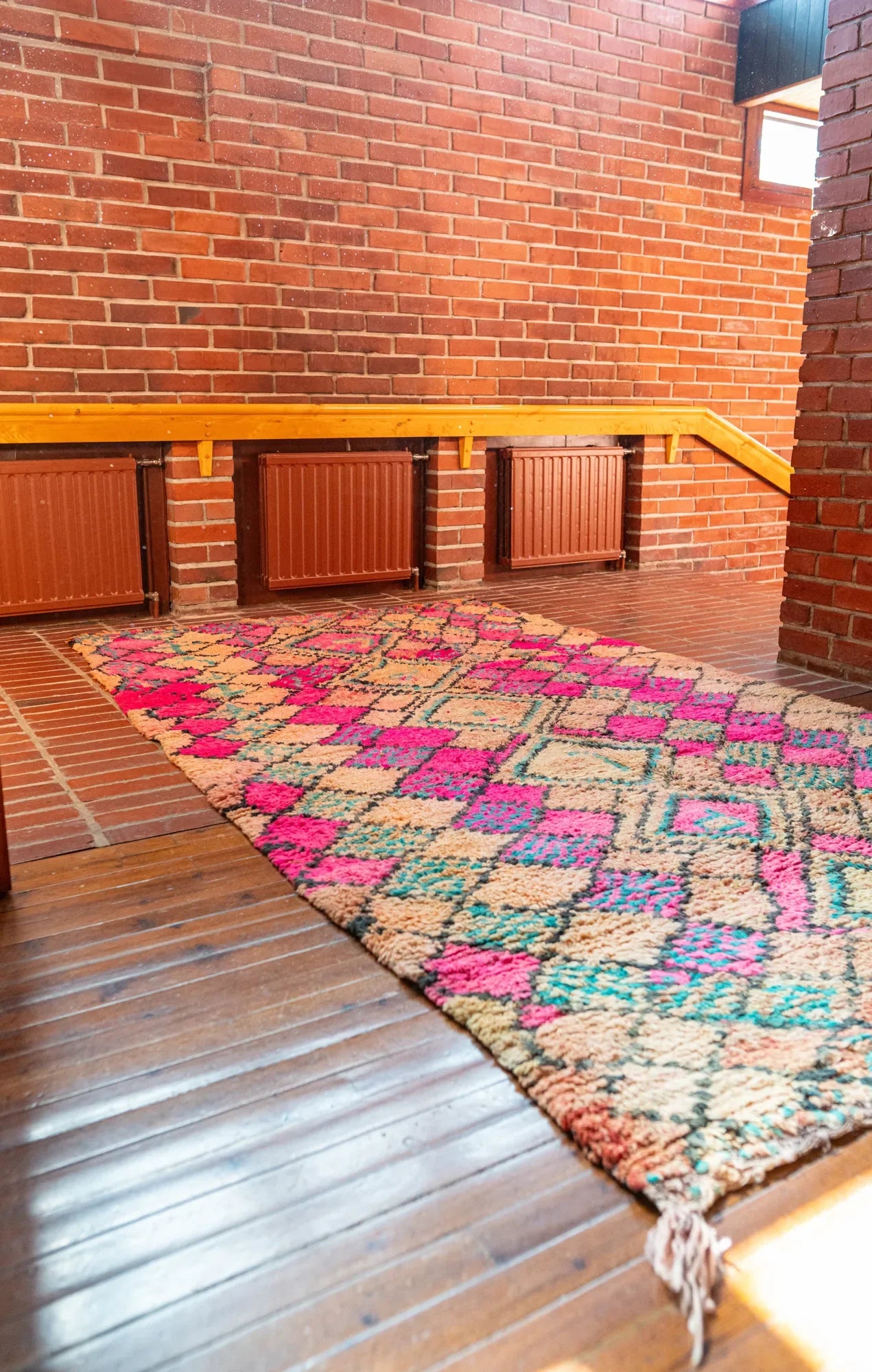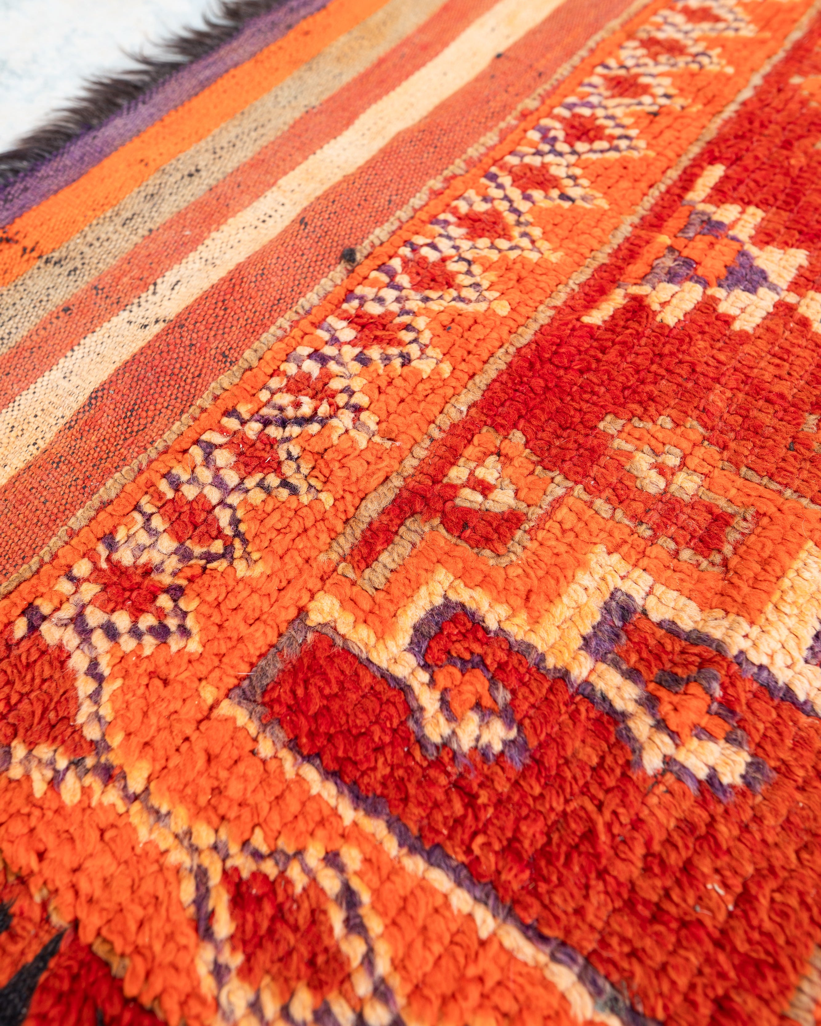 Keski-Atlaksen alueella valmistetut Beni M’Guild -heimon matot ovat tunnettuja korkeasta laadusta sekä intensiivisestä värityksestään. Tämäkin paksu ja jämäkkä yksilö hurmaa pinkin, oranssin ja beigen sävyillä. Staycation-matto on kaksi metriä leveä ja kolme metriä pitkä, ja sen arvioitu ikä on yli 30 vuotta.