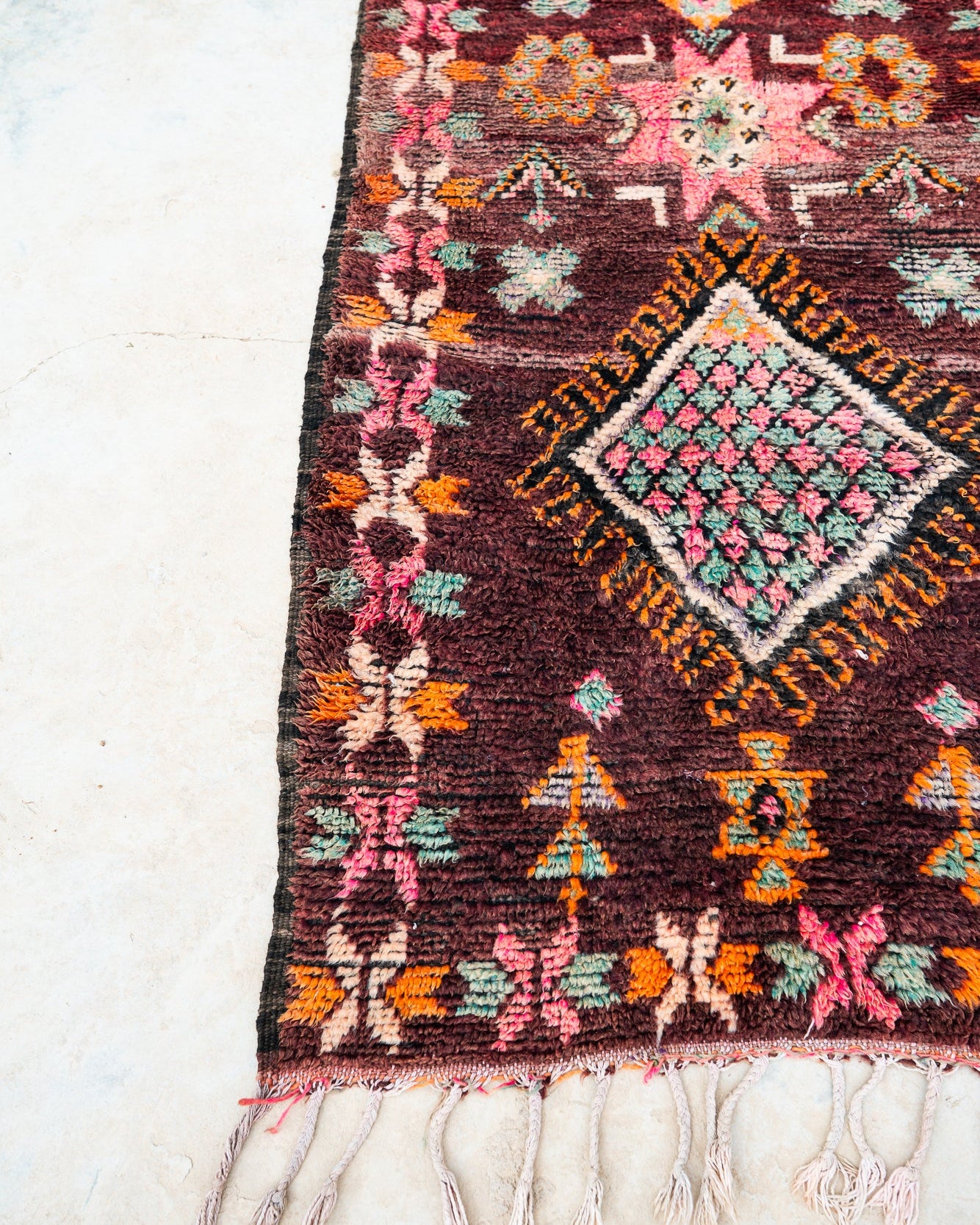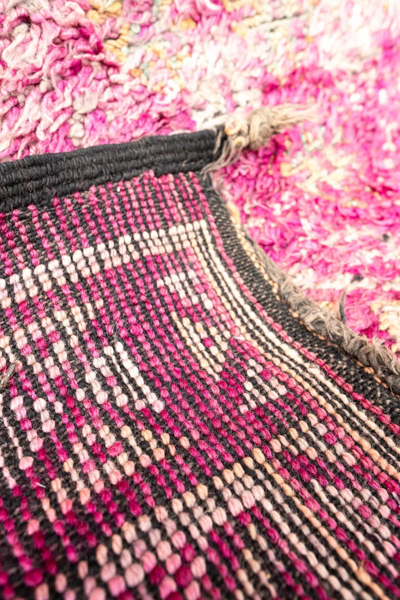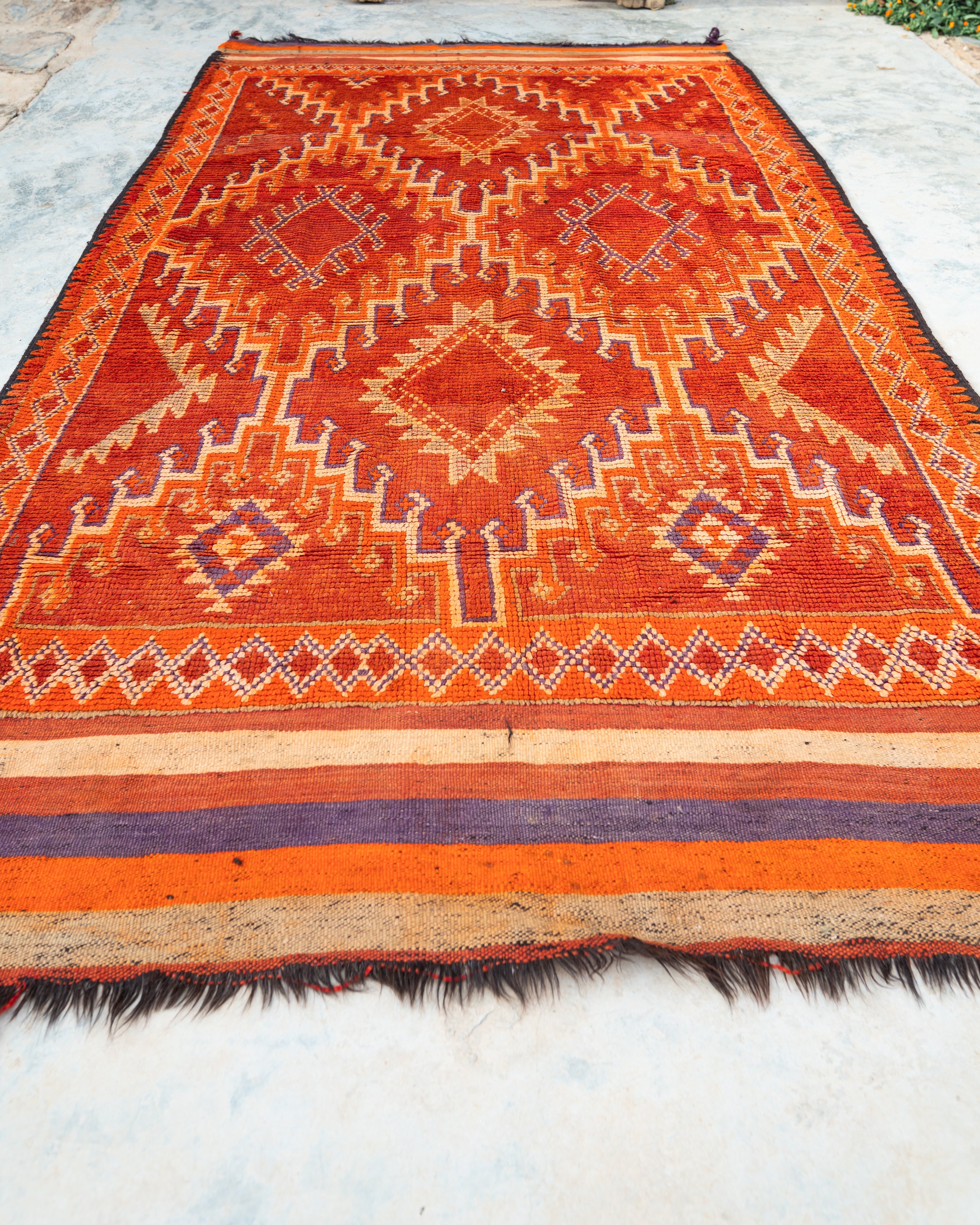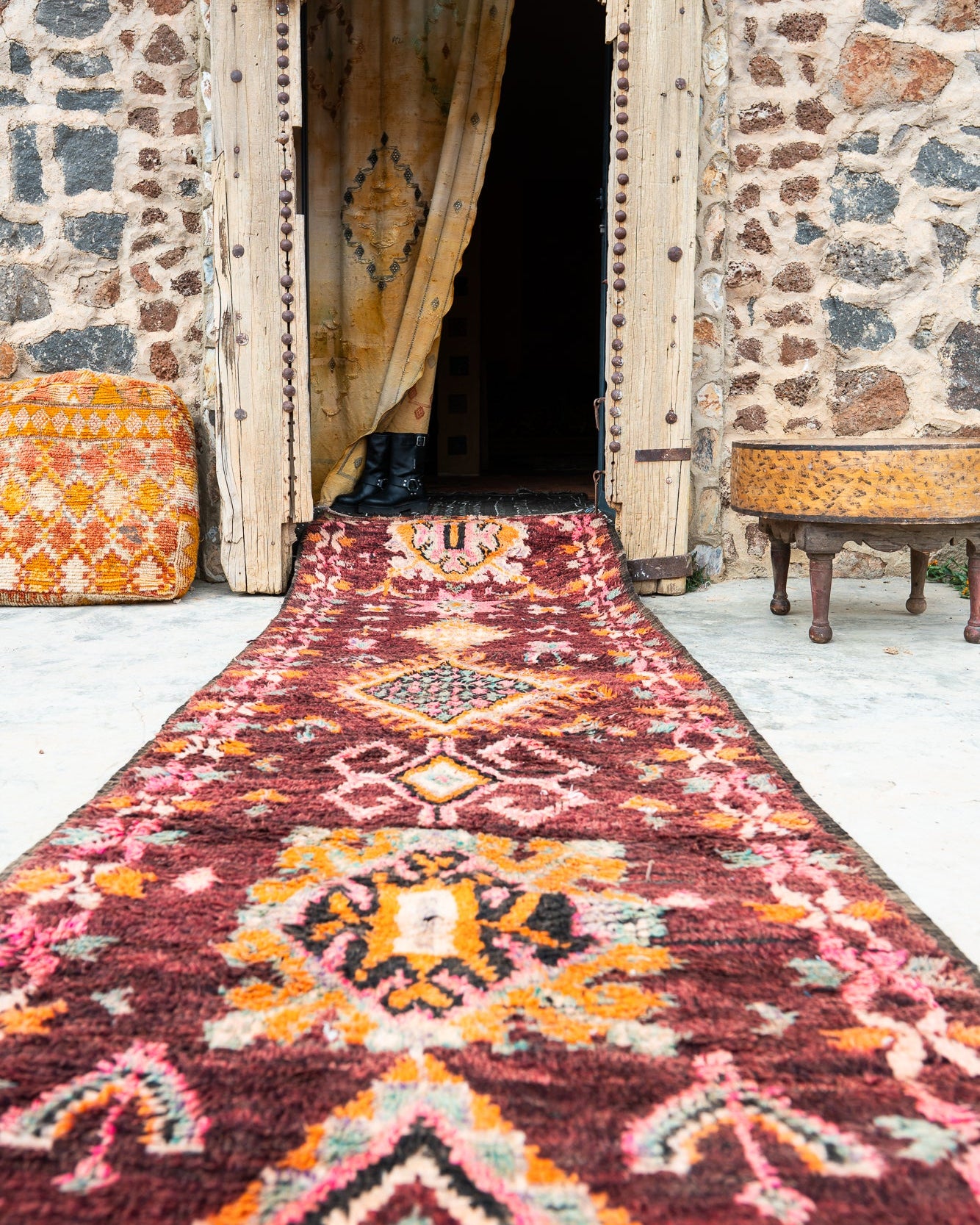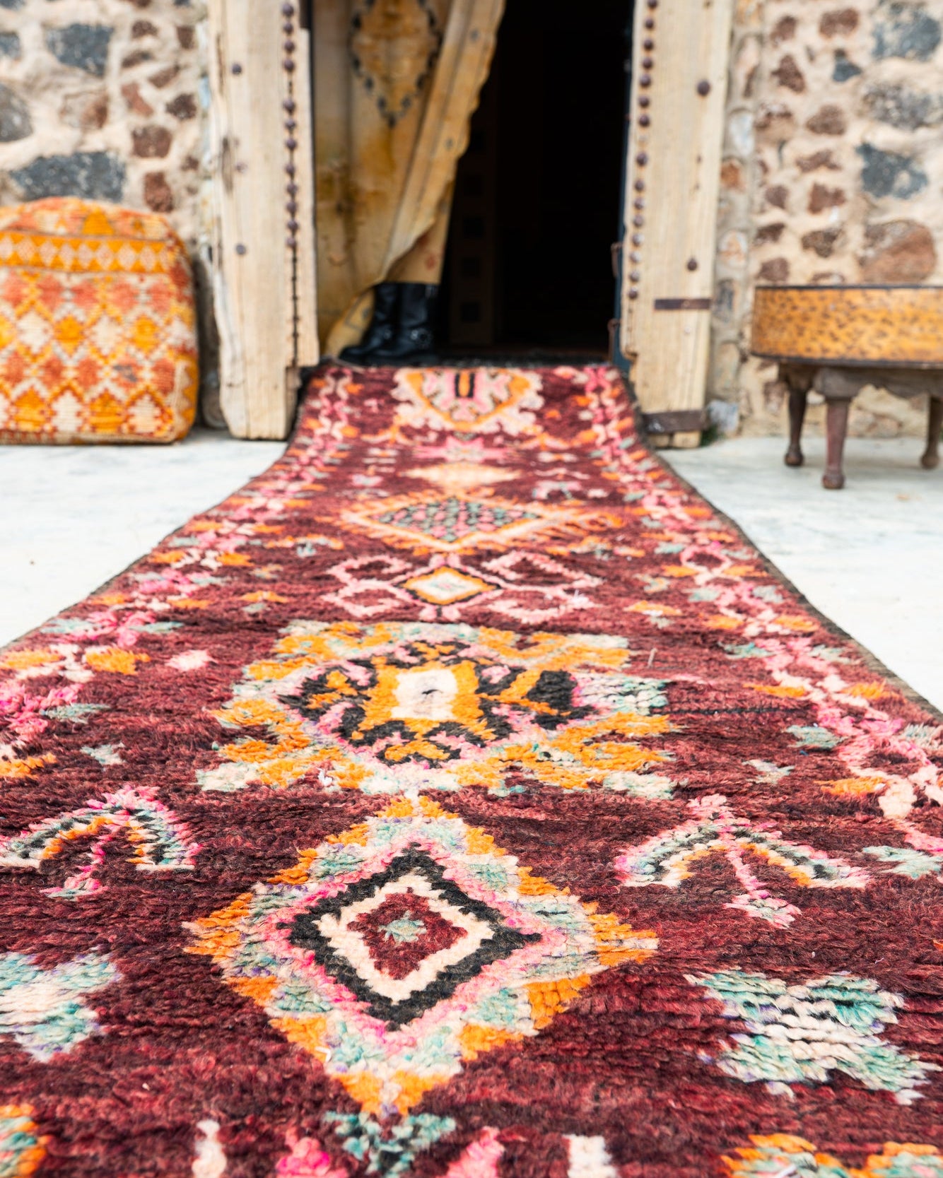 Keski-Atlaksen alueella valmistetut Beni M’Guild -heimon matot ovat tunnettuja korkeasta laadusta sekä intensiivisestä värityksestään. Tämäkin paksu ja jämäkkä yksilö hurmaa pinkin, oranssin ja beigen sävyillä. Staycation-matto on kaksi metriä leveä ja kolme metriä pitkä, ja sen arvioitu ikä on yli 30 vuotta.