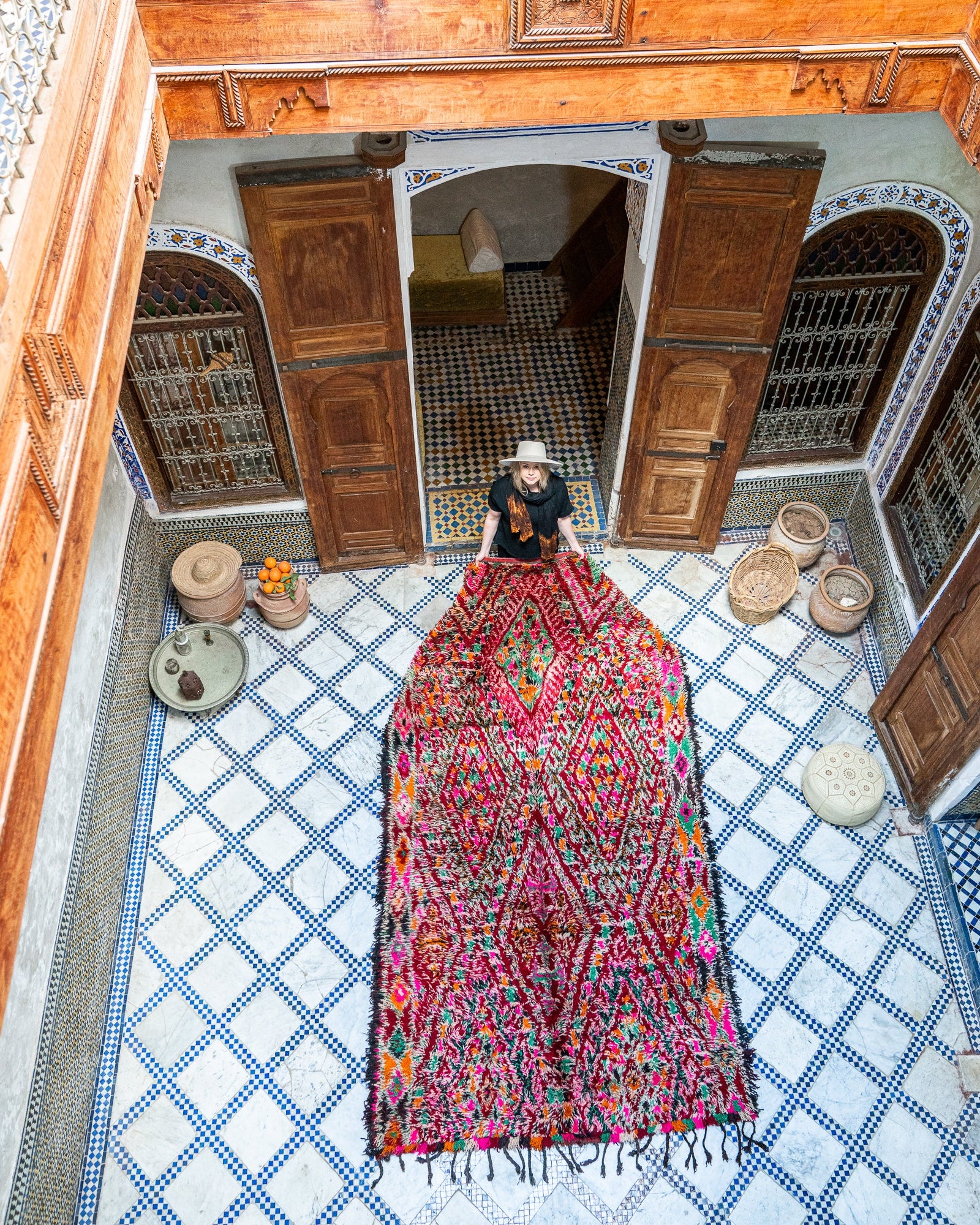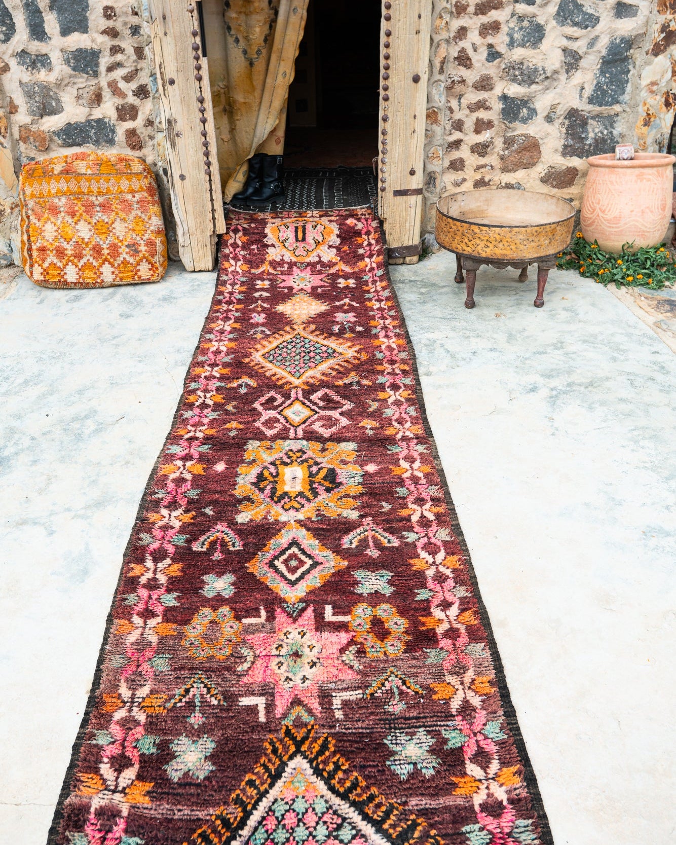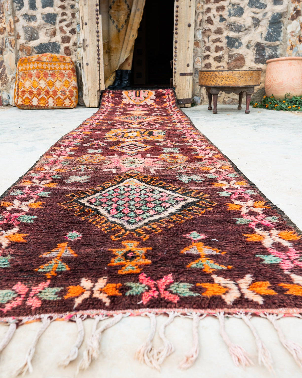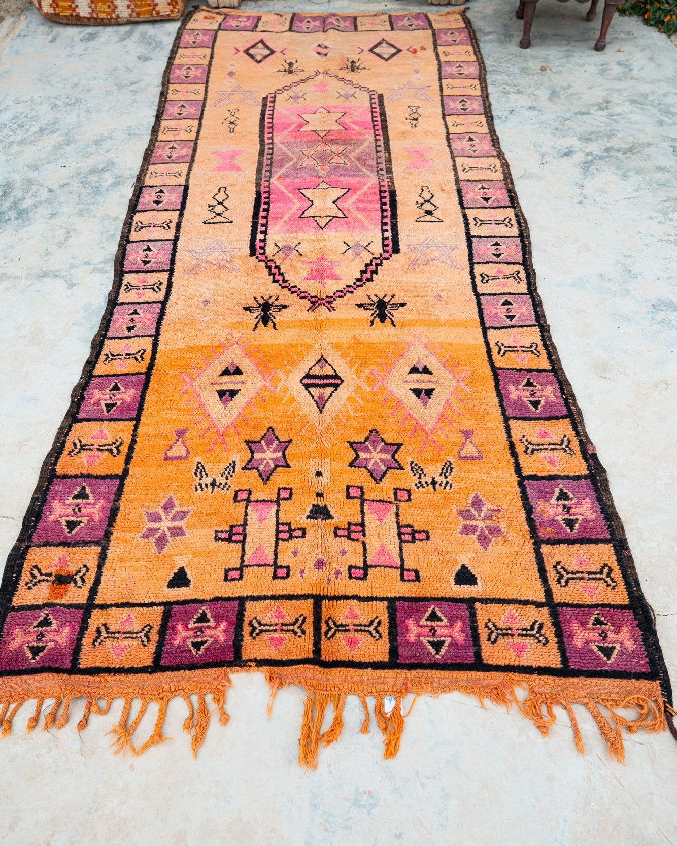 Keski-Atlaksen alueella valmistetut Beni M’Guild -heimon matot ovat tunnettuja korkeasta laadusta sekä intensiivisestä värityksestään. Tämäkin paksu ja jämäkkä yksilö hurmaa pinkin, oranssin ja beigen sävyillä. Staycation-matto on kaksi metriä leveä ja kolme metriä pitkä, ja sen arvioitu ikä on yli 30 vuotta.