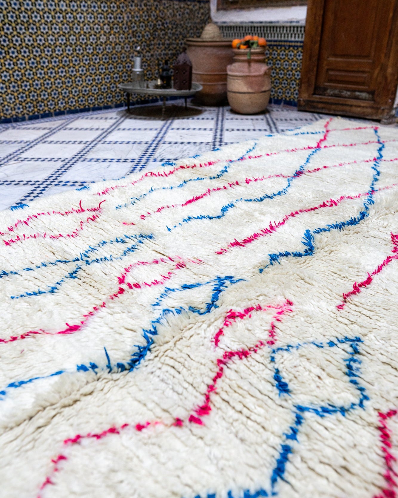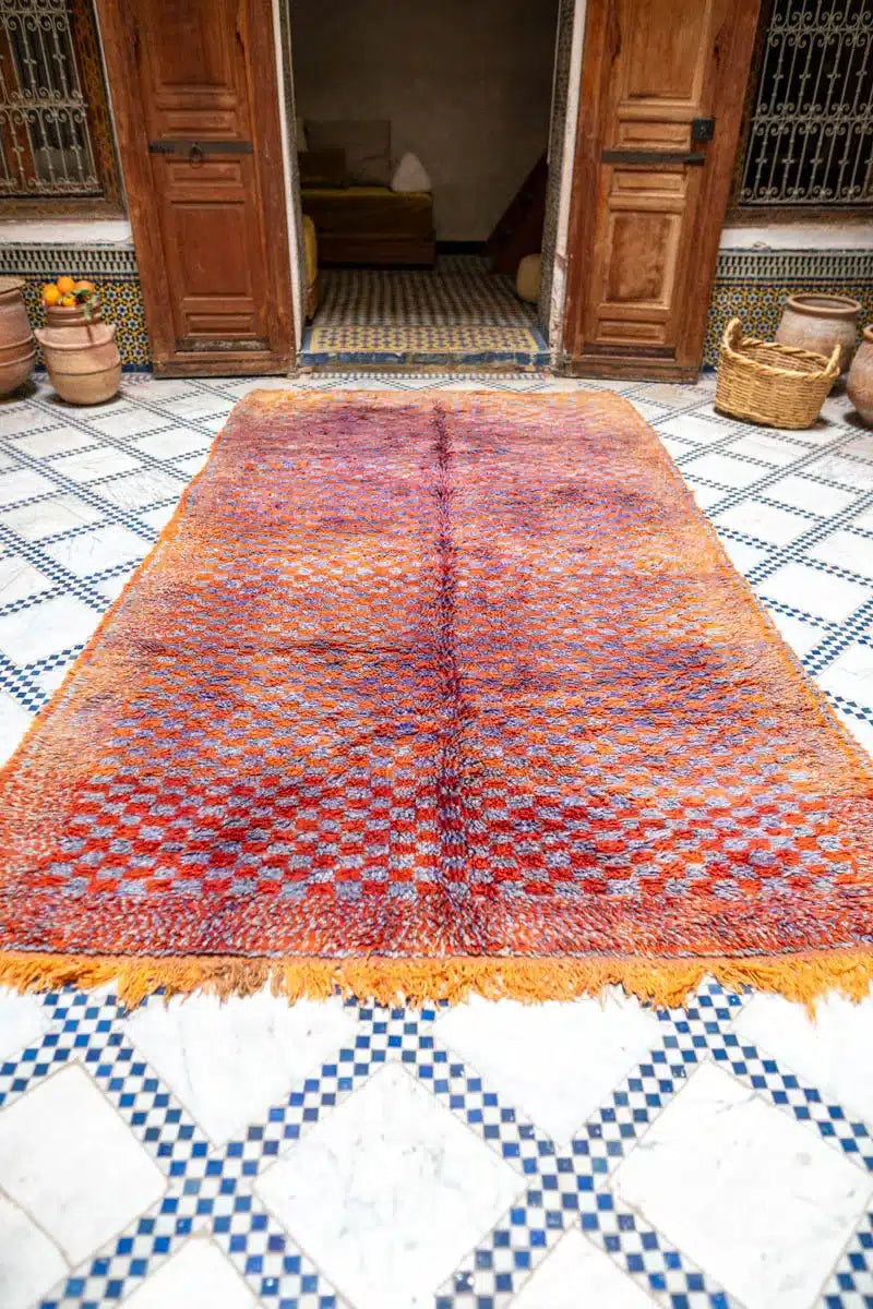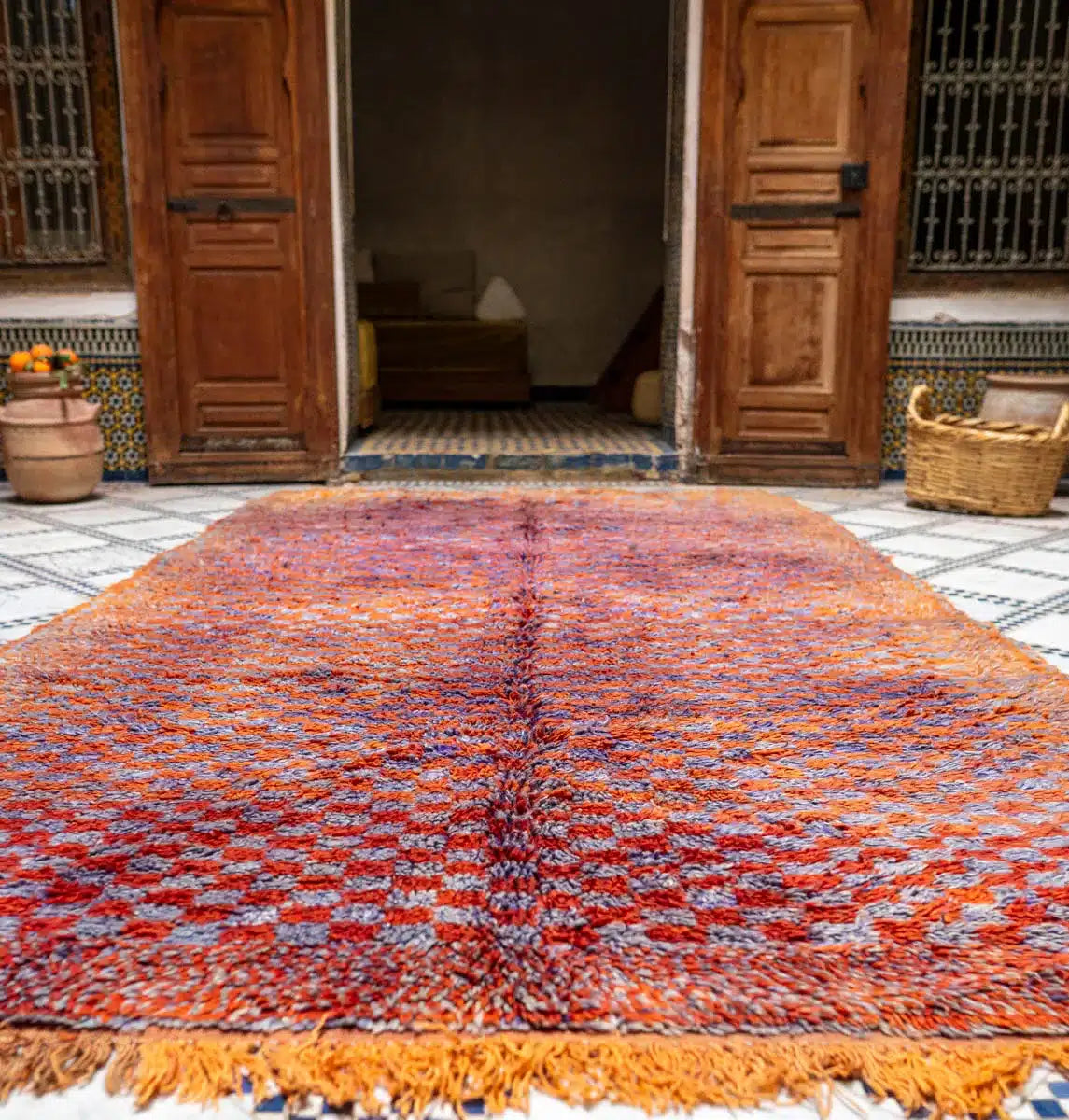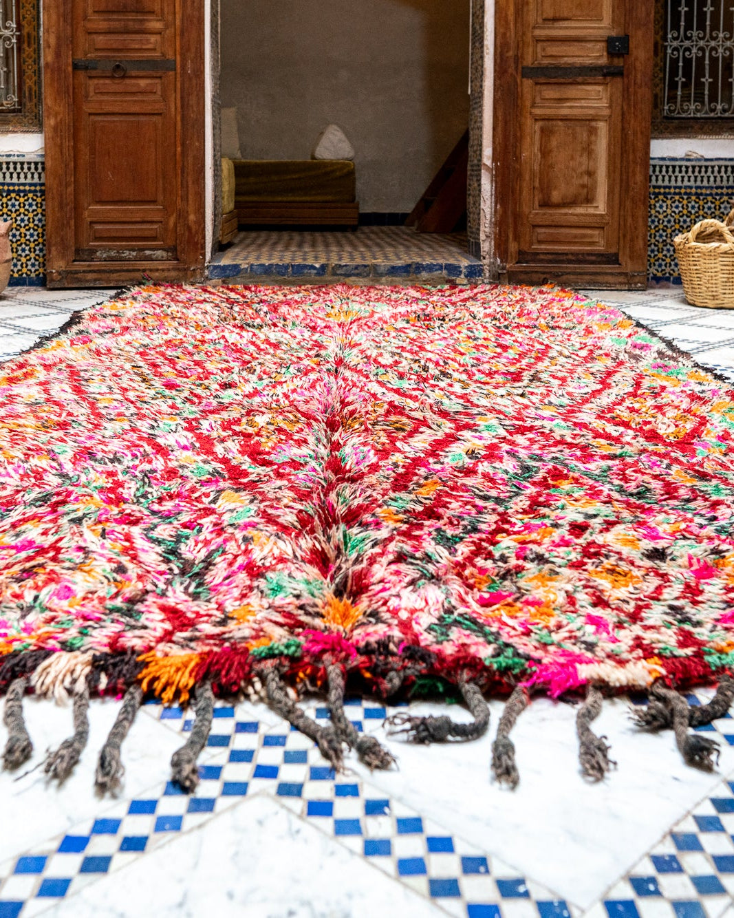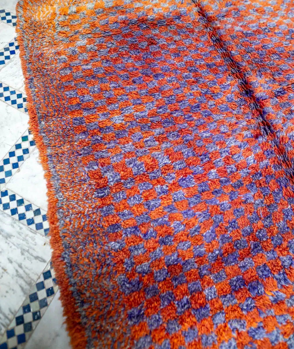 Azilal-heimon matot ovat todellisia taidemattoja, joiden väritys voi olla mitä tahansa mustaavalkoisesta neonväreihin. Esimerkiksi tässä Shakki-matossa on ajankohtainen ruutukuvio ja mainio sekoitus punaista, vaaleansinistä, liilaa ja oranssia. Upean maton arvioitu ikä on vähintään 20 vuotta.