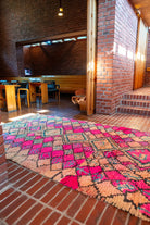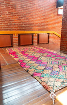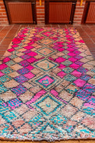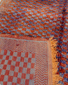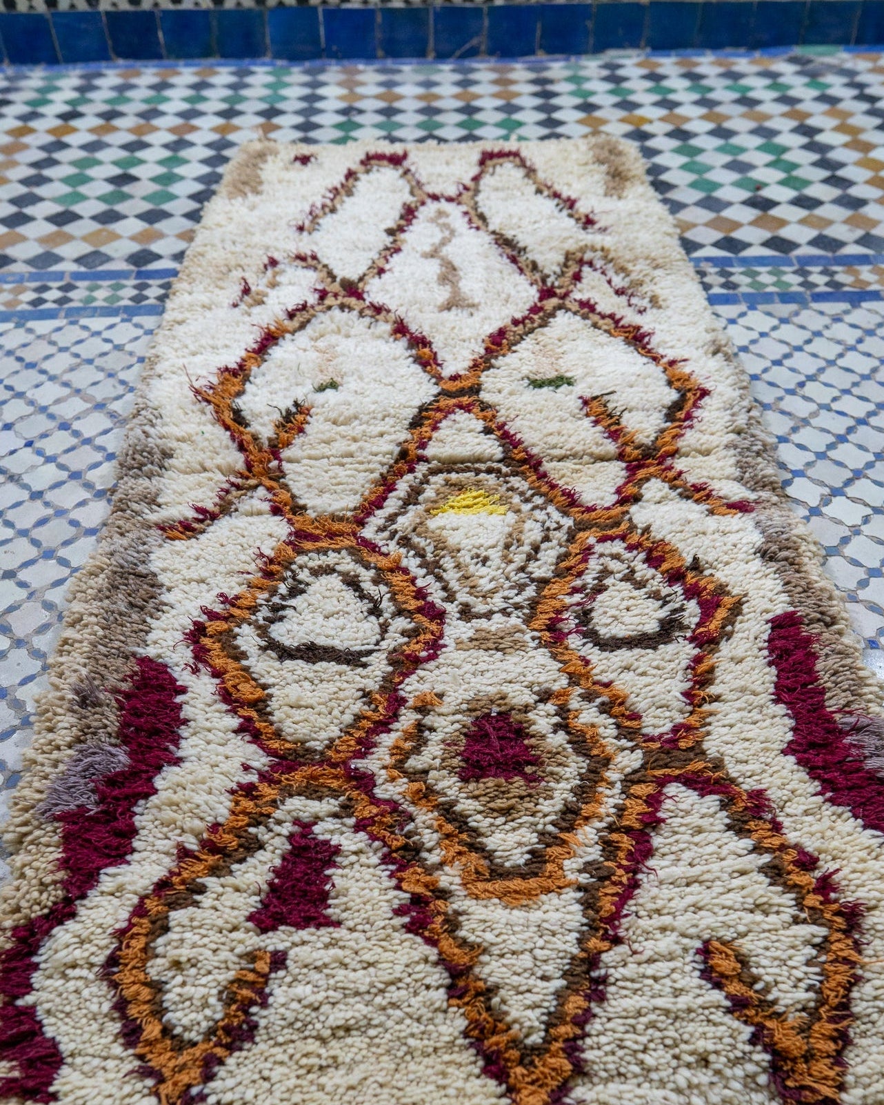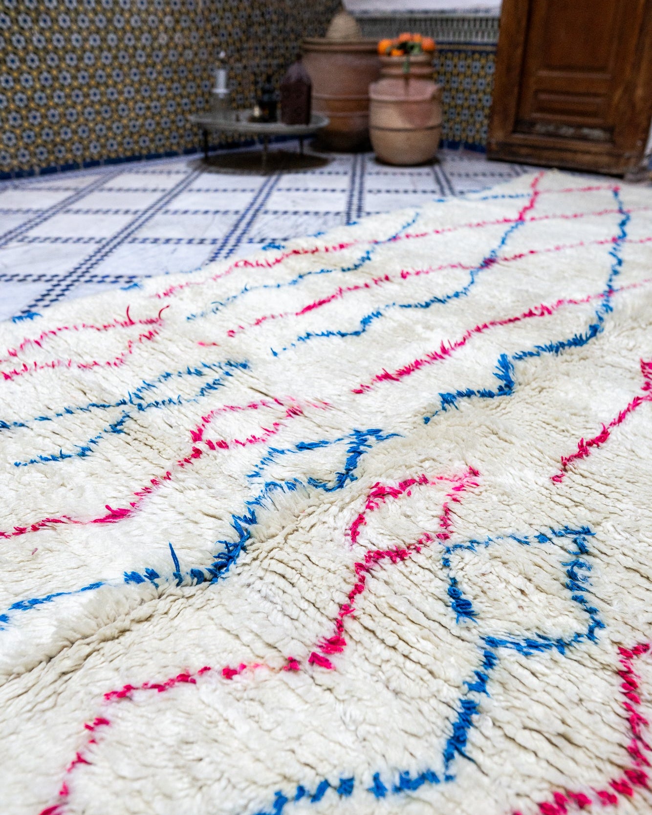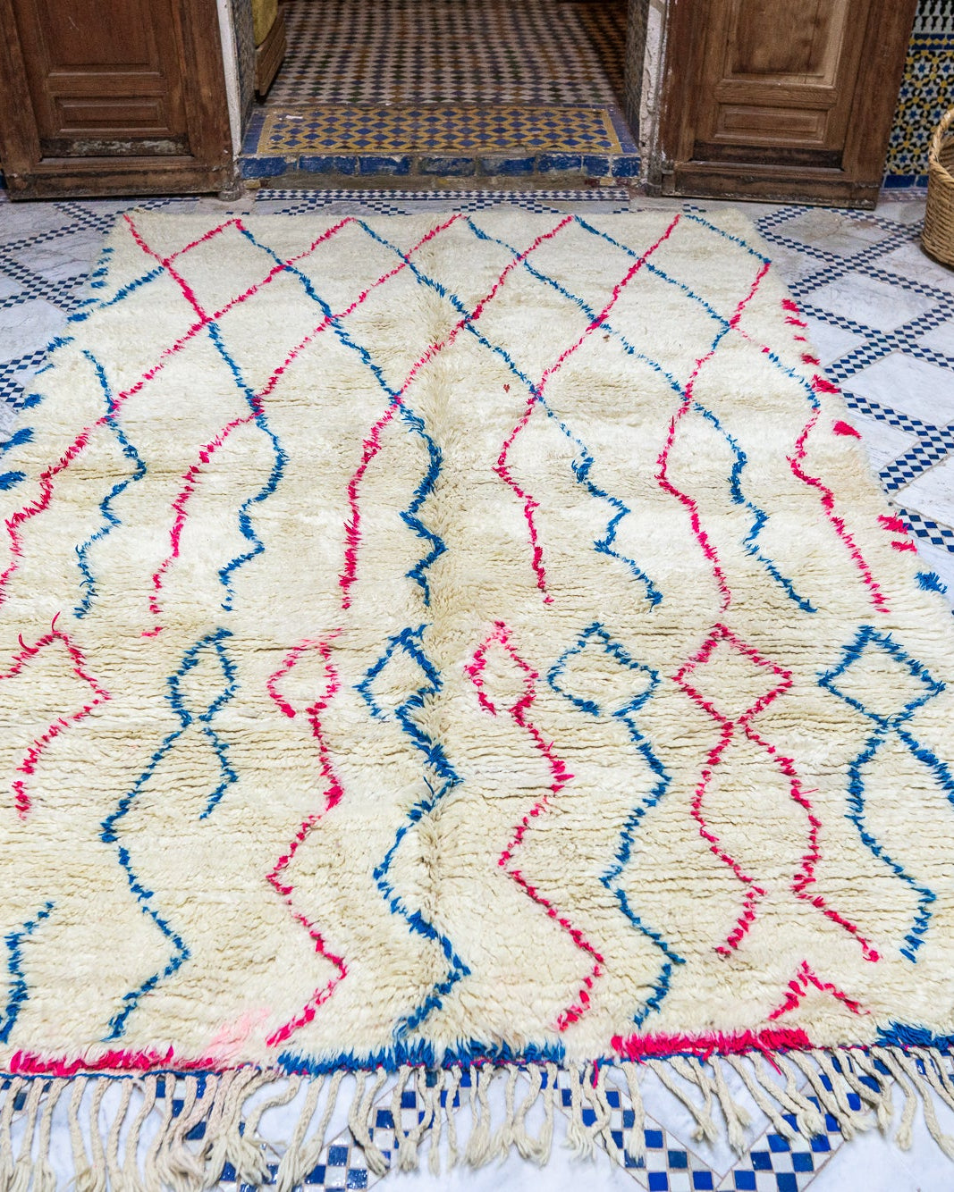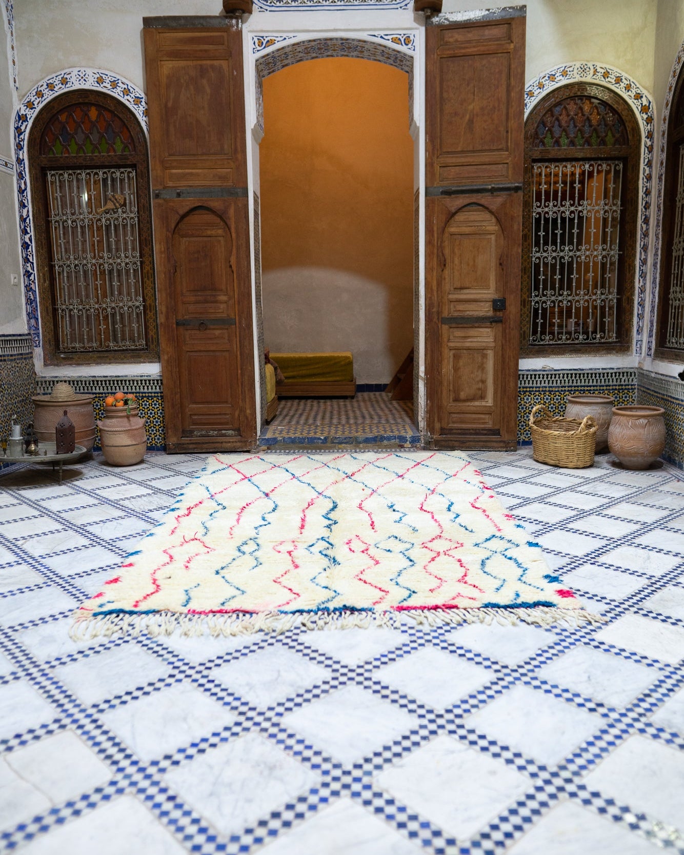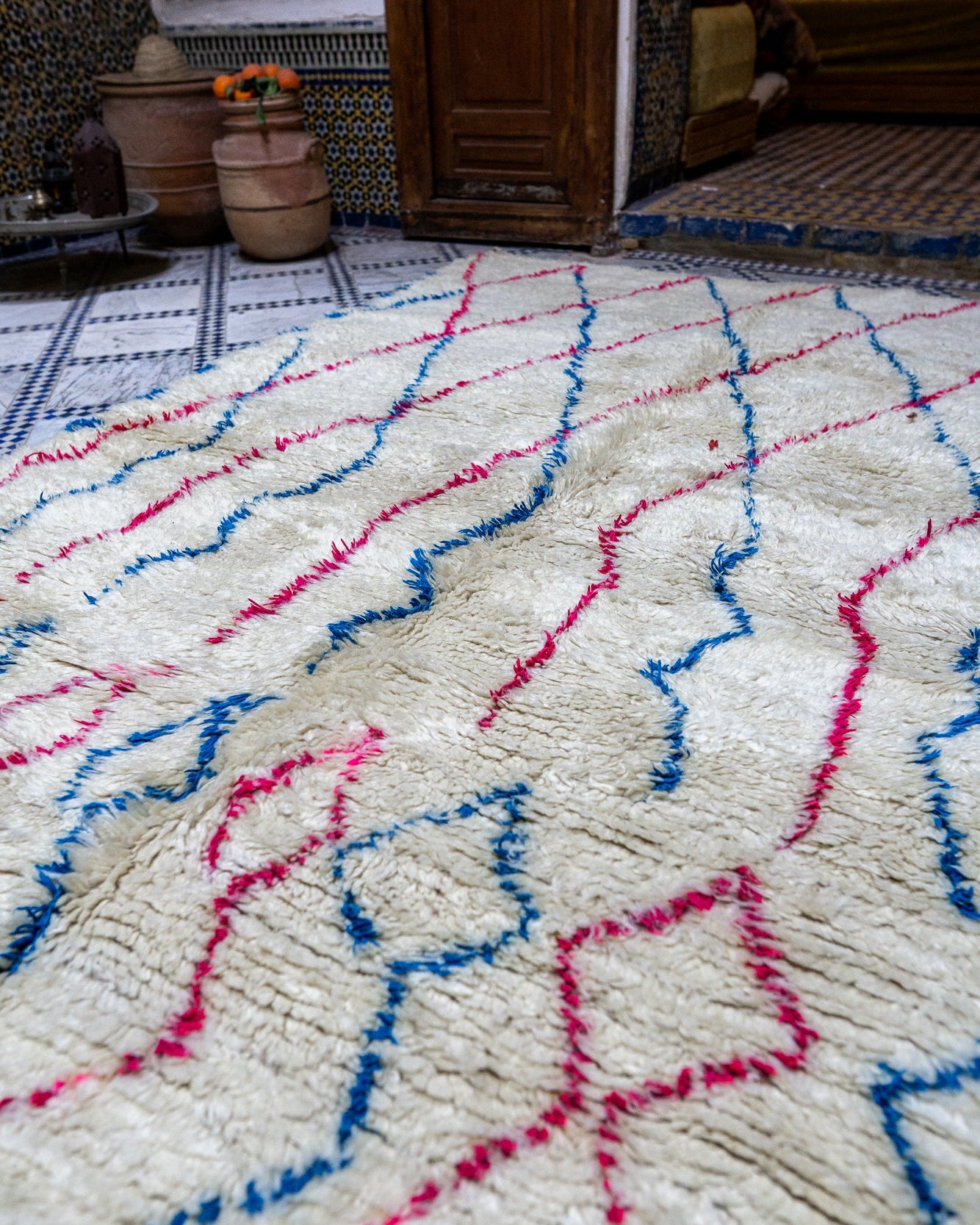 Azilal-heimon matot ovat todellisia taidemattoja, joiden väritys voi olla mitä tahansa mustaavalkoisesta neonväreihin. Esimerkiksi tässä Shakki-matossa on ajankohtainen ruutukuvio ja mainio sekoitus punaista, vaaleansinistä, liilaa ja oranssia. Upean maton arvioitu ikä on vähintään 20 vuotta.