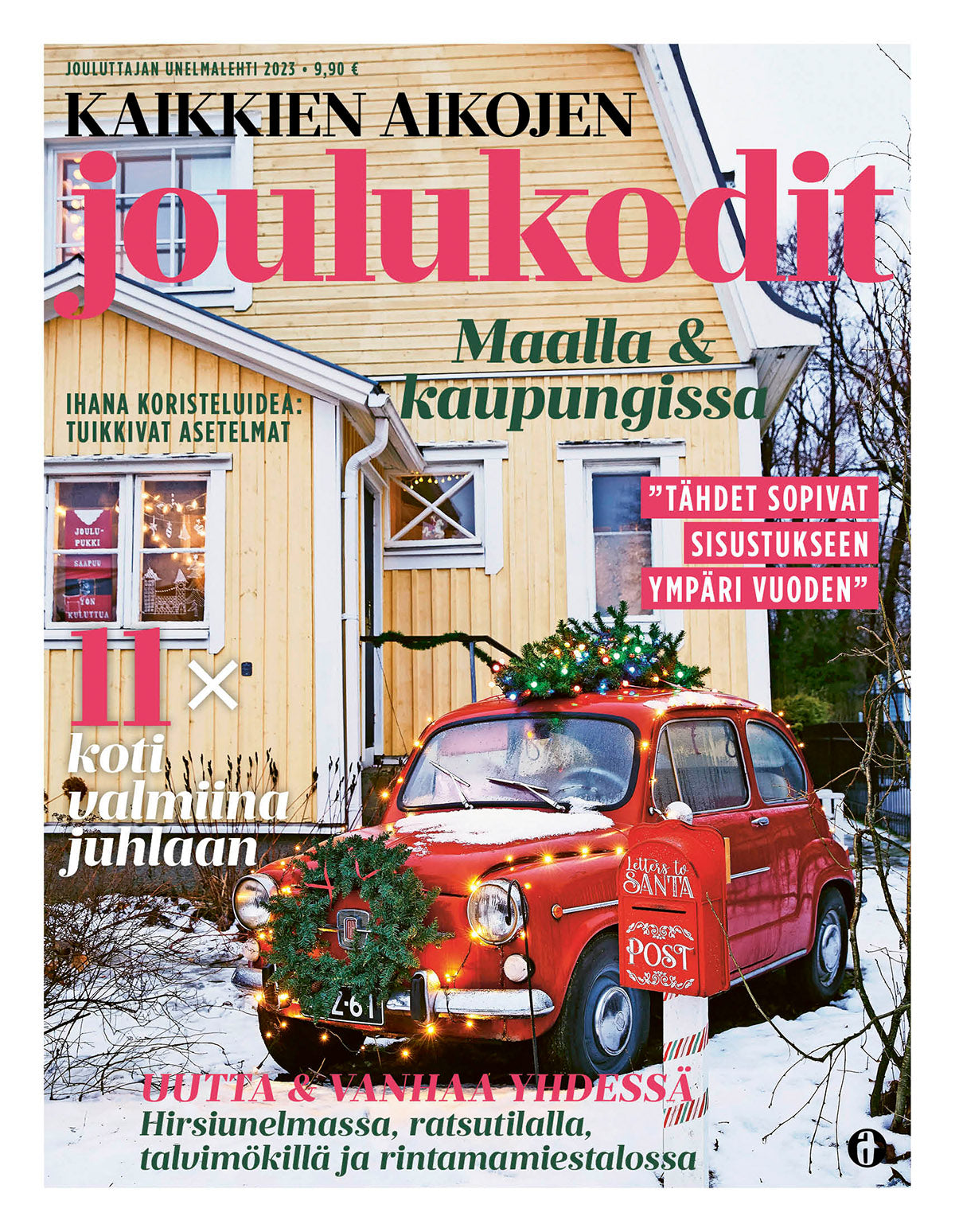 Kaikkien aikojen joulukodit -erikoislehdessä tutustutaan 11 erilaiseen ja erityyliseen joulukotiin. Saat nauttia muun muassa vanhan ratsutilan joulunvietosta, kurkistuksesta 1920-luvun yllätyksiä tulvivaan hirsitaloon sekä skandinaavisen hillitystä ja lämminhenkisestä joulutunnelmasta aivan uudessa talossa. Lehden kotijuttuja täydentävät niistä poimitut koristeluideat.