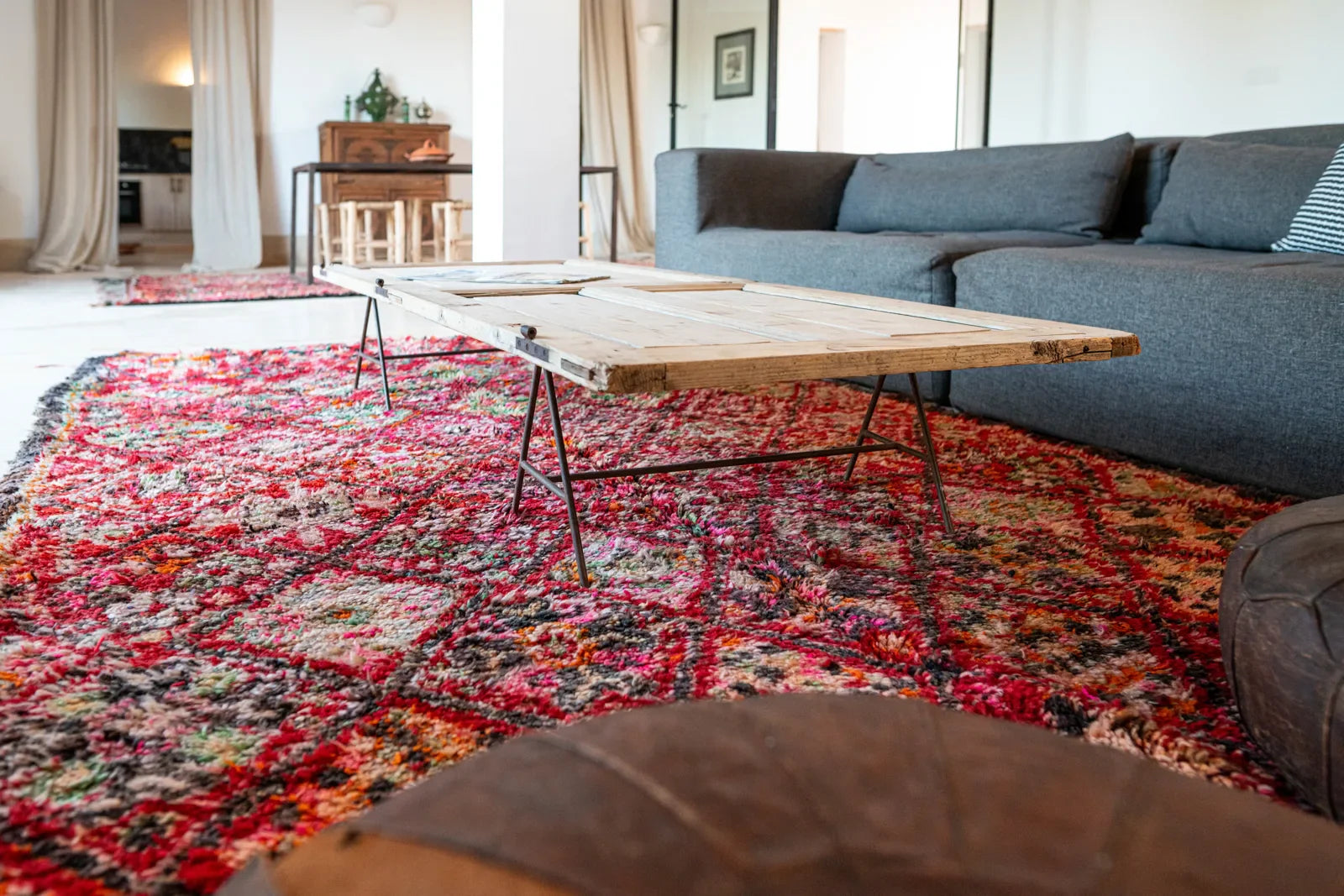 Näyttävä punainen Marmoucha vintagematto, joka edustaa marokkolaisen käsityötaidon hienointa kärkeä. Kaunis yksityiskohtainen kuviointi on solmittu useilla yhteensopivilla väreillä, ja tumma kehys viimeistelee tämän taideaarteen.