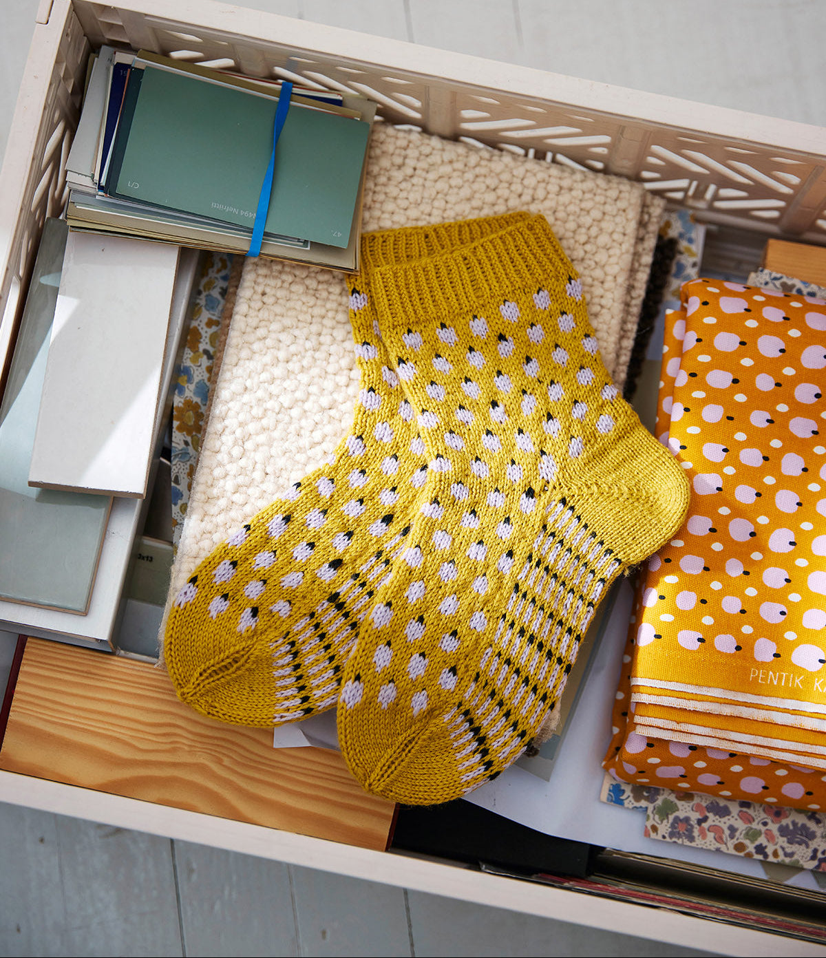 Kardemumma-kirjoneulesukkien ohje on aikaisemmin julkaistu Rakkaat kuviot & Pentik -lehdessä, jossa inspiraationa ovat toimineet Pentikin sisustustekstiilit ja -keramiikka.
