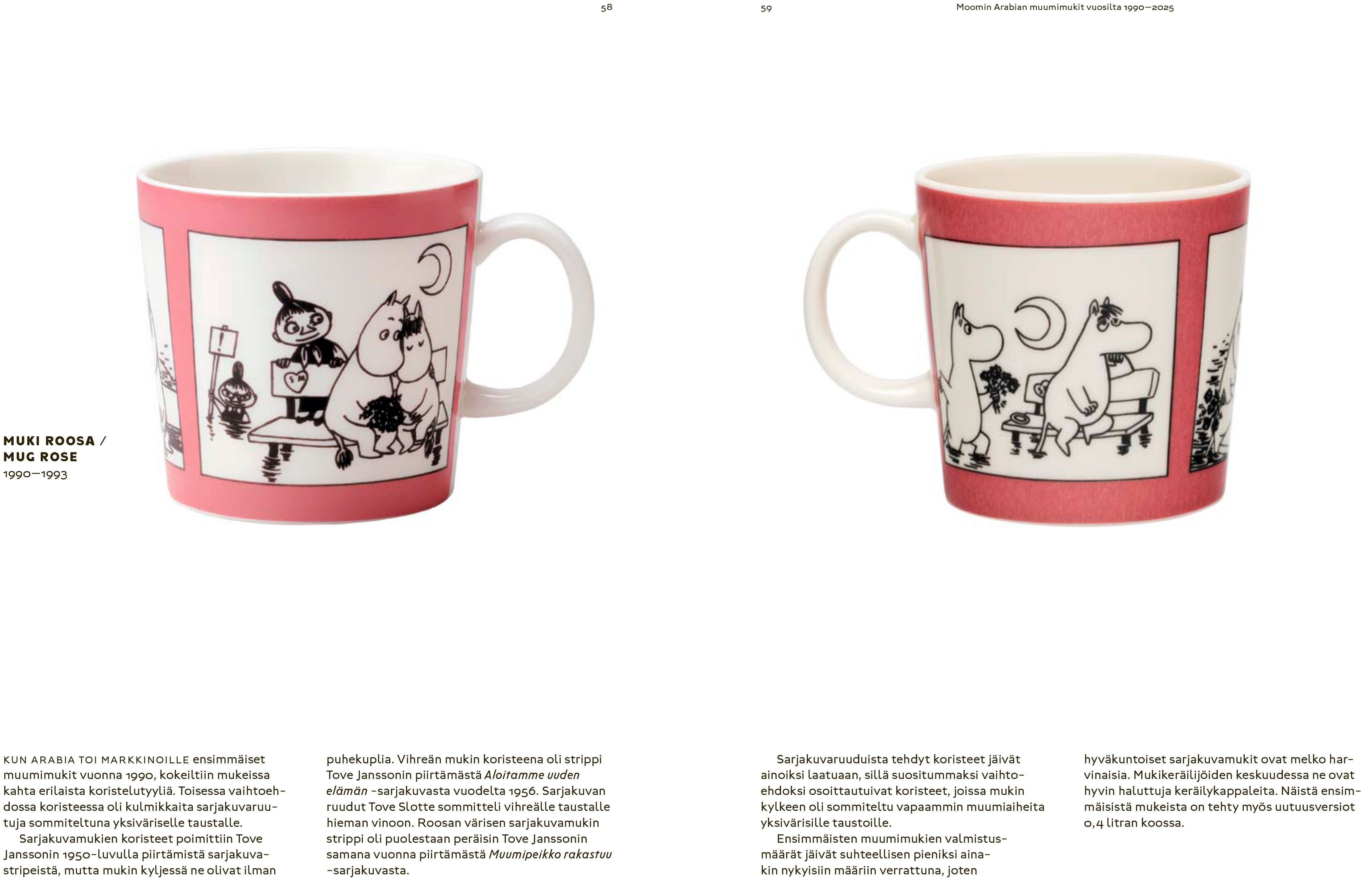 Moomin Arabian ja Moomin Charactersin kanssa yhteistyössä tehty Muumimukit kokoaa yhteen Arabian tehtaan Teema-mallisen muumimukituotannon vuosilta 1990–2025, myös kaikki juhlavuoden 2025 mukit. Kirjassa esitellään elävästi mukien historiaa, suunnitteluprosessia ja valmistusta sekä nostetaan esille yksittäisten mukien kiinnostavia yksityiskohtia. Lisäksi kirjaan on haastateltu keräilijöitä eri puolilta maailmaa. Upeasti kuvitettu teos soveltuu niin mukikeräilijän tietopankiksi kuin ilahduttamaan Muumi-fania.