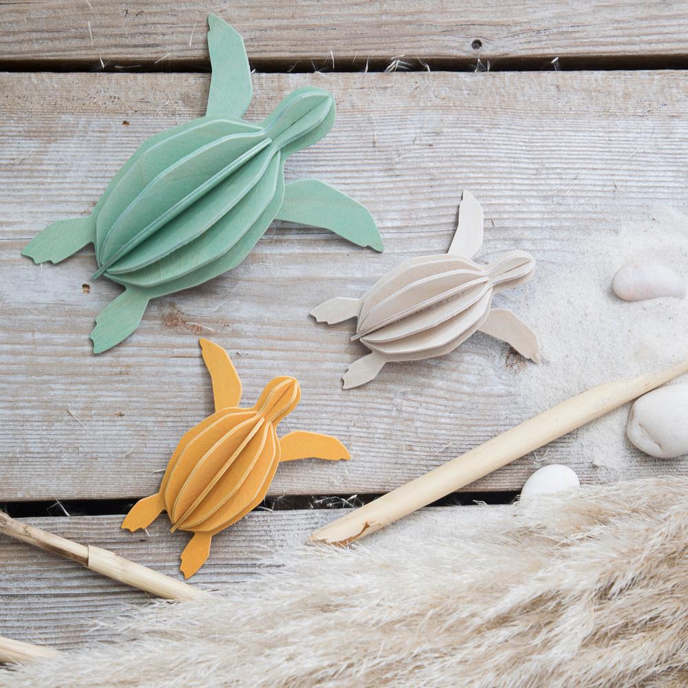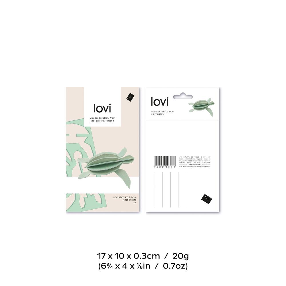 Lovi-merikilpikonnaa on kahdessa värissä, lämpimänkeltaisessa tai mintunvihreässä. Kokoja on kaksi, 8cm ja 12cm, mitattuna nokan päästä takaevän loppuun.