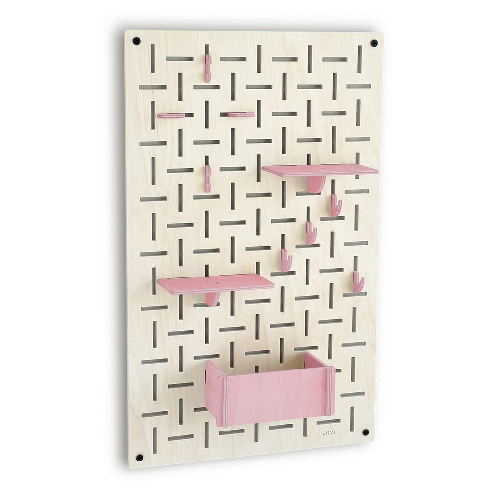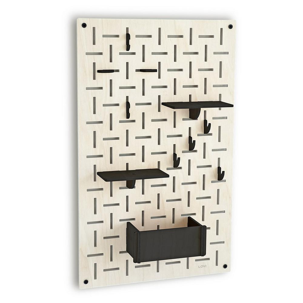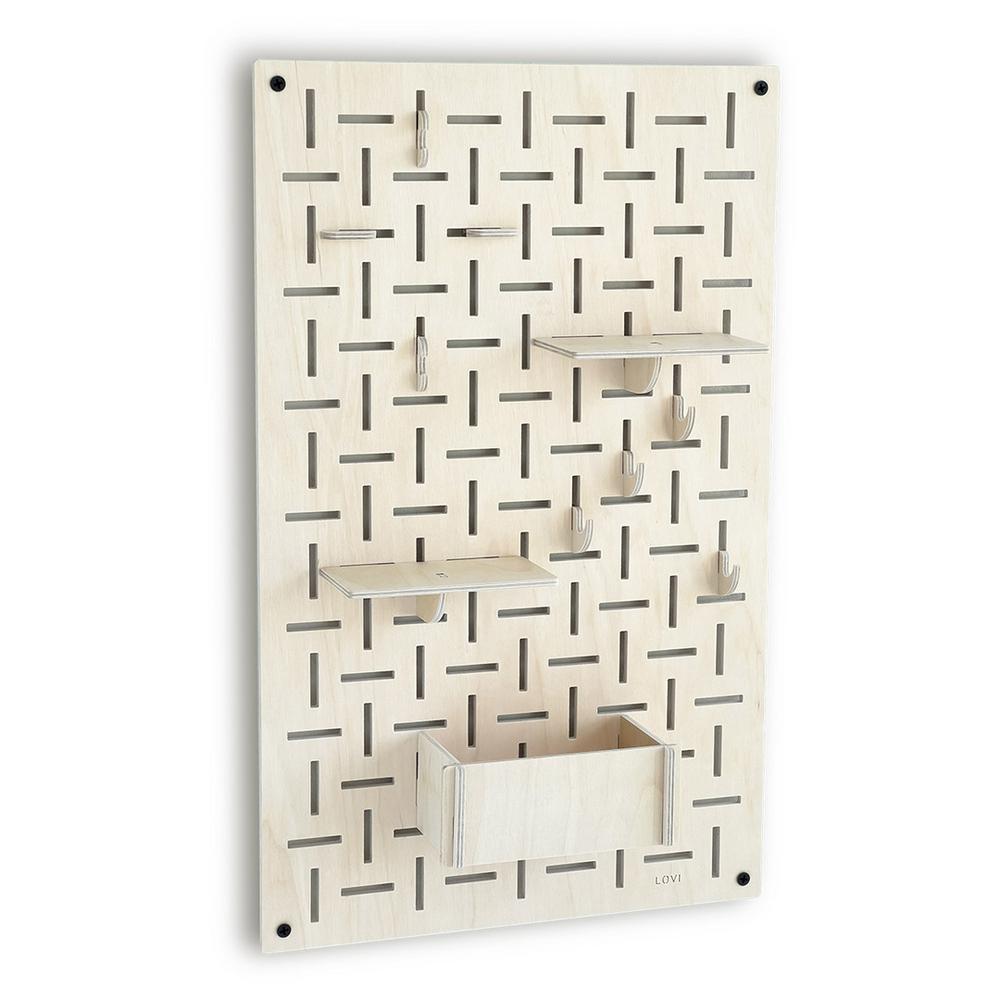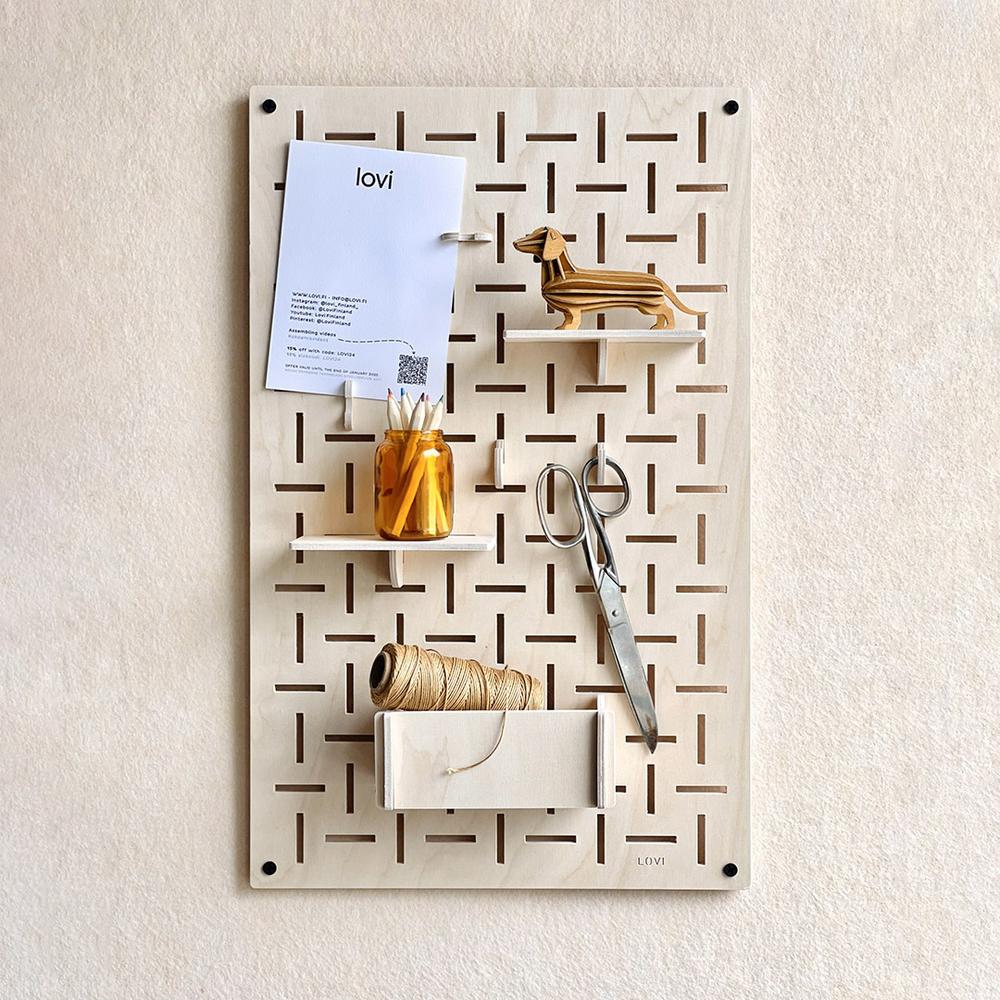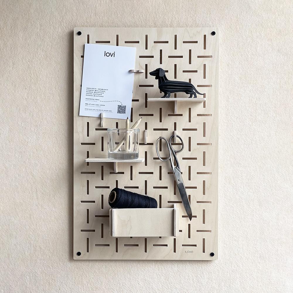 Lovi-sisustuslevy on näppärä apu kodin ja toimiston säilytystarpeisiin. Tiheä vaaka- ja pystysuuntainen rei’itys luo kauniin kuvion ja mahdollistaa koukkujen ja hyllyjen monipuolisen sijoittelun.