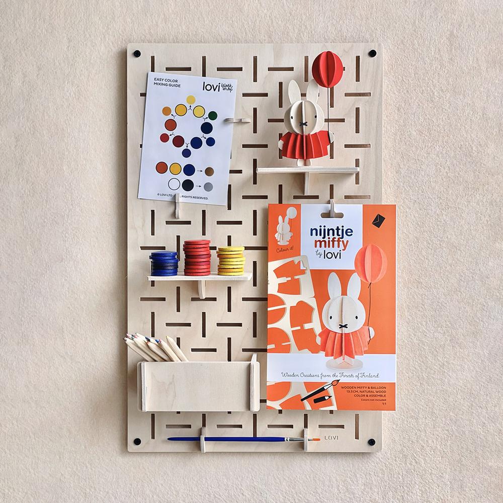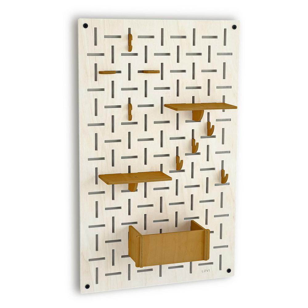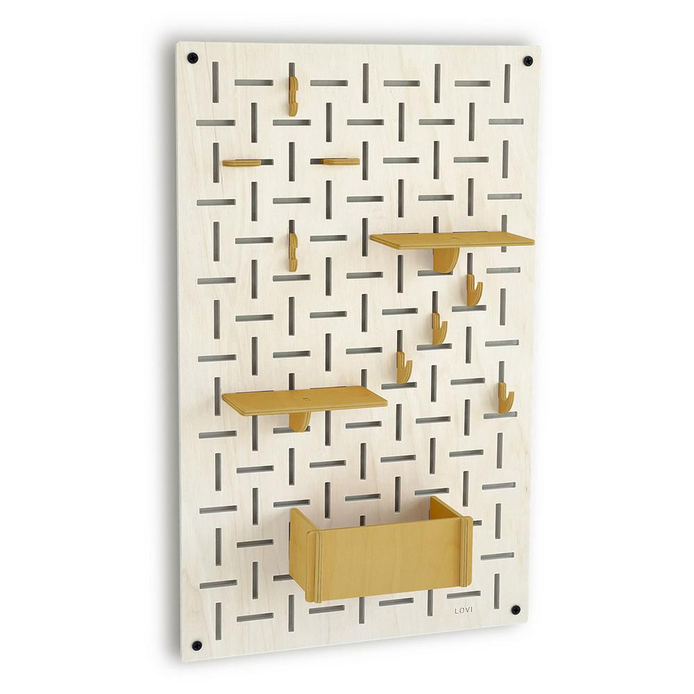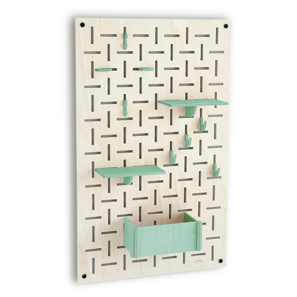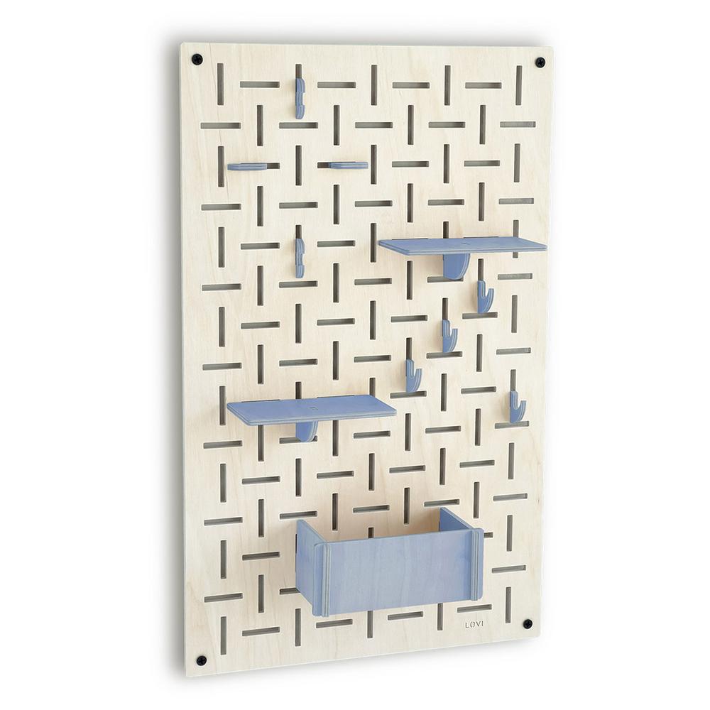 Lovi-sisustuslevy on näppärä apu kodin ja toimiston säilytystarpeisiin. Tiheä vaaka- ja pystysuuntainen rei’itys luo kauniin kuvion ja mahdollistaa koukkujen ja hyllyjen monipuolisen sijoittelun.