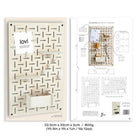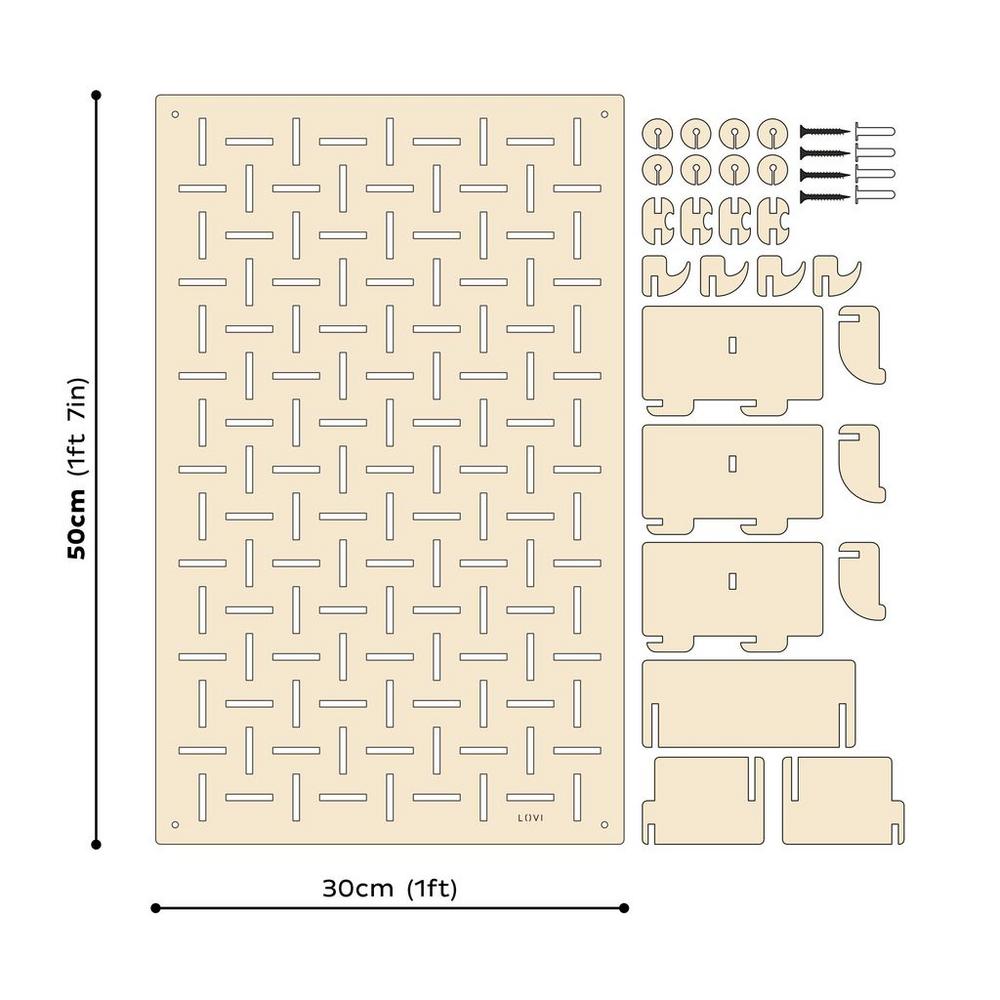 Pakkaukseen kuuluu viisikerroksisesta hienovanerista (paksuus 4 mm) valmistettu sisustuslevy (koko 30 x 48 cm), neljä koukkua, neljä minikoukkua/kortin pidikettä ja kolme hyllylevyä (koko 11,5 x 6 cm), joista yhden voi muuttaa hyllylaatikoksi pakkauksen mukana tulevien hyllyseinien avulla. Mukana on myös neljä Mustaa puuruuvia (3,8 x 32 mm), erilaisille seinämateriaaleille soveltuvat ruuvitulpat ja puiset prikat, joilla levyn saa kiinnitettyä 8 mm:n etäisyydelle seinästä. Levyssä on 135 reikää (reiän koko 3 cm x 4 mm) ja jokaisessa kulmassa on reikä kiinnitysruuville.