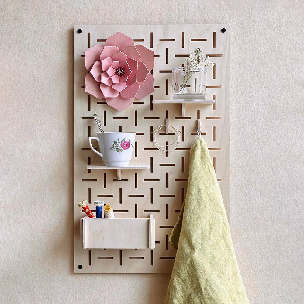 Kiinnitä Lovi-sisustuslevy eteiseen, olohuoneeseen, keittiöön tai kotitoimiston seinälle. Säilytä koukuissa avaimia, koruja tai puhelimenlaturia, hyllyillä on tilaa matkamuistoille, pienille kasveille tai koriste-esineille ja hyllylaatikossa pysyvät tallessa kodin pientavarat tai puhelin. Valokuvat, kortit ja muut tärkeät paperit voit kiinnittää sisustuslevyyn pakkaukseen kuuluvilla minikoukuilla.
