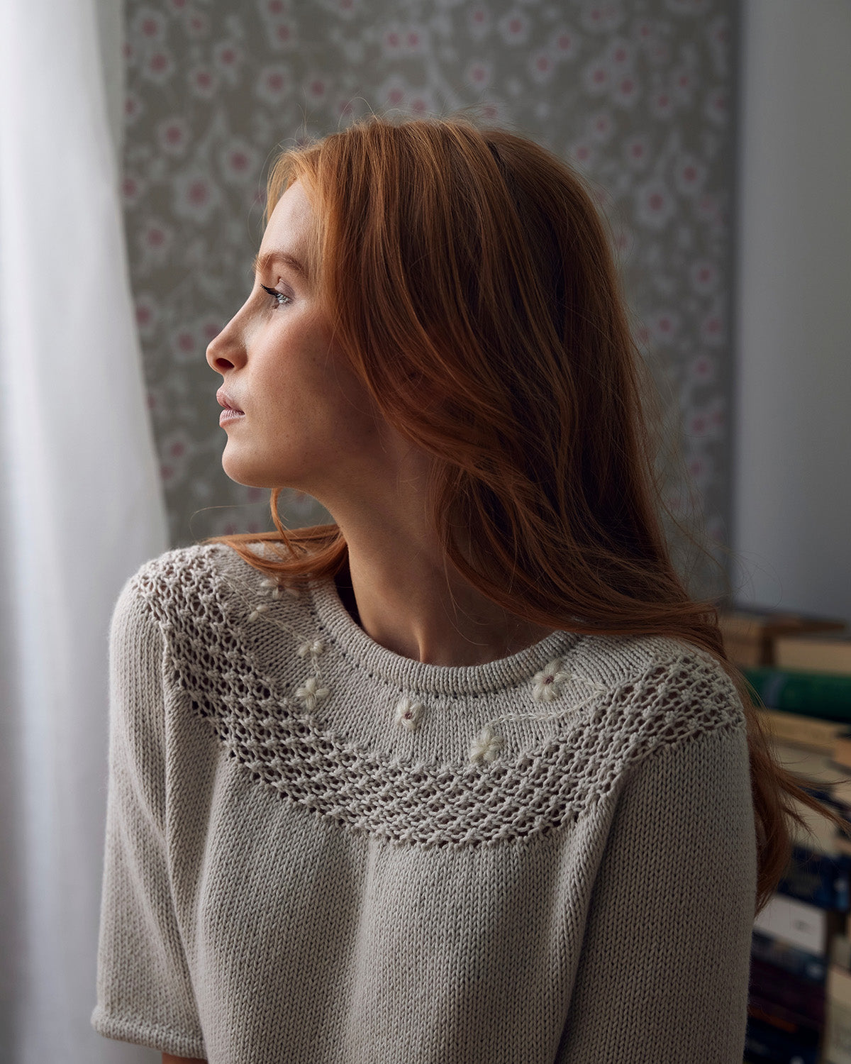 Lanka: 300–350 (350) 350400 (400) 450 g Sandnes Garn Duo -lankaa (115 m = 50 g), väri kitti 1015. Kirjontaan pieni määrä valkoista mohairlankaa, esimerkiksi Sandnes Garn Tynn Silk Mohair, sekä Sandnes Garn Duo väriä Powder Pink 4032 kukkien keskustaan.