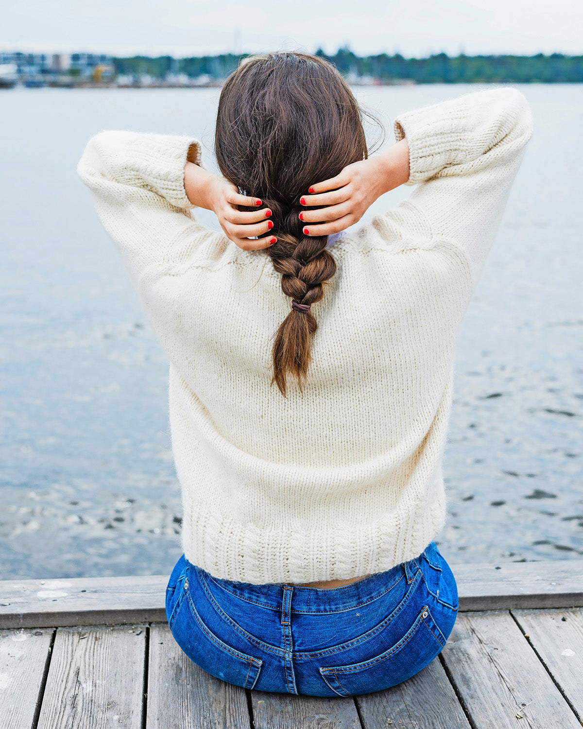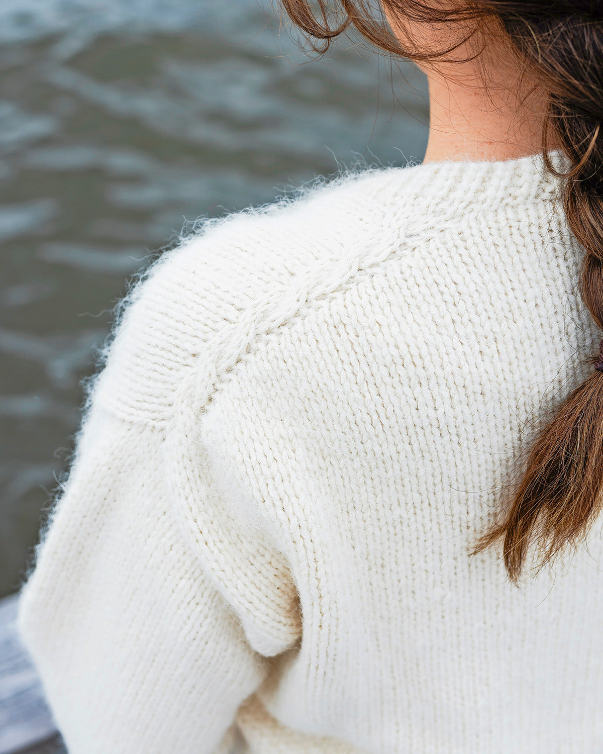 Anna Tanskasen suunnitteleman minimalistisen neulepuseron olkapäillä kulkevat kapeat palmikot. Pusero neulotaan ylhäältä alas, joten sen pituutta voi helposti muokata.