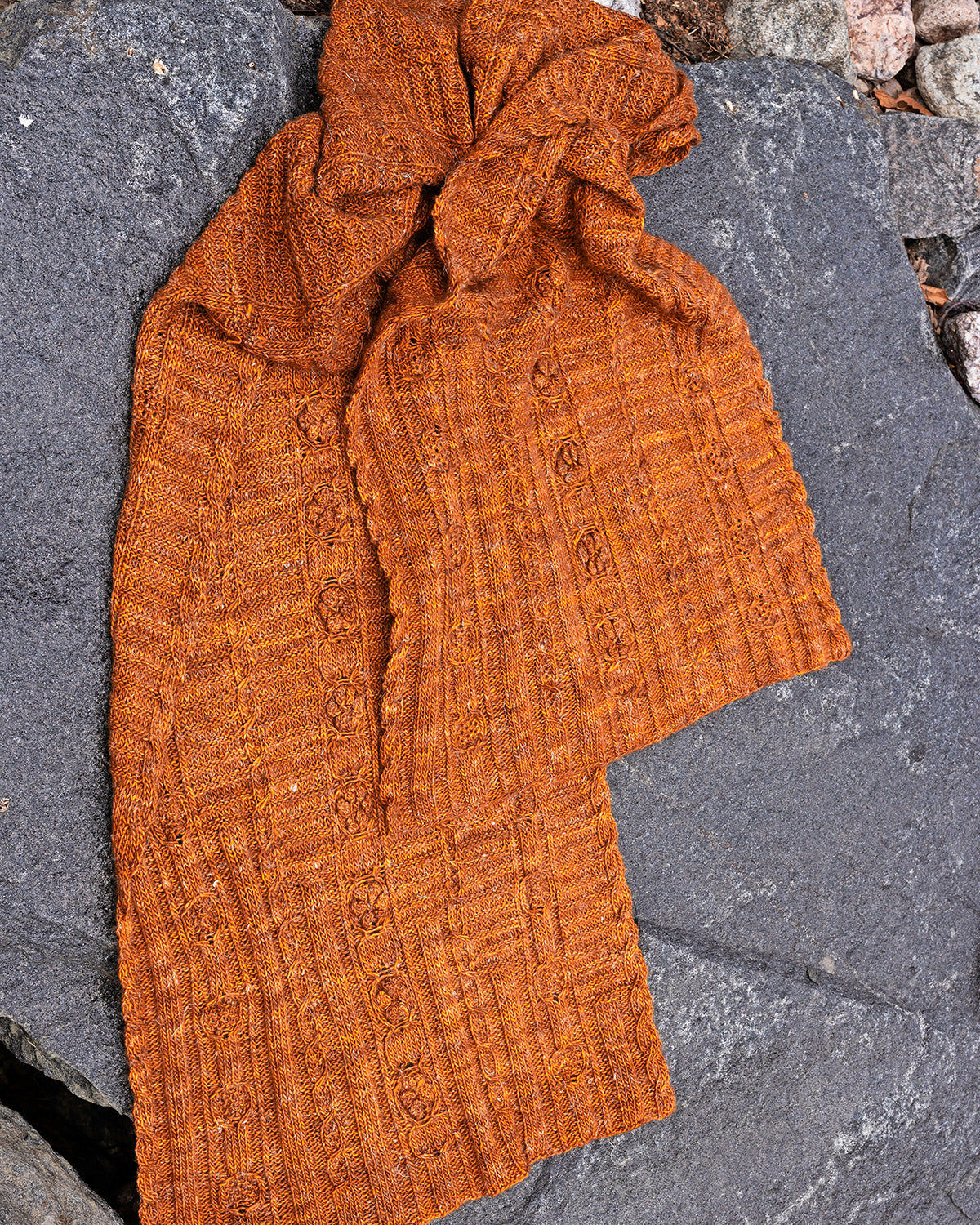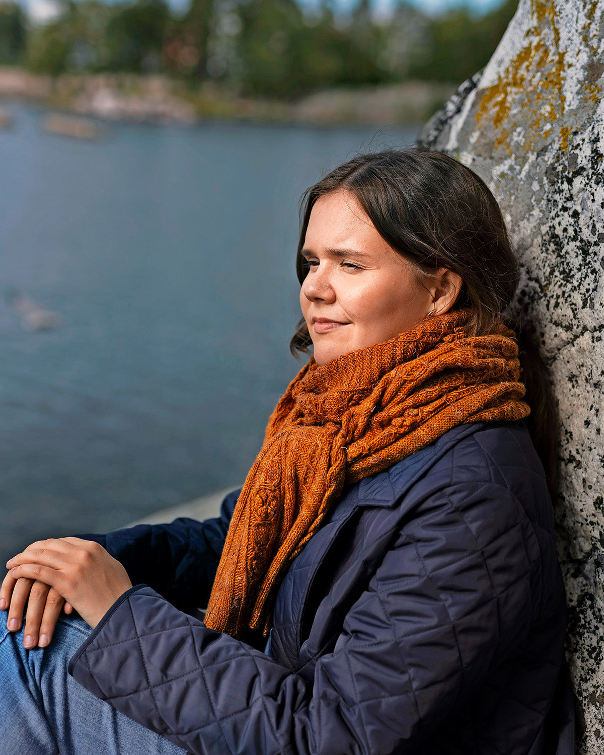 Susanna Kaartisen suunnittelema suorakaiteen muotoinen huivi syntyy erilaisista pintaneuleista. Oikeista ja nurjista silmukoista muodostuva kuvio ja palmikot vaihtelevat rytmikkäästi.