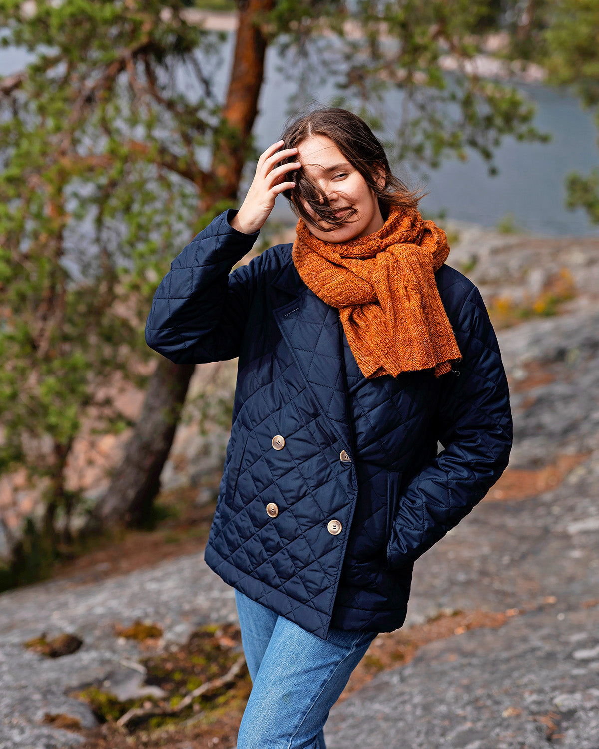 Lanka: Aara Lauha (90 % merinovilla, 10 % pellava, 366 m / 100 g) tai muu fingering-vahvuinen lanka. 4 vyyhtiä tai 1200 m. Kuvissa väri Amfora.