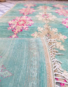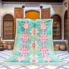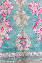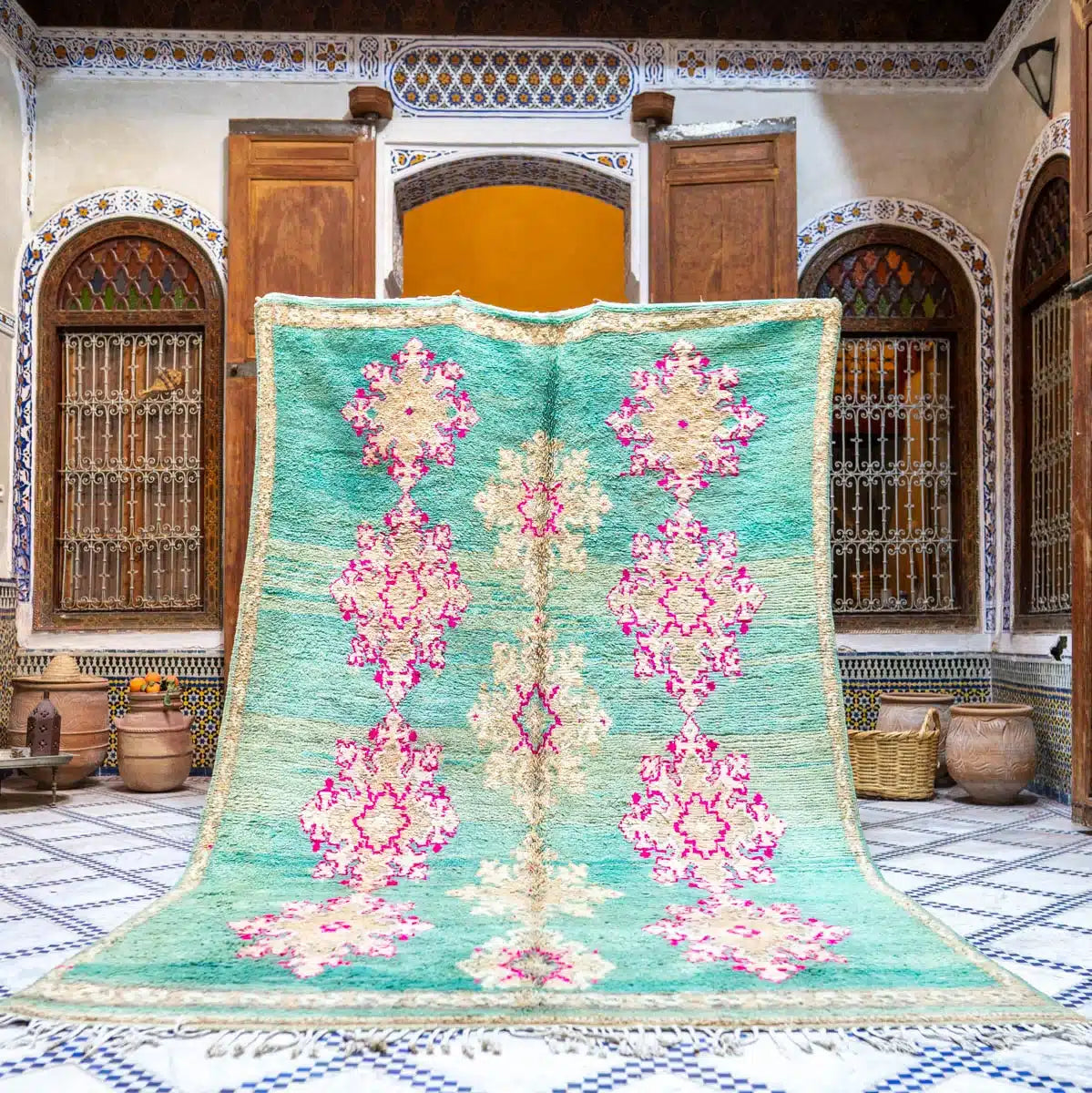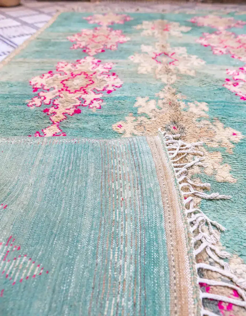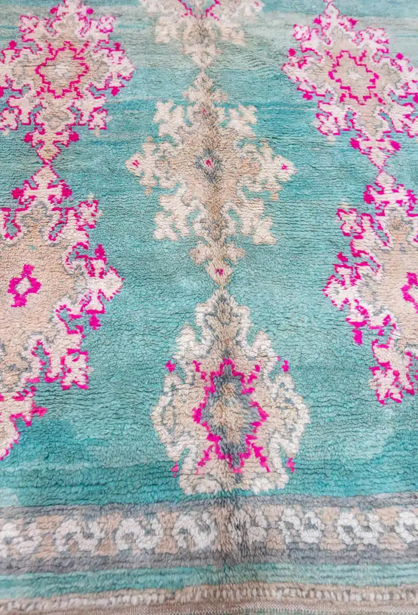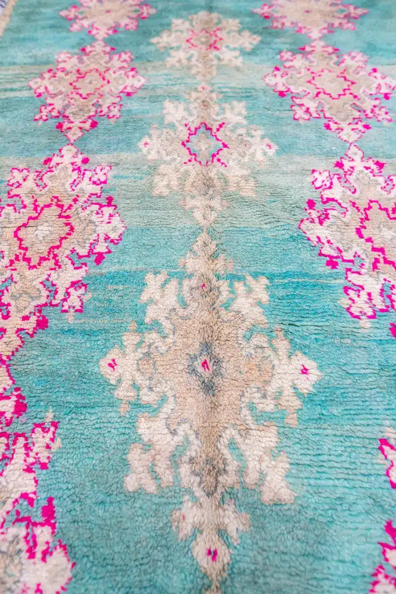 Tässä Mediouna vintage-matossa on turkoosinvärinen pohja, mitä näkee marokkolaisissa matoissa hyvin harvoin. Vivahteikkaan turkoosin pohjan päällä on koristeellinen symmetrinen kuviointi, joka on toteutettu pinkillä ja valkoisella. Lopputuloksena on todella raikas, tasapainoinen ja ainutlaatuinen kokonaisuus.