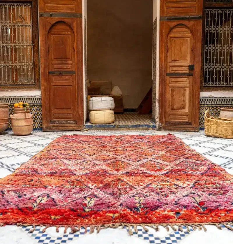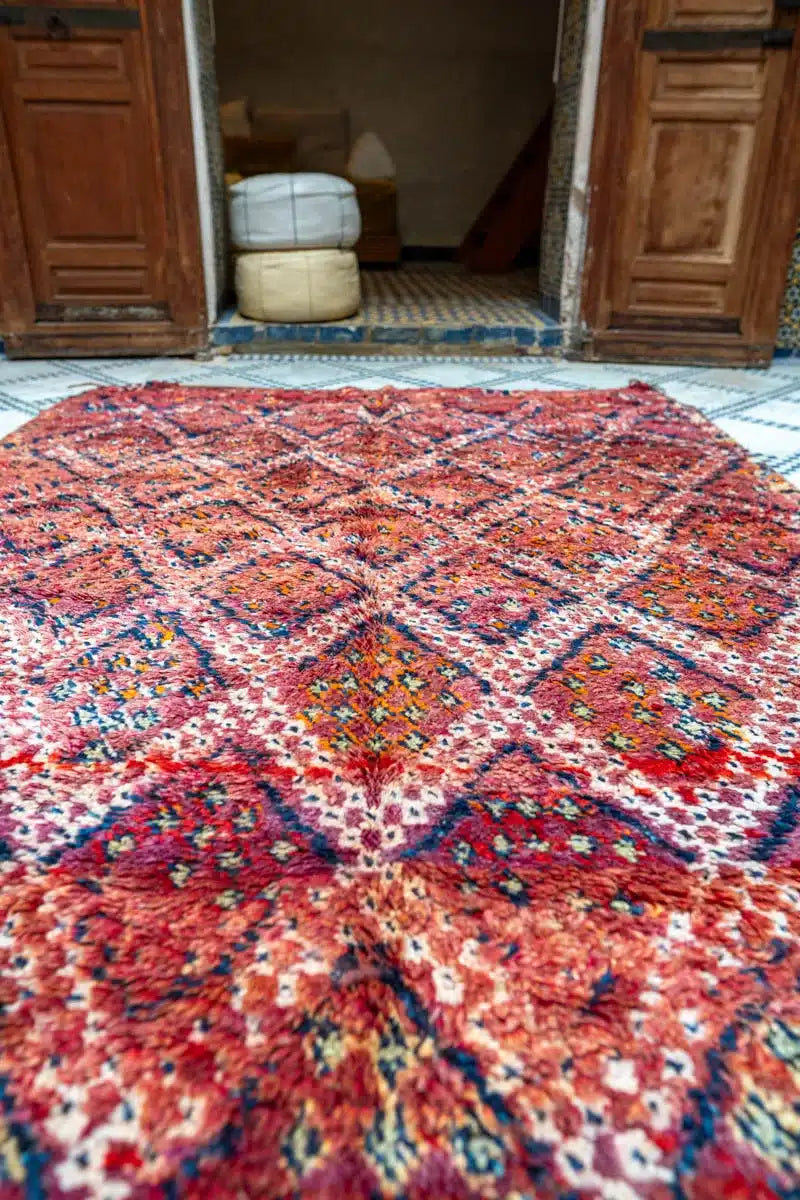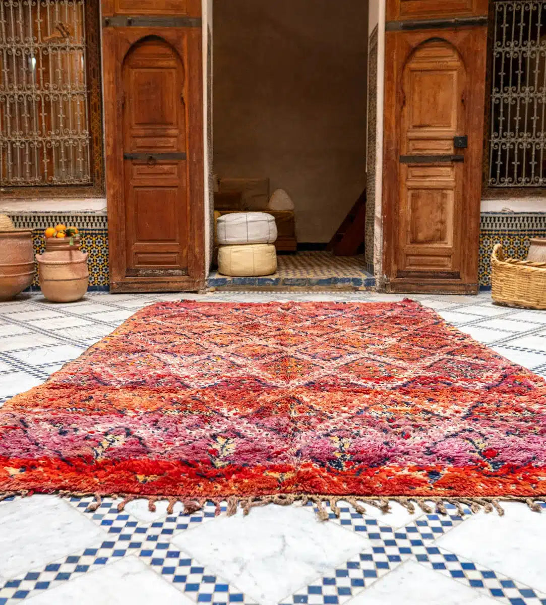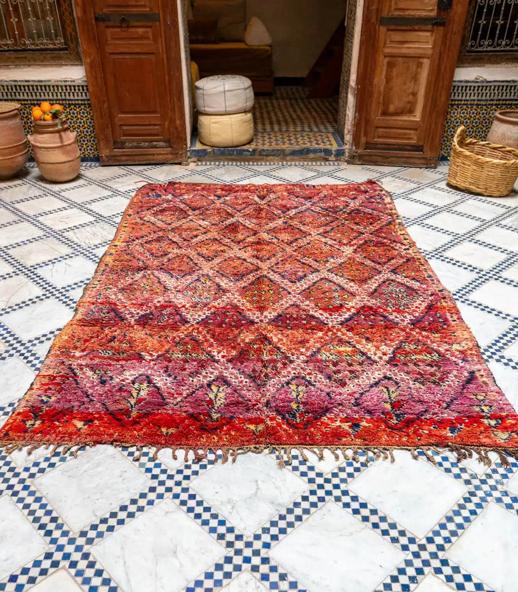 Sävykäs ja taidokkaasti sommiteltu marokkolainen vintagematto Beni M’Guild -heimolta. Punertavan oranssilla pohjalla rytmittyy symmetrinen timanttikuvio indigonsinisellä, lilalla, vihreällä, murretun vihreällä sekä ripauksella valkoista, joka pitää kokonaisuuden raikkaana.