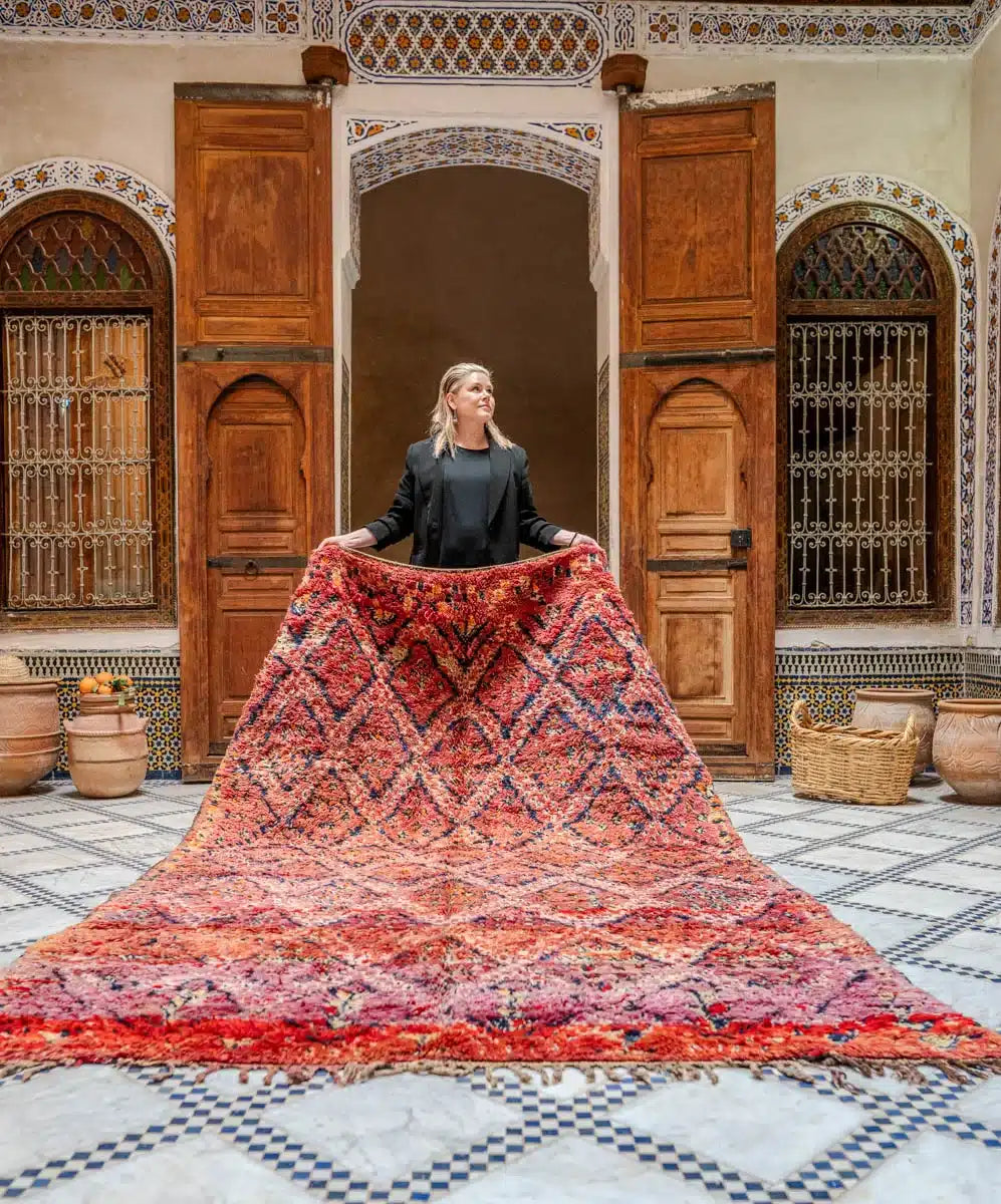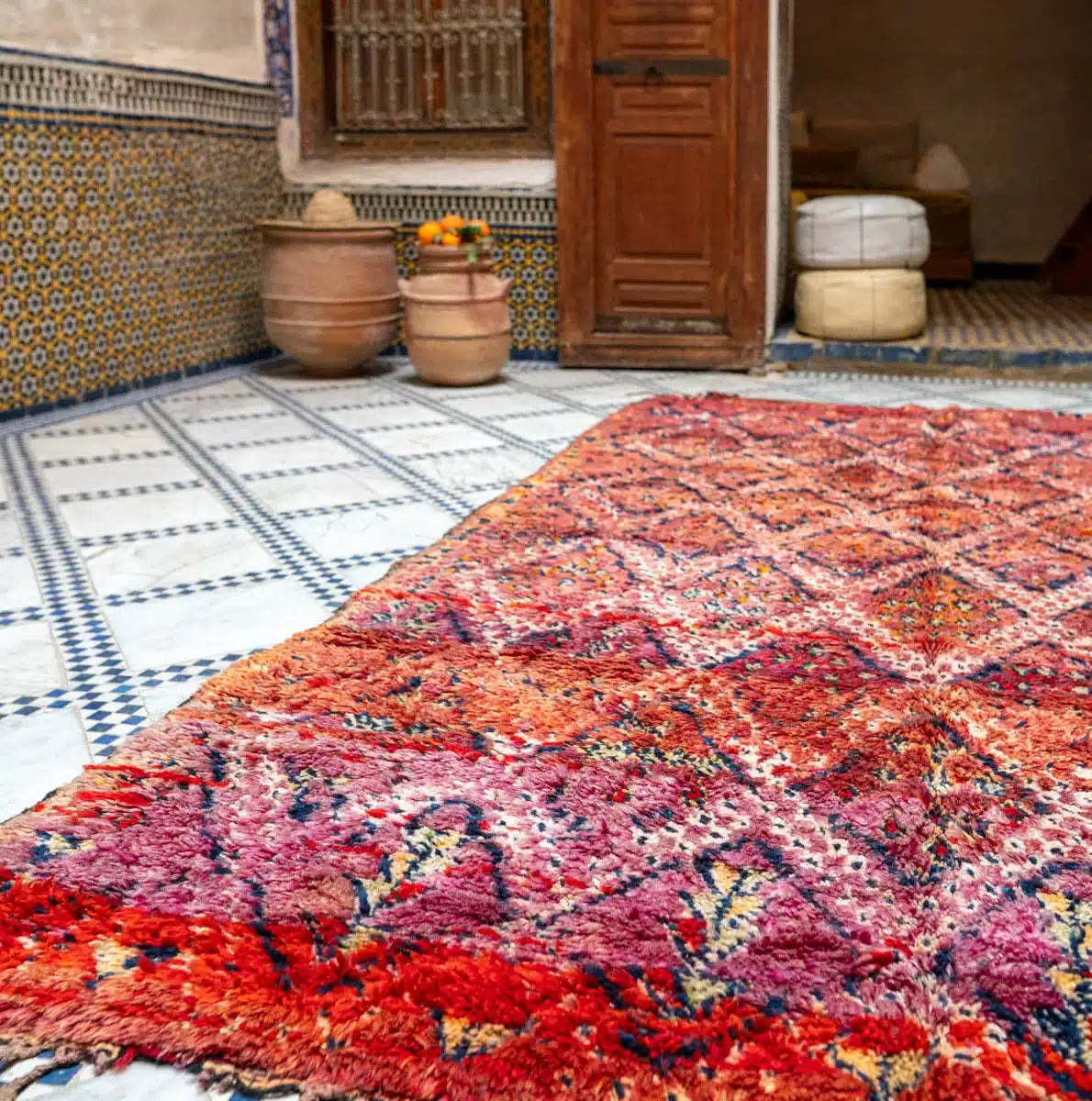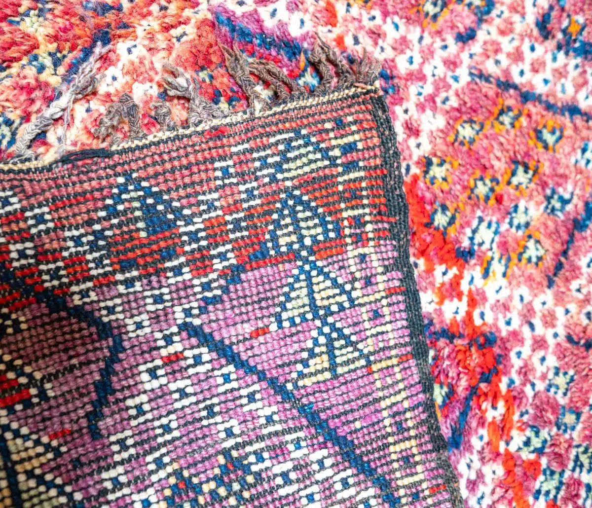 Sävykäs ja taidokkaasti sommiteltu marokkolainen vintagematto Beni M’Guild -heimolta. Punertavan oranssilla pohjalla rytmittyy symmetrinen timanttikuvio indigonsinisellä, lilalla, vihreällä, murretun vihreällä sekä ripauksella valkoista, joka pitää kokonaisuuden raikkaana.