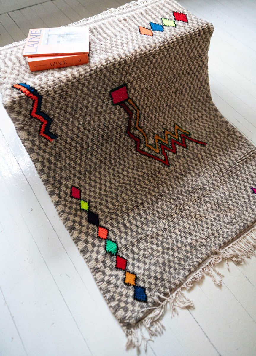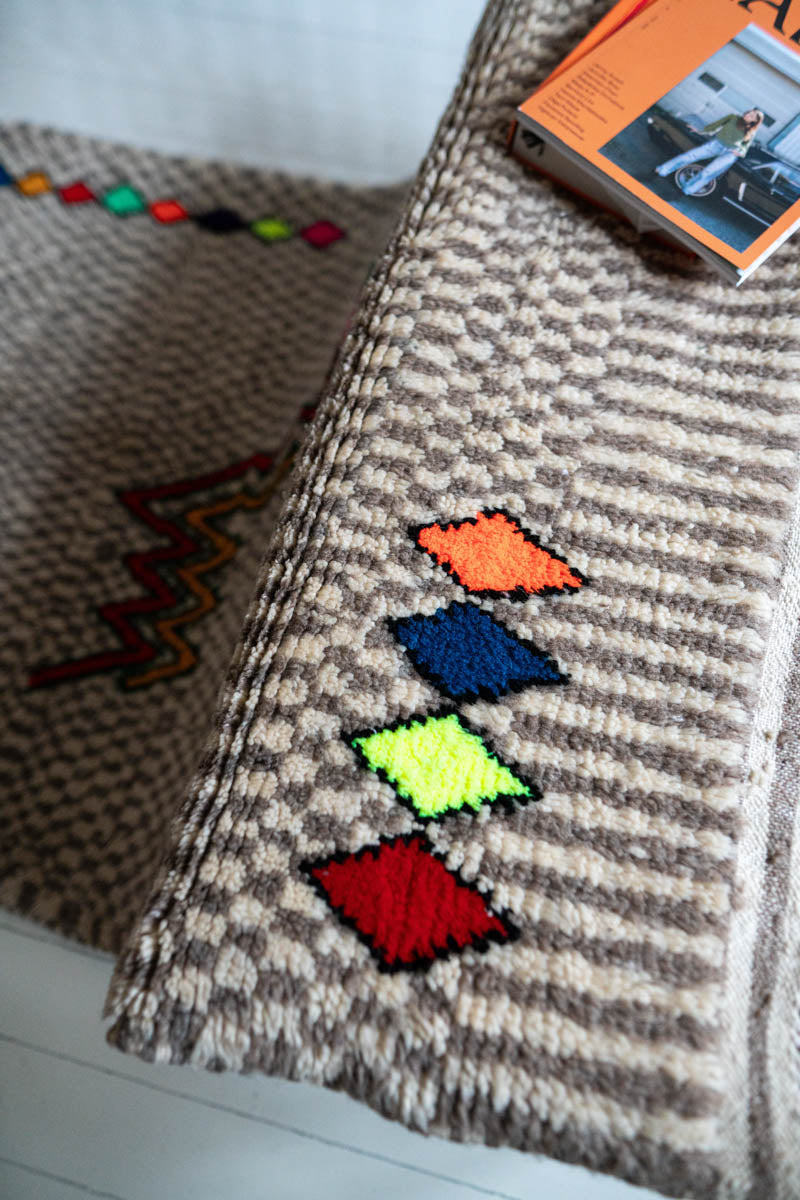 Visuaalisesti rohkea mutta hallitun tasapainoinen marokkolainen vintagematto Azilal-heimolta. Harmaa-valkoinen ruutukuvio luo rauhallisen taustan kirkkailla neonväreillä solmituille symboleille. Leikkisät yksityiskohdat tuovat mattoon energiaa, rytmiä ja kerroksellisuutta.