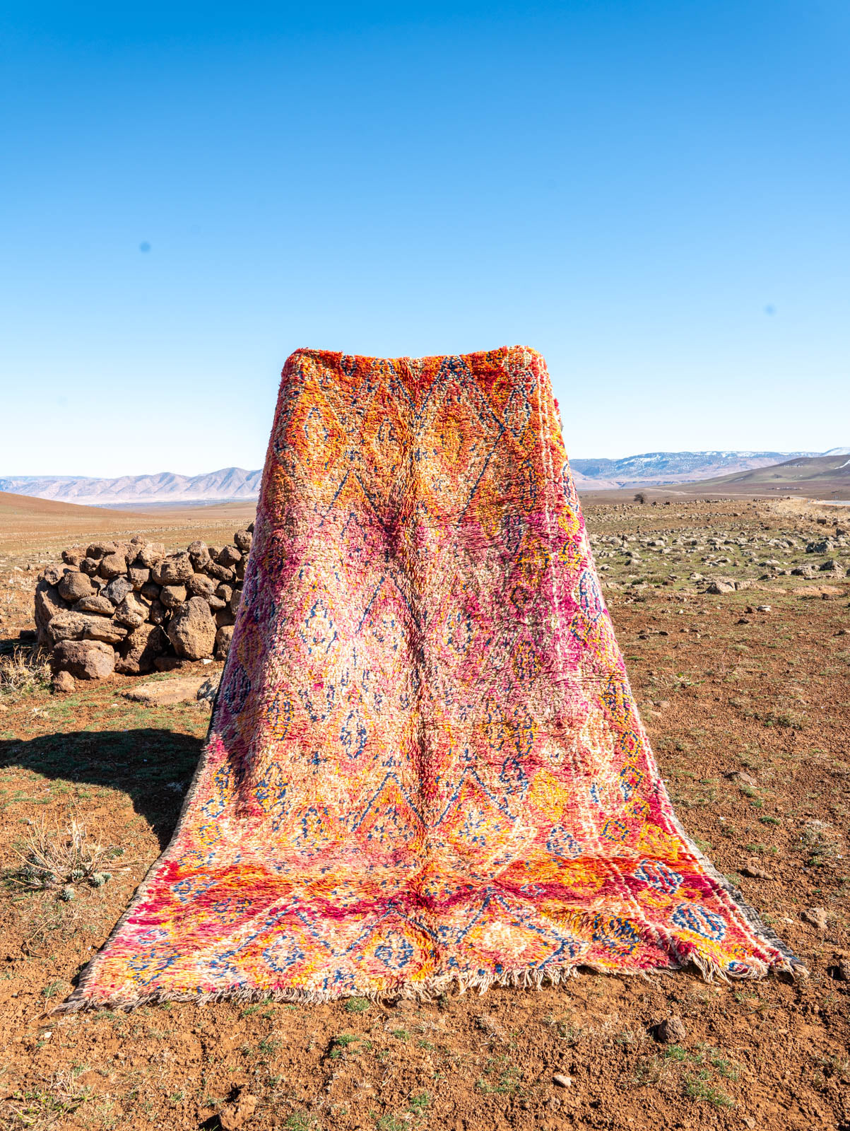 Aito marokkolainen Beni M’Guild vintage-matto oranssin ja vaaleanpunaisen vivahteikkaissa väreissä. Perinteinen symmetrinen timanttikuvio rakentuu sinisen, luonnonvaalean, vihreän ja keltaisen tasapainoisista sävyistä.
