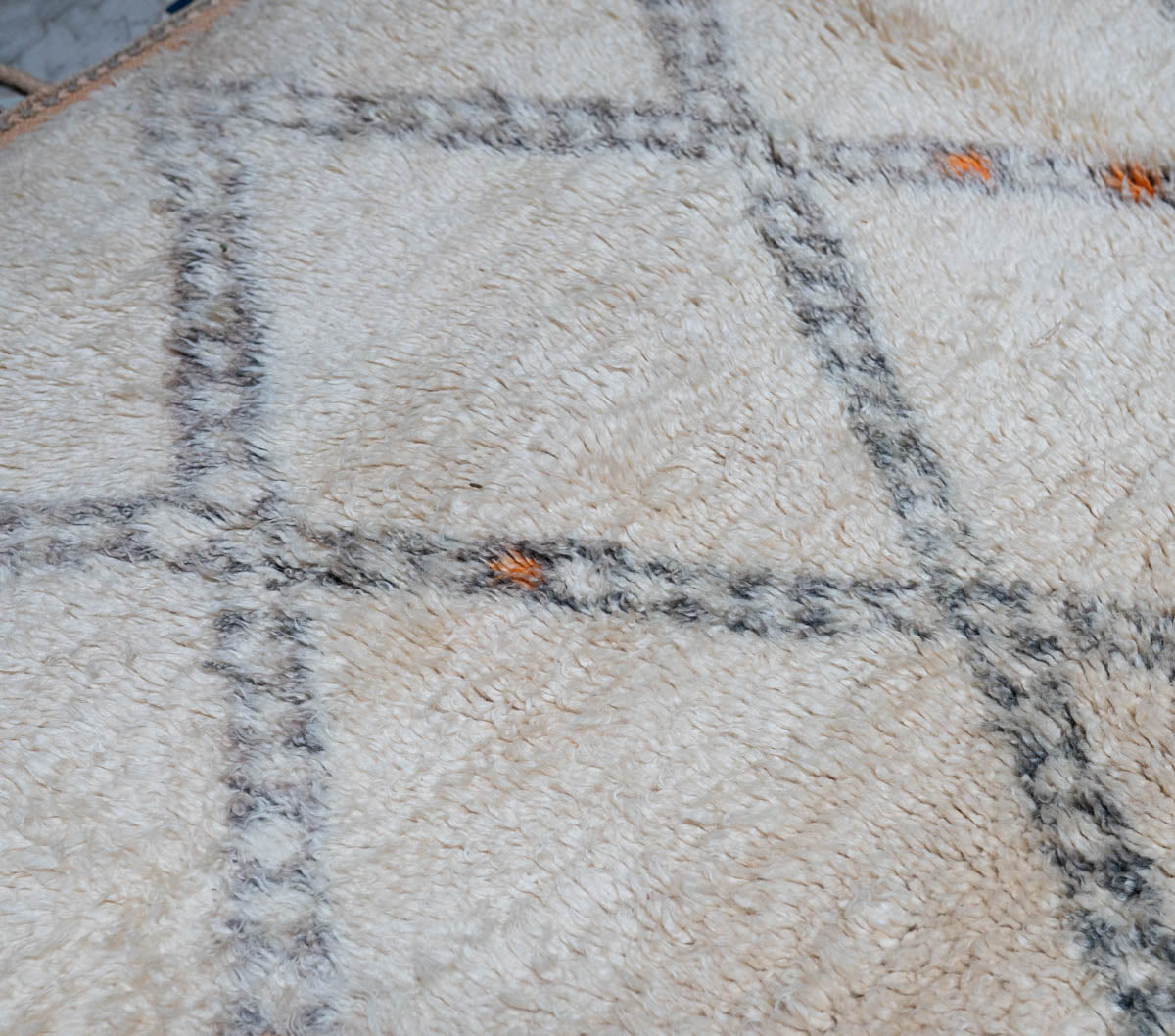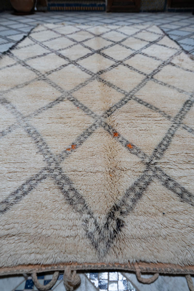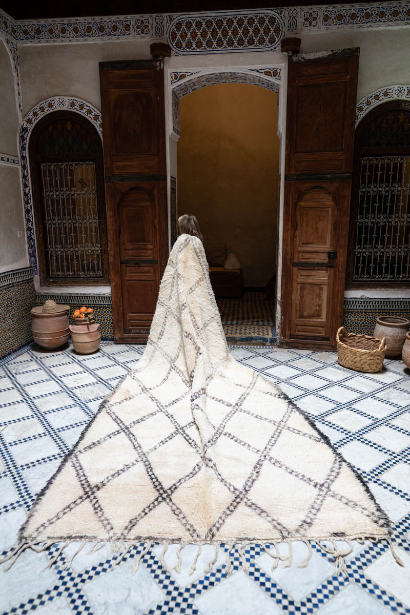 Tämä ainutlaatuinen Beni Ouarain -matto on kudottu käsin pehmeästä ja hohtavasta villasta, jonka laatu hivelee aisteja. Luonnonvaalealle pohjalle piirtyy perinteikäs timanttikuvio ja yksinkertainen kehys, jotka on solmittu luonnonväreillä värjätystä tummasta villasta – sävyn tummuusaste vaihtelee luoden eläväisen ja moniulotteisen vaikutelman. Pienet yksityiskohdat lämpimän oranssissa sävyssä tuovat hienovaraista kontrastia ja persoonallisuutta kokonaisuuteen. Ajaton klassikko, jossa yhdistyy hillitty eleganssi ja berberikäsityön syvä sielu. Matto toimitetaan Marokon varastolta, toimitusaika 2–3 viikkoa.