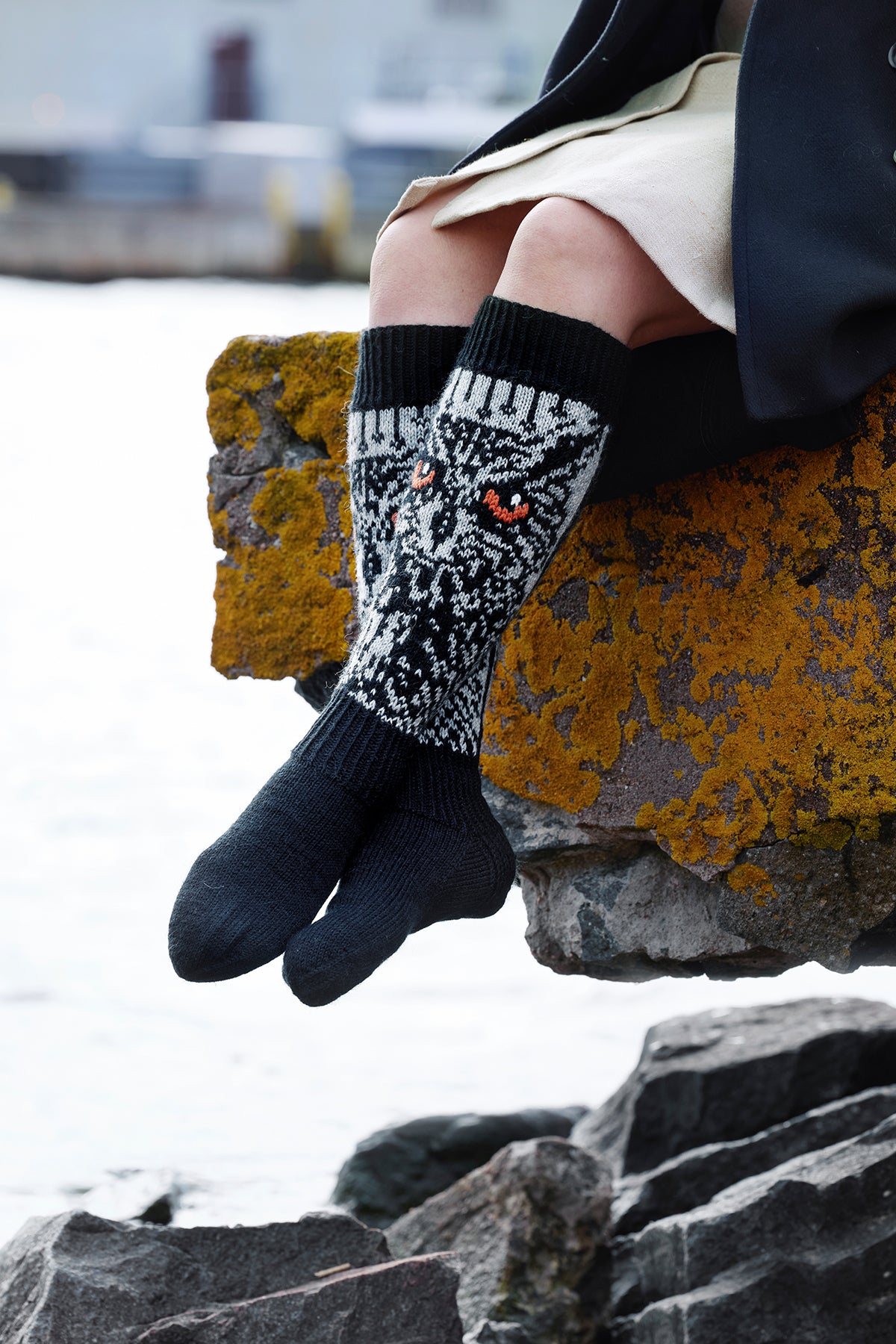 Näyttävät sukat neulotaan varresta varpaisiin. Huuhkajan silmät silmukoidaan jälkeenpäin.