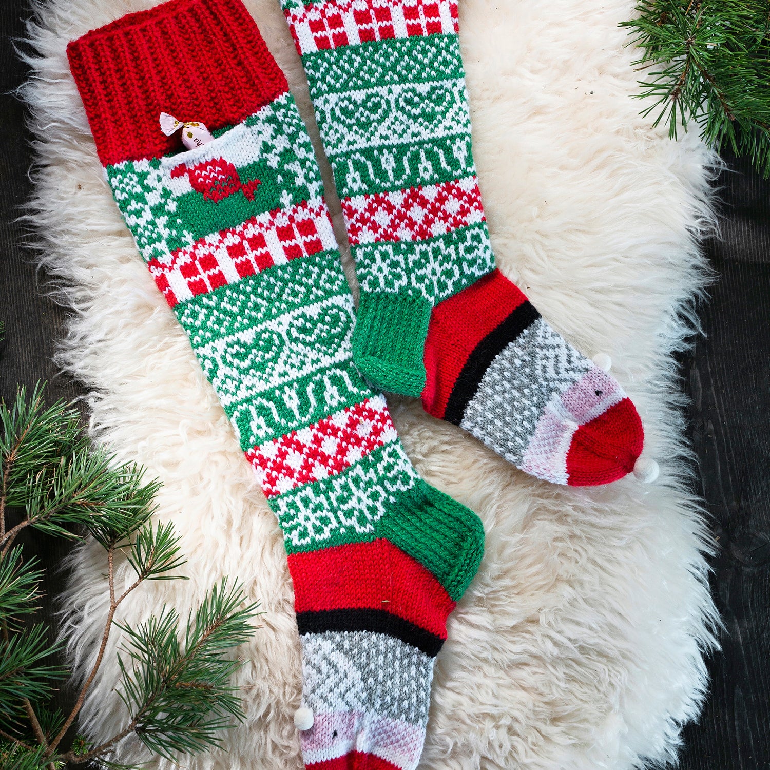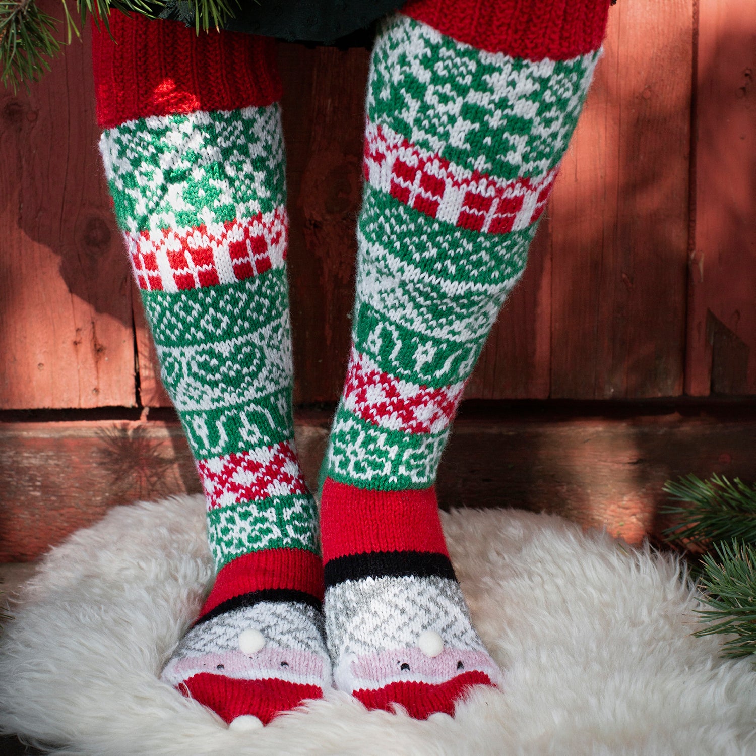 Neulo Joulupukin karkkipiilo -villasukat hauskojen jouluvillapaitojen hengessä. Varresta löytyvään taskuun voit kätkeä aattoillan lempikarkit. Pitkävartiset sukat on suunnitellut Kati Rahikainen.