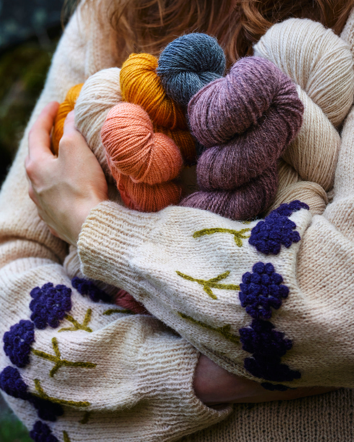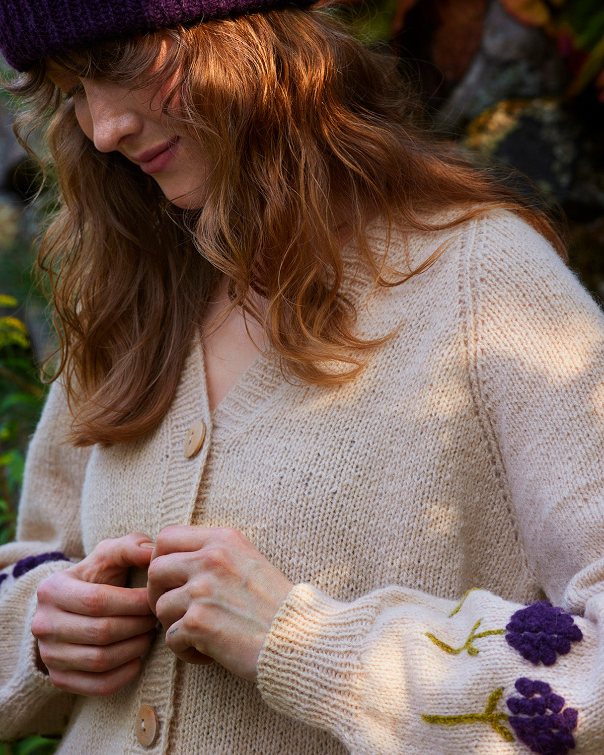 Liivia-takki neulotaan ylhäältä alaspäin. Hihat muodostuva raglan-lisäyksin ja hihan alaosaa koristaa neulotuista nypyistä tehdyt kukat.
