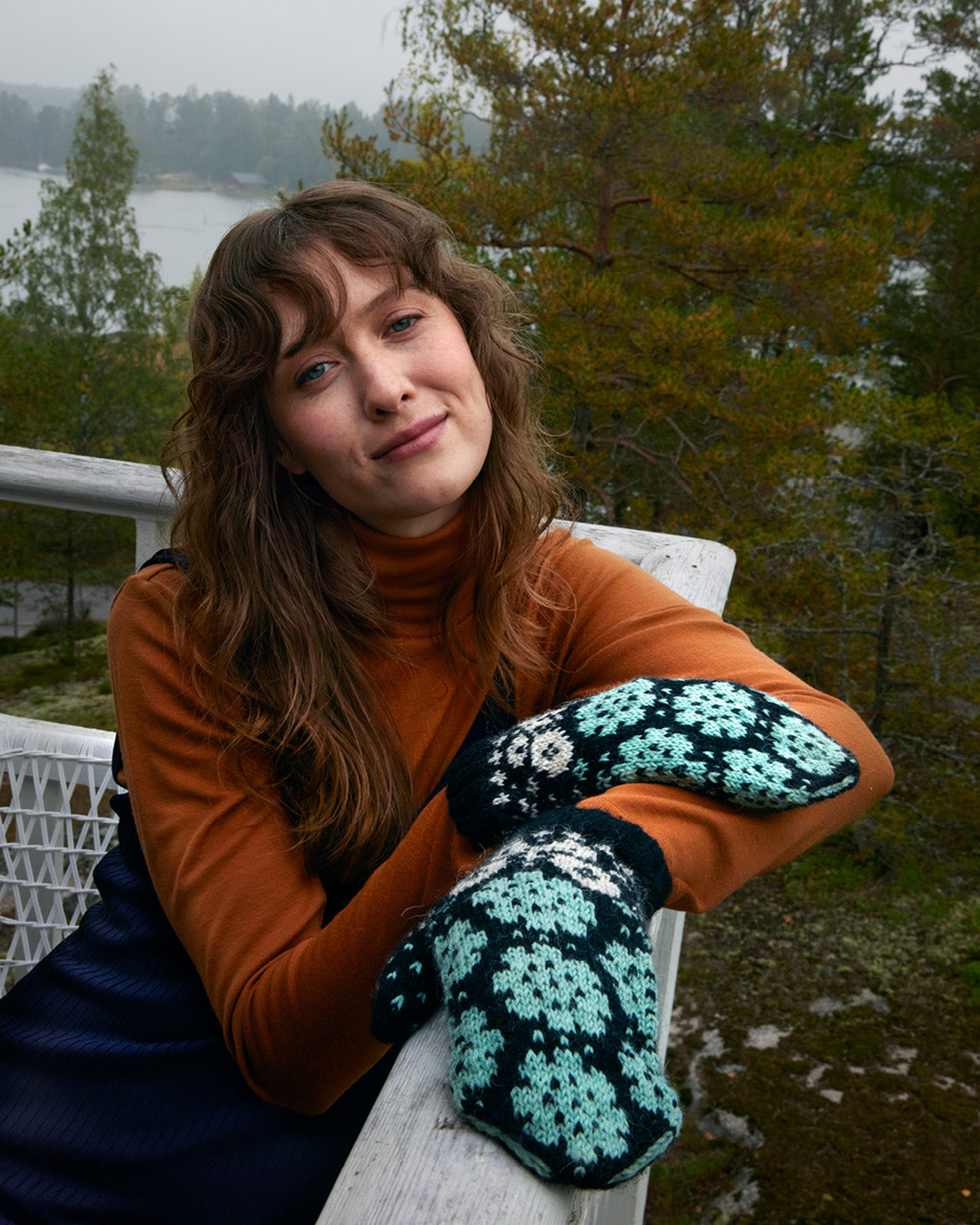 Lapasia koristaa kirjoneuleena tehtävä kukka- ja perhoskuvio.