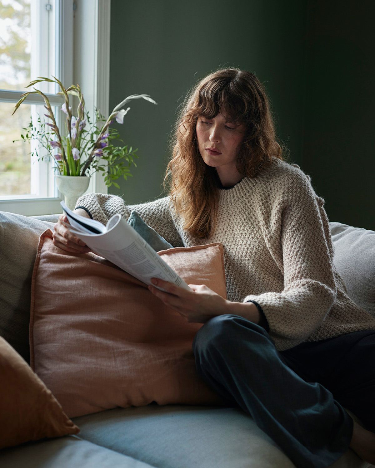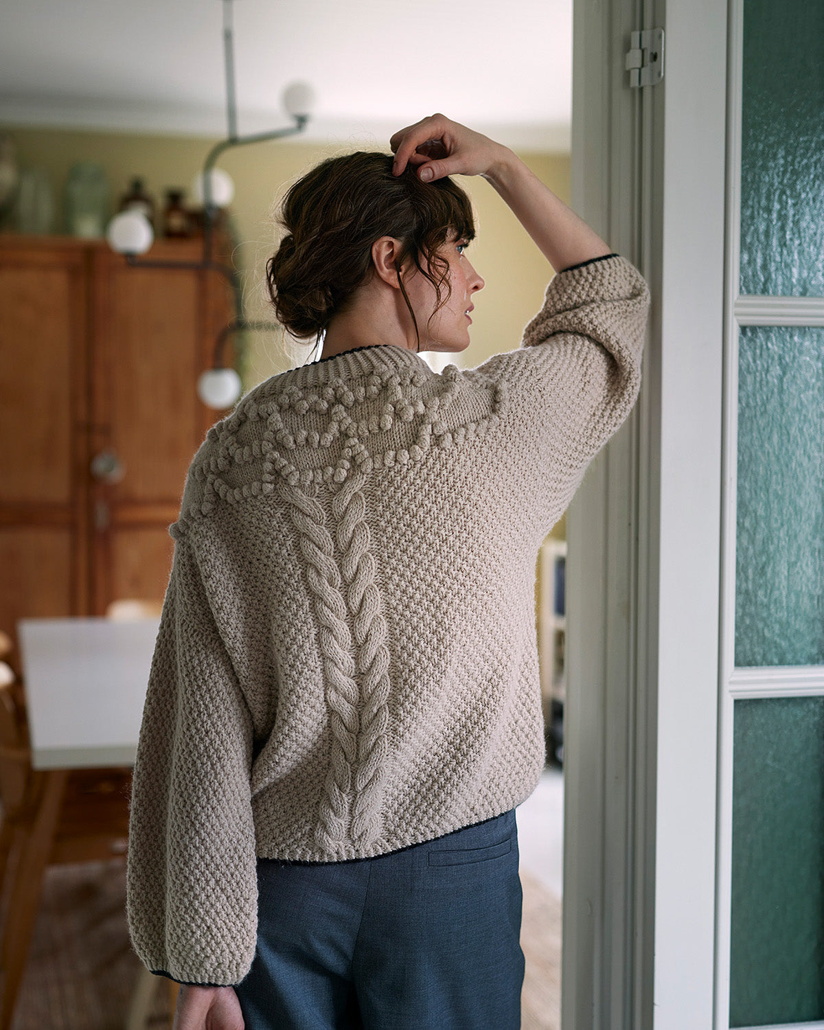 Lanka: PV: Sandnes Garn Double Sunday (108 m / 50 g) 550 (550) 600 (650) 700 (800) g sekä Sandnes Garn Alpakka Fölgetråd (400 m / 50 g) 150 (200) 200 (200) 200 (200) g KV: 1099 Black (Double Sunday) 15 (15) 15 (25) 25 (25) g. Pusero neulotaan kaksinkertaisella langalla, paitsi resorin reunat, jotka neulotaan yksinkertaisella KV:llä. PV: 2321 Marsipaani (Double Sunday), 2321 Marsipaani (Alpakka Fölgetråd) KV: 1099 Musta (Double Sunday)