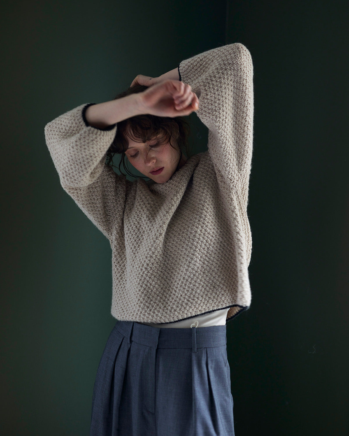Paita neulotaan kaksinkertaisella langalla ylhäältä alas. Pintaan syntyy utuinen tuntu pörröisen langan ansiosta.