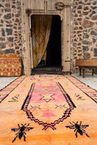 Tämä kaunis marokkolainen Boujaad-vintage­matto hurmaa vivahteikkailla oranssin, persikan, pinkin ja violetin sävyillään. Ilme on elävä ja värikäs, mutta harmoninen väripaletti ja pohjan sävyjen pehmeä liukuma tekee kokonaisuudesta tasapainoisen.