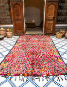 Kuviointi rakentuu eläväisesti monimuotoisten timanttisymbolien ja tummien reunusten välille. Raikkaan punainen pohjaväri on tämän maton sielu, ja sen päällä värit – pinkki, vihreä, oranssi ja valkoinen – piirtävät kuvion esiin taitavasti ja vaikuttavasti. Sommitelma on yhtä aikaa energinen ja harmoninen.