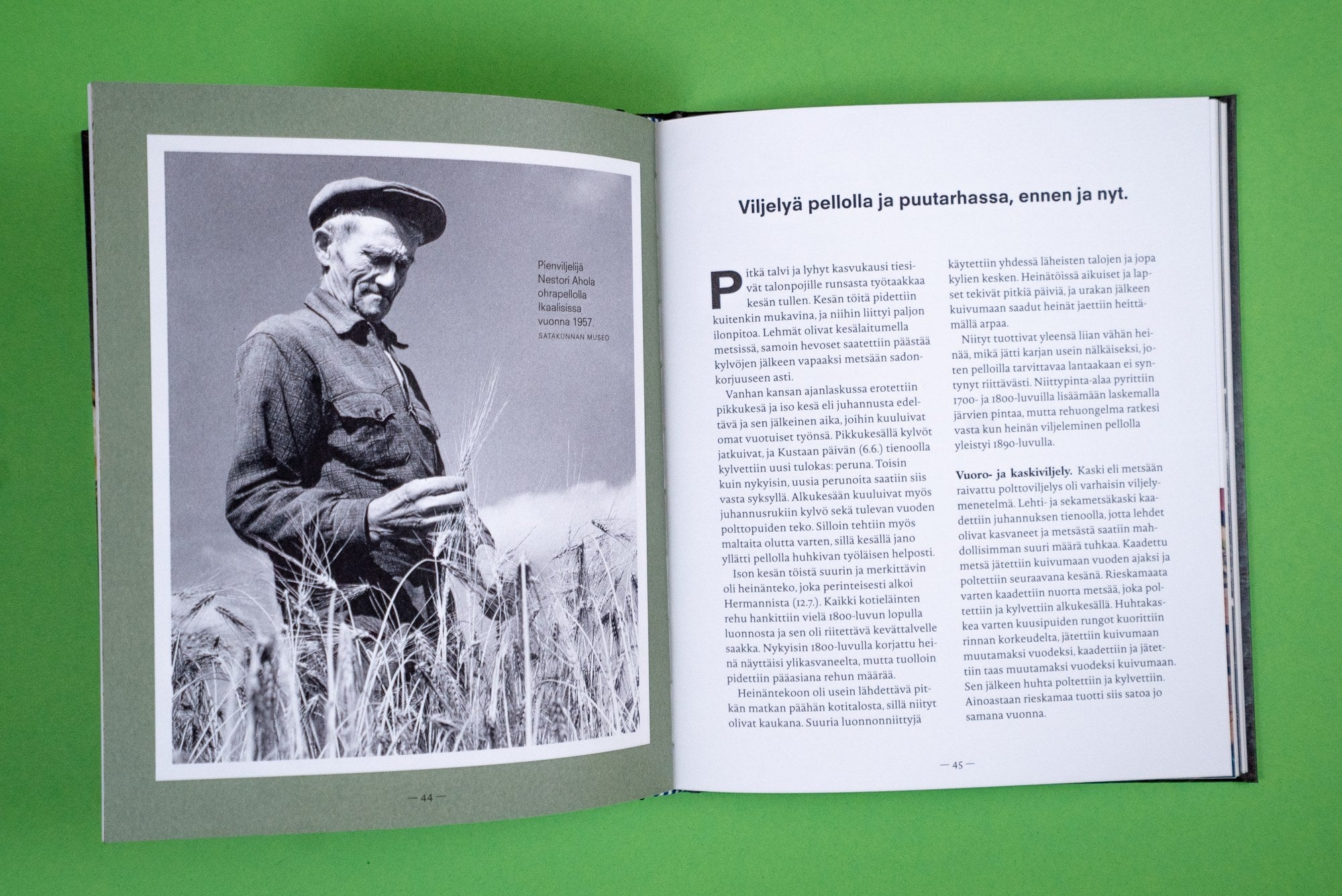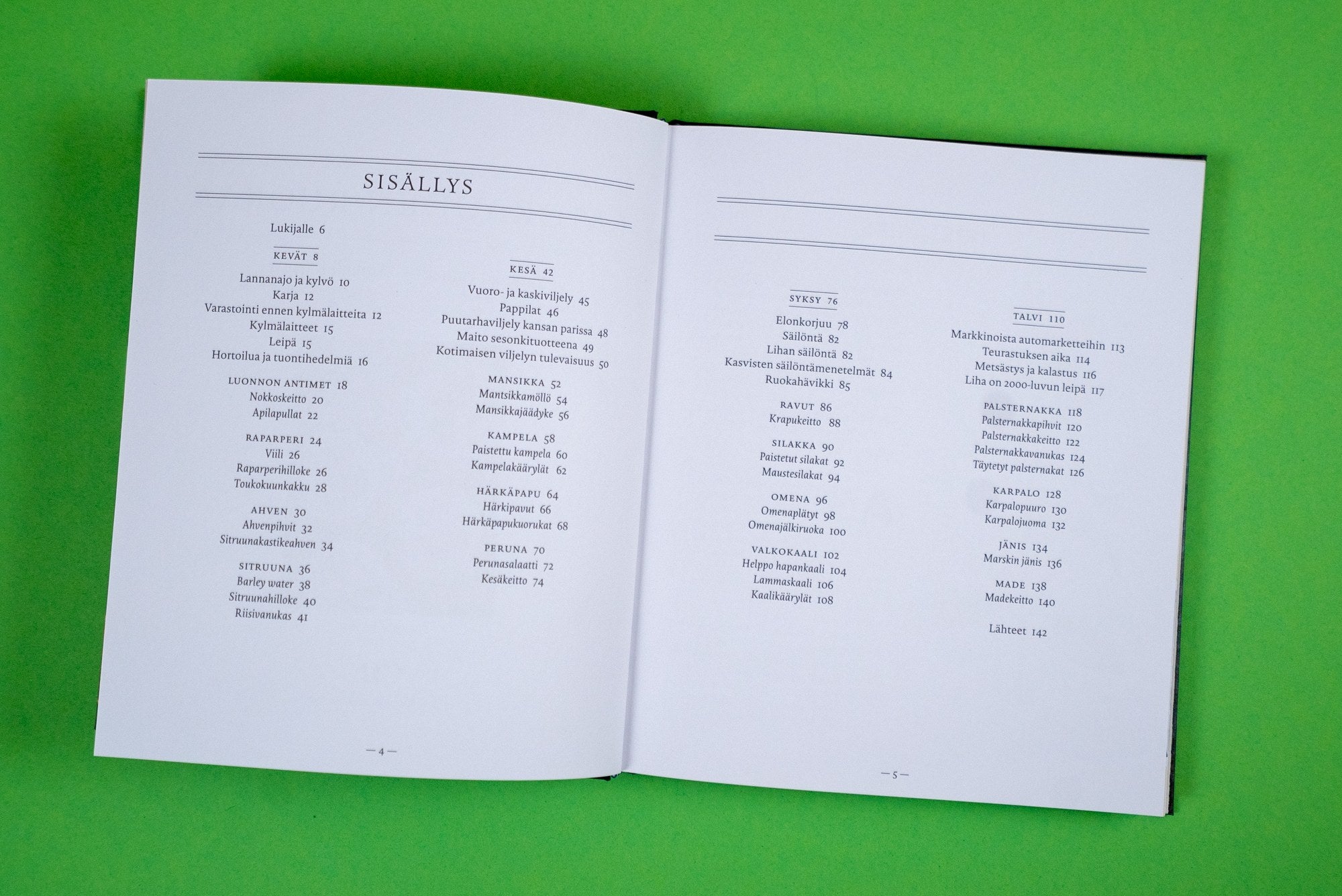 Ruoan valmistus satokausien mukaan on kansainvälinen ilmiö, jolla on Suomessa vahvat juuret. Kirja valottaa kotimaisen sesonkiajattelun kehitystä 1800- ja 1900-luvun taitteesta nykypäivään. Vanhoista reseptikokoelmista poimitut ruokaohjeet on päivitetty 2010-luvun keittiöön sopiviksi. Kunkin vuodenajan parhaista raaka-aineista valmistuvat mm. härkäpapufalafelit, täytetyt palsternakat ja helppo hapankaali.