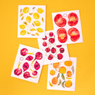 - 5 kpl setti, 5 eri kuosia (punasipuli, tomaatti, kirsikka, appelsiini ja sitruuna)