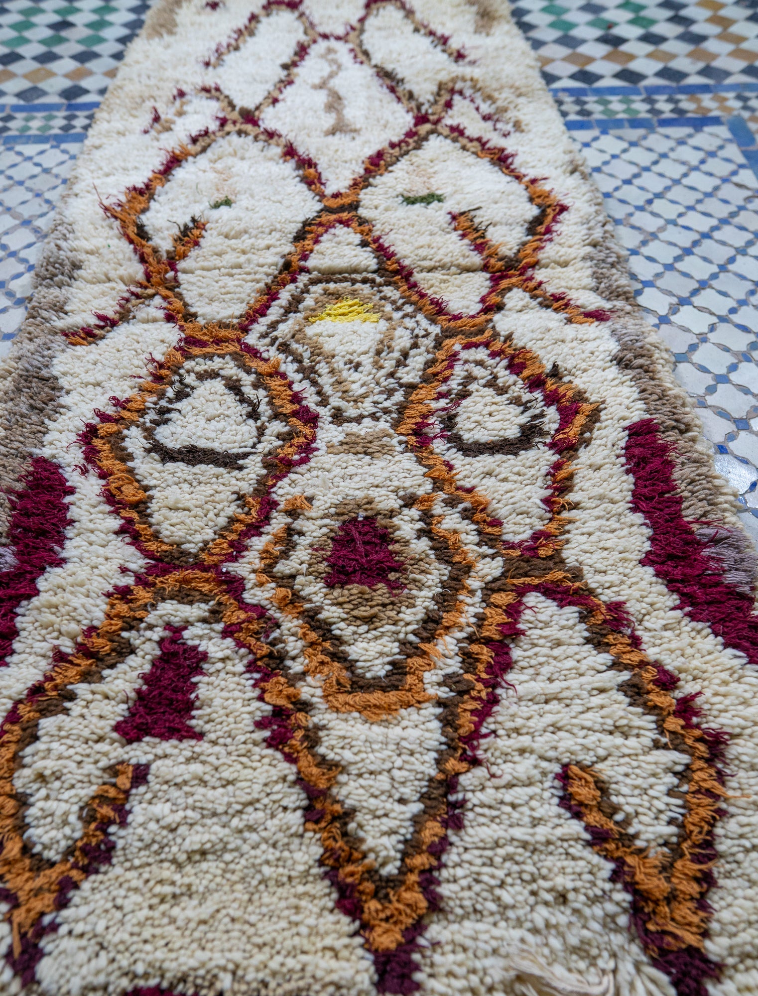 Persoonallinen marokkolainen vintage-Boucherouite, jossa yhdistyvät pehmeä villa, kierrätystekstiilit ja elävä käsityön tuntu. Luonnonvaalea pohja antaa rauhallisen taustan maton puhuttelevalle, abstraktille kuviolle. Pinnan tekstuuri on miellyttävän pehmeä ja elävä, kuten aidoissa Boucherouite-matoissa kuuluukin.