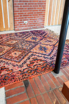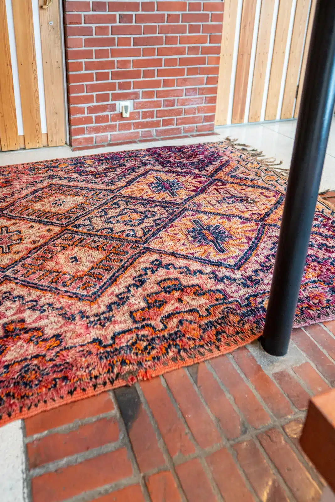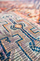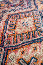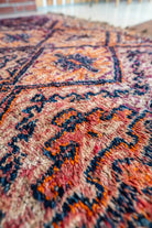 Aito marokkolainen Beni M’Guild vintage-matto oranssin, persikan ja lilan sävyissä. Maton näyttävyyden kruunaa kaunis, hyvin erottuva symmetrinen timanttikuvio runsailla yksityiskohdilla.
