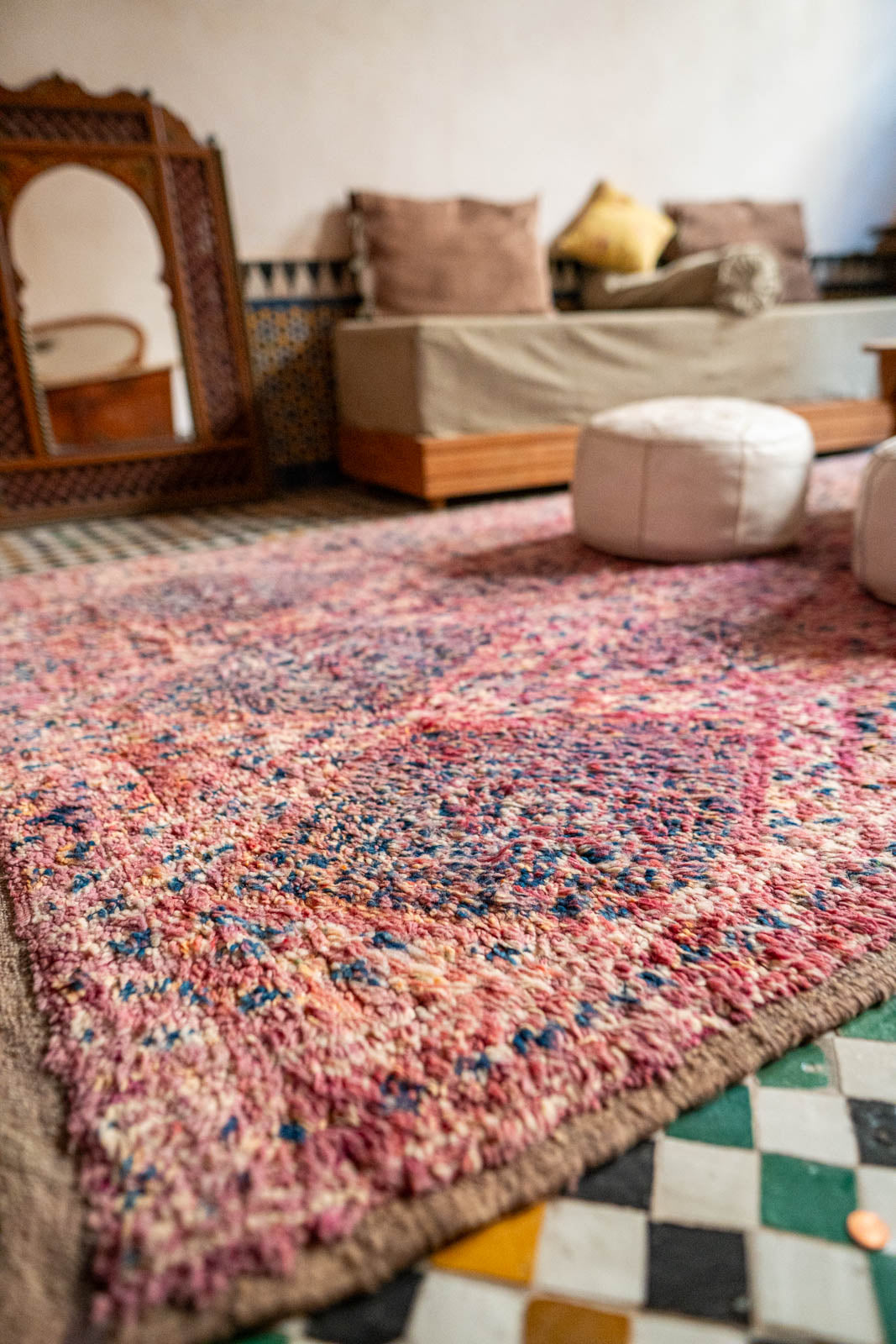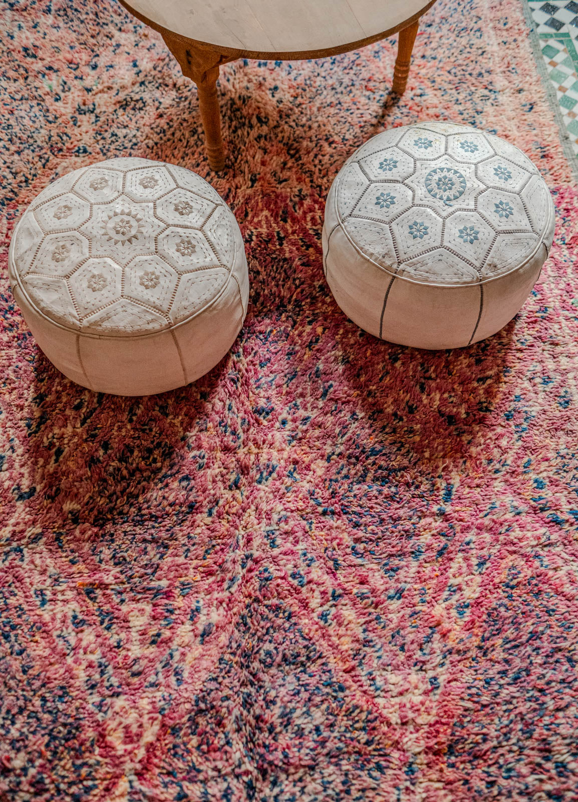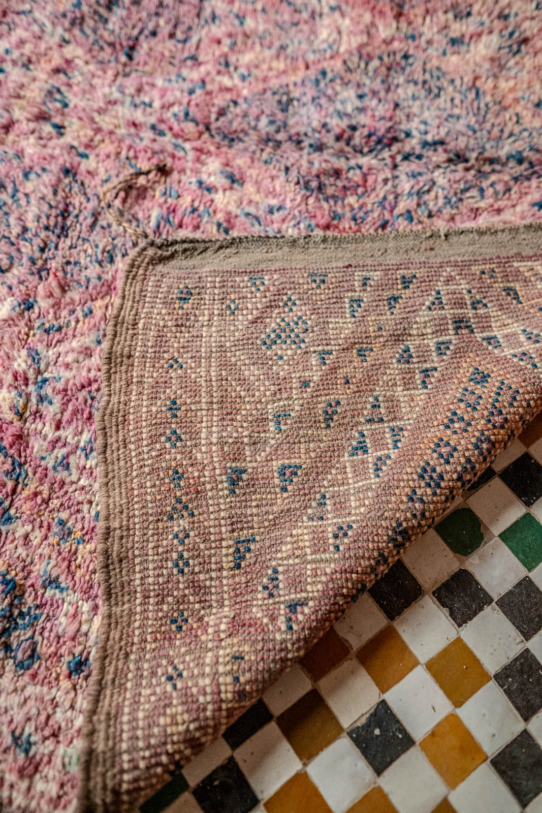 Aito marokkolainen vintage-matto Beni M’Guild -heimolta pehmeissä vaaleanpunaisen ja persikan sävyissä. Kaunis symmetrinen timanttikuvio on toteutettu hienovaraisesti sinisellä värillä sekä erilaisilla vaaleilla sävyillä. Harmoninen kokonaisuus, pehmeä kuin hattara!