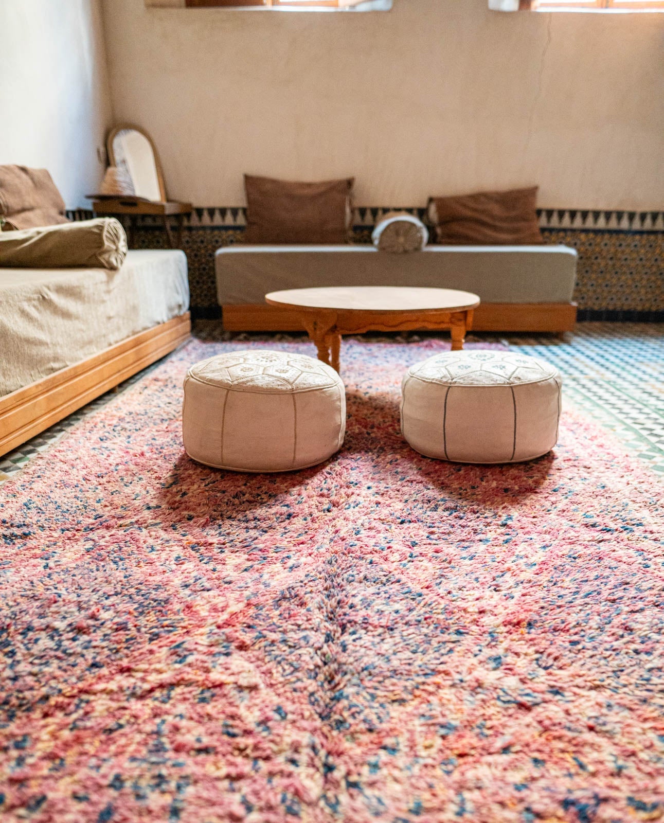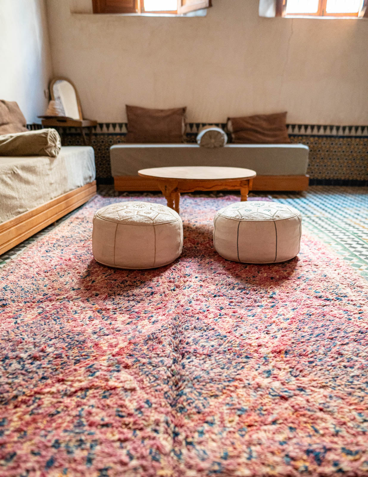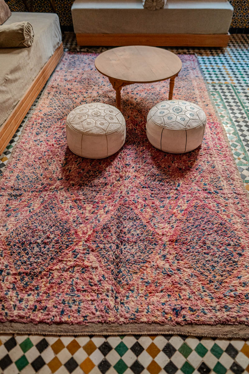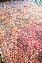 Aito marokkolainen vintage-matto Beni M’Guild -heimolta pehmeissä vaaleanpunaisen ja persikan sävyissä. Kaunis symmetrinen timanttikuvio on toteutettu hienovaraisesti sinisellä värillä sekä erilaisilla vaaleilla sävyillä. Harmoninen kokonaisuus, pehmeä kuin hattara!