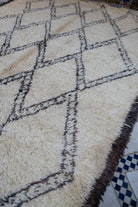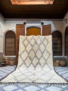 Tässä Beni Ouarain -matossa on ainutlaatuinen tunnelma, joka kutsuu viipymään. Siinä on kontrastia, asennetta ja sanatonta vetovoimaa. Uskomattoman laadukas matto. Hohtavan pehmeä ja eteerinen villa muodostaa eläväisen luonnonvaalean pohjan, johon on solmittu klassinen tuplatimanttikuvio paahdetun tummanruskealla, värjäämättömällä villalla. Reunoja kiertää yksinkertainen kehys. Maton painava tuntuma ja käsityön jälki huokuvat todellista luksuslaatua.