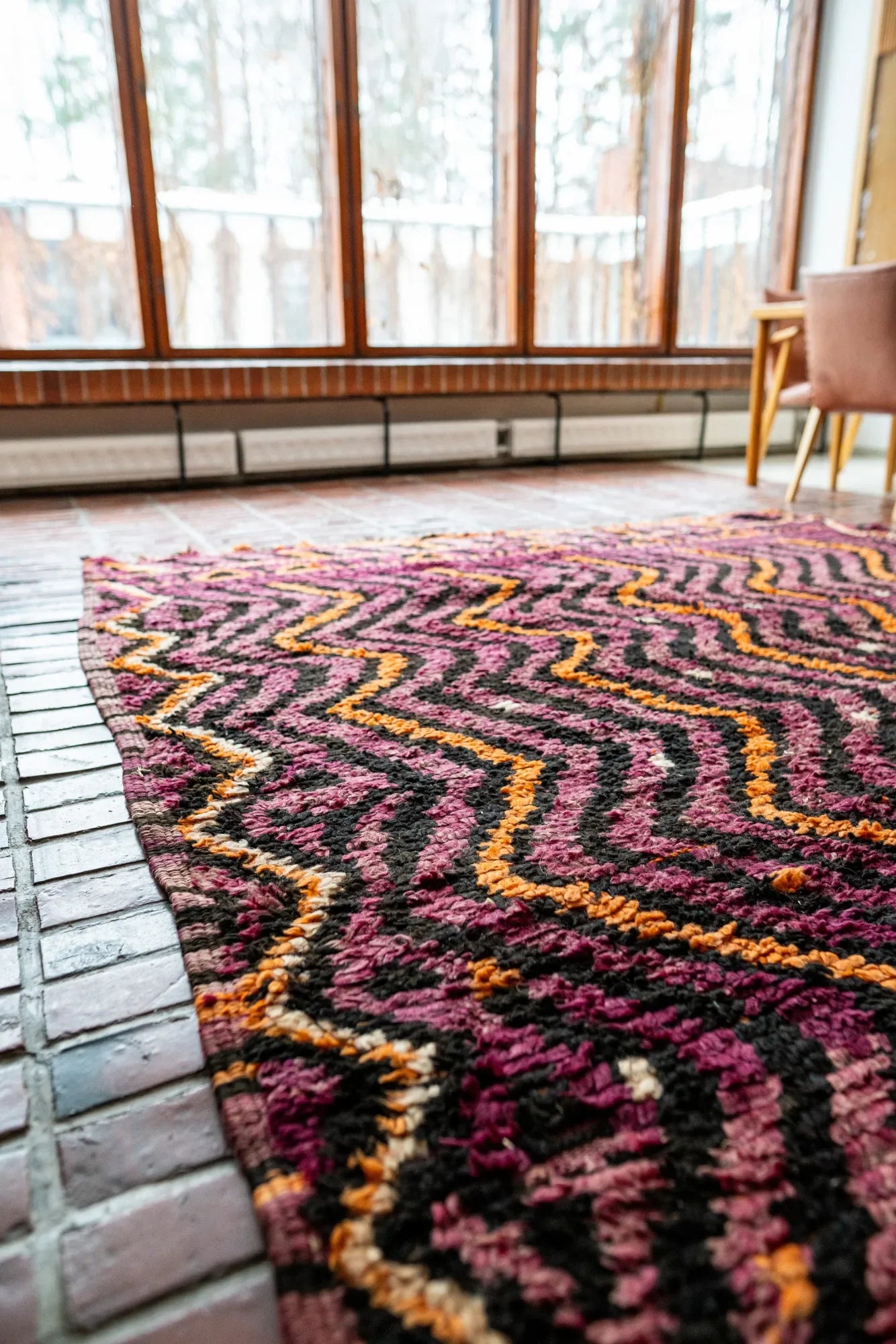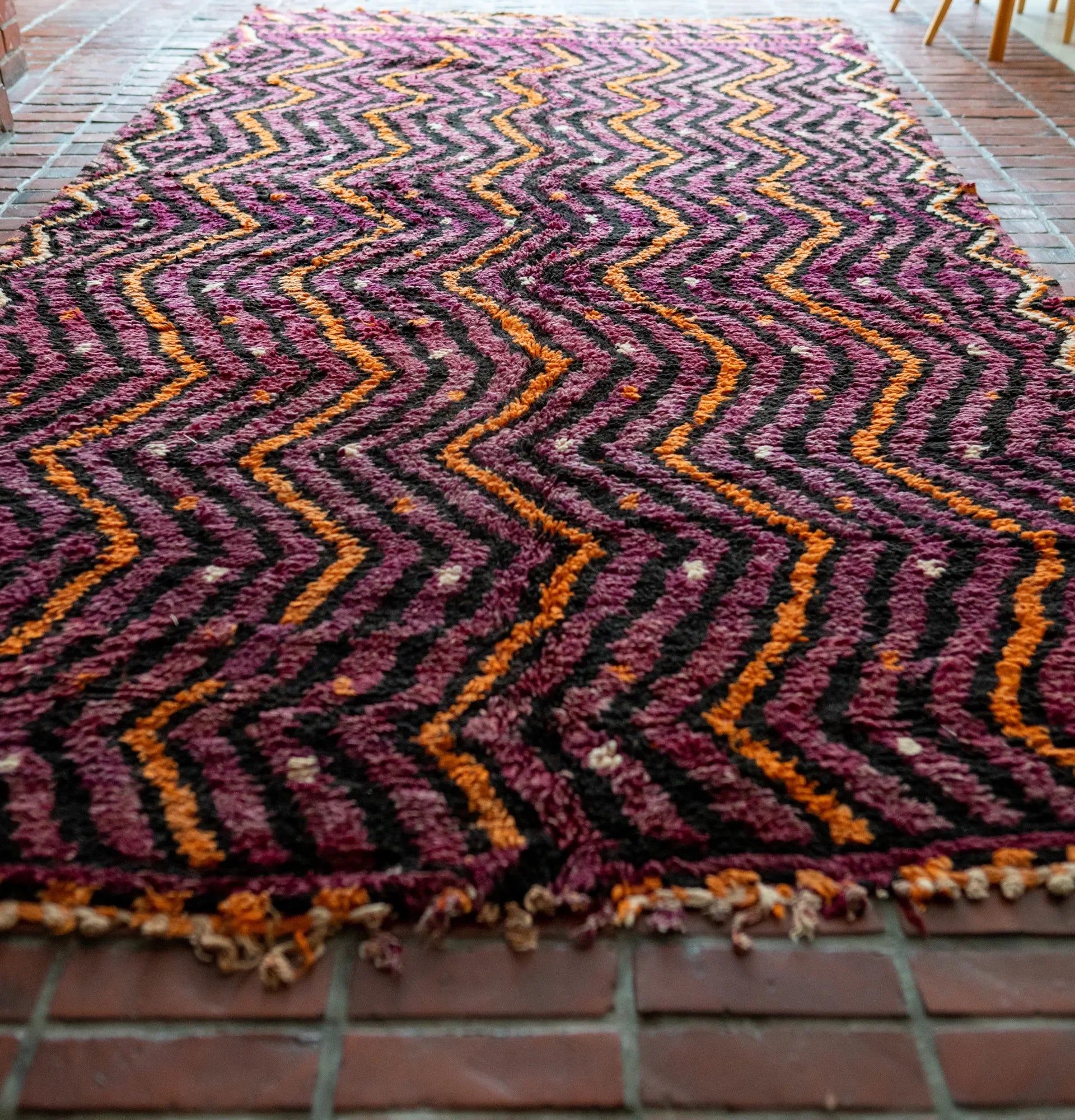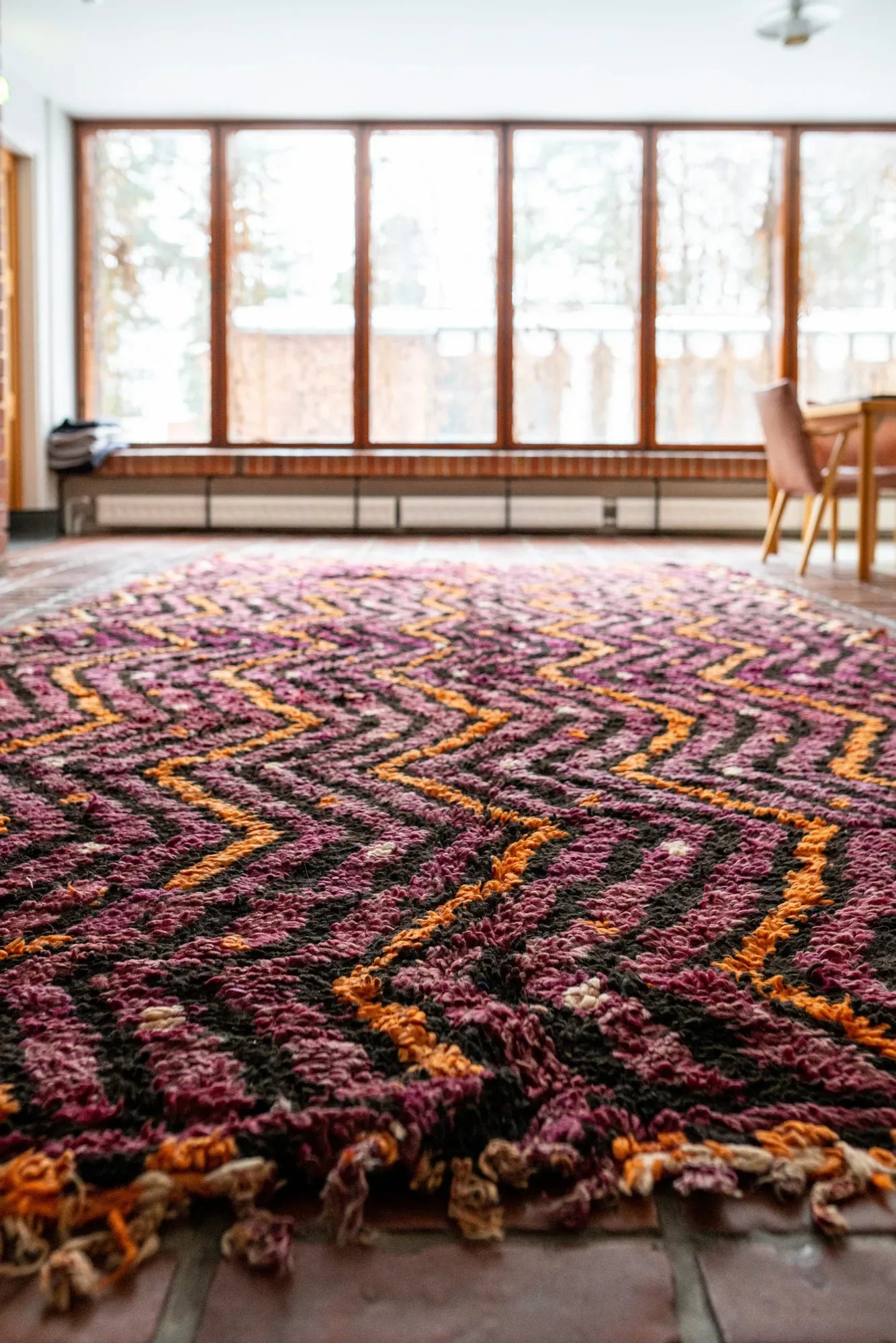 Ainutlaatuinen marokkolainen vintagematto Ait Tamassine -heimolta, vaikuttava yksilö niin värimaailmaltaan kuin kooltaankin. Lilan pohjan päällä kulkee näyttävä kuviointi oranssin, mustan ja luonnonvalkoisen sävyissä. Kokonaisuus on intensiivinen ja vangitseva, nimensä veroisesti todellinen taideteos.